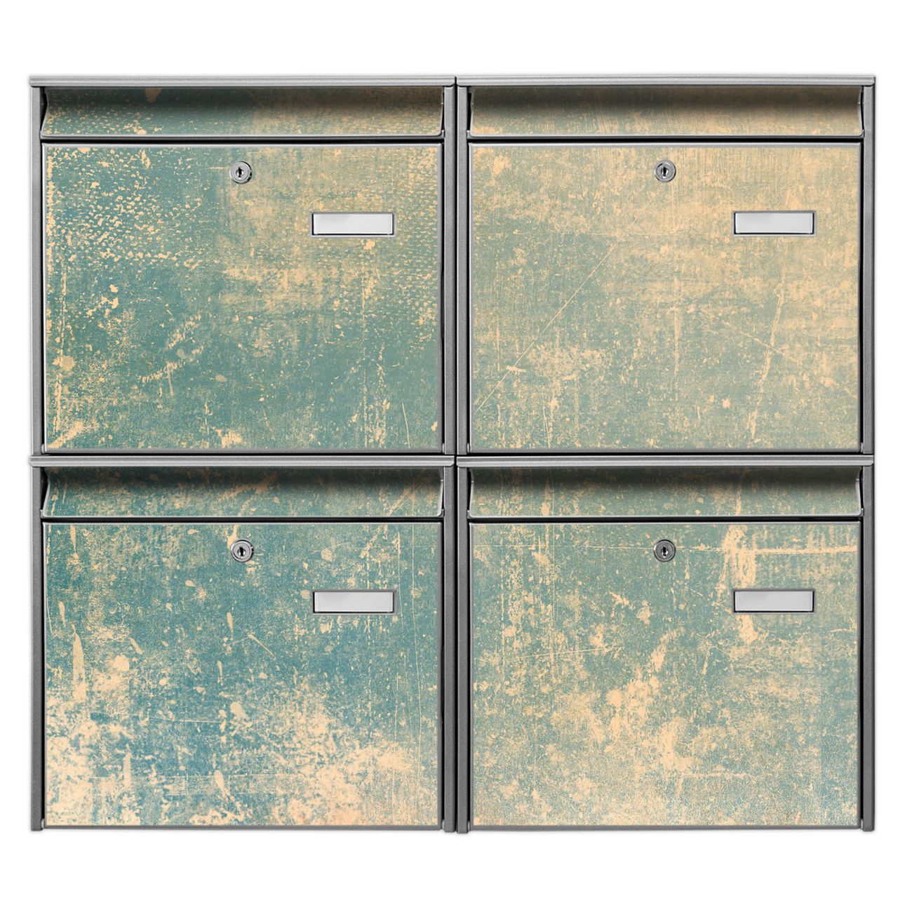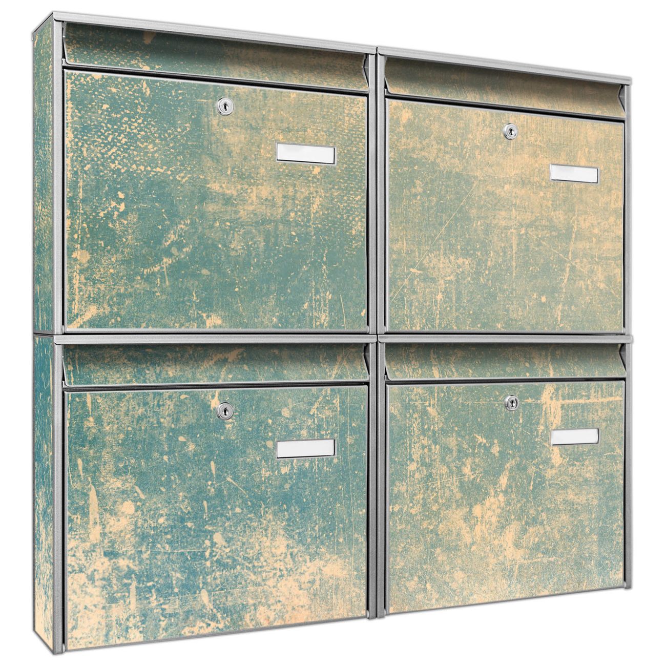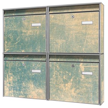 FUNKTION: Die Burg-Wächter Briefkastenanlage mit Motiv Patina Grün bietet Ihnen ausreichend Fassungsvermögen um auch A4 und C4 Sendungen zu empfangen. Das integrierte Namensschild lässt sich individuell beschriften. Wählen Sie aus den Grundfarben weiß, silber und schwarz. DESIGN: Die 4 Briefkästen haben ein ansprechendes und zeitloses Design, ohne dabei auf Funktionalität zu verzichten. Das Material ist sehr stabil, wetterfest und rostfrei. Durch das Motiv Patina Grün werden die Postkästen zu einem Blickfang. DETAILS: Die Postkästen bestehen aus verzinktem Stahl der zusätzlich mit Klarlack versiegelt wurde. Die Kästen sind gesamt 64,5cm hoch, 72,5cm breit und 10cm tief. Das Motiv besteht aus einer wetter- und UV-festen Folie, die Ihren Briefkasten zusätzlich vor Kratzern schützt. Die Postkästen werden mit Montagematerial, je einem Namensschild und je zwei Schlüsseln geliefert. NUTZEN: Das Briefkastenset eignet sich für die Wandmontage, die Größe bietet genügend Platz für Sendungen aller Art. Das zeitlose Design sowie die stabile Bauart bieten Ihnen einen treuen Begleiter für Ihre Post. BANJADO: