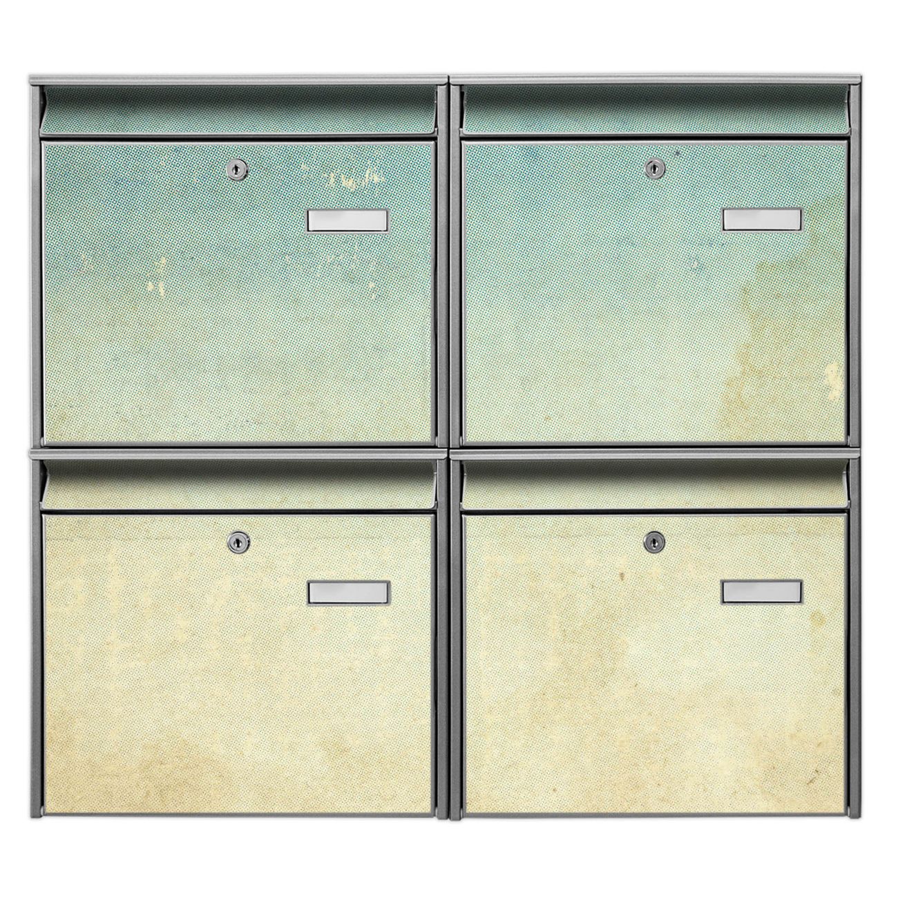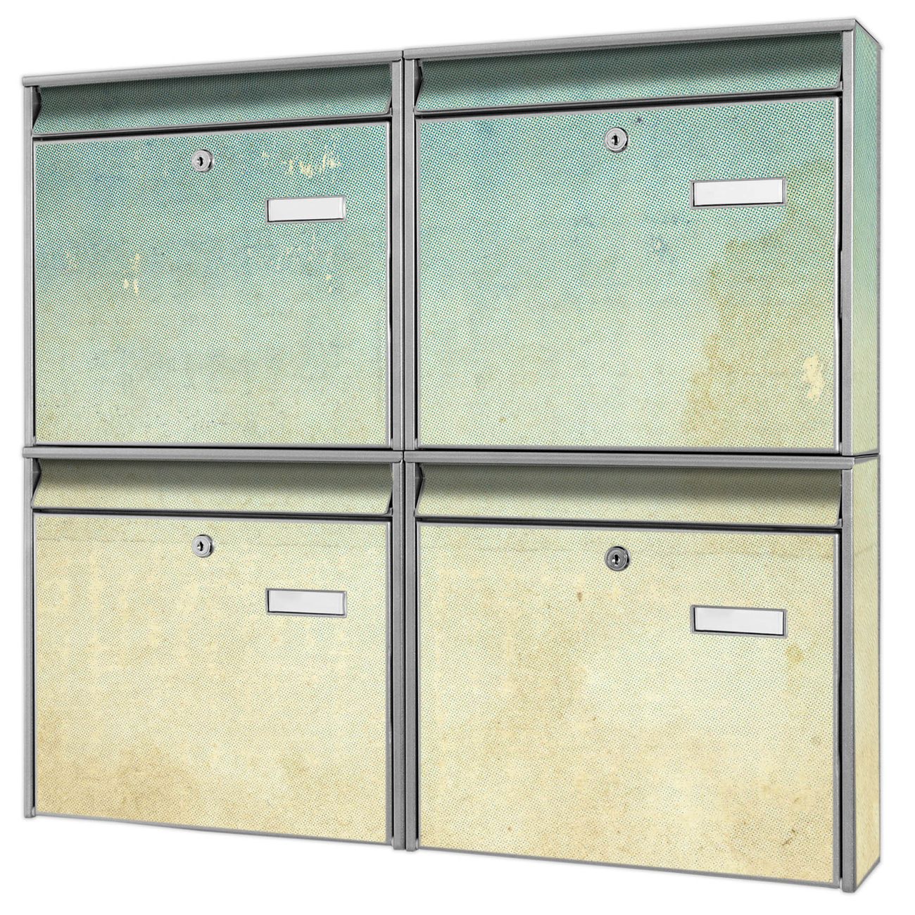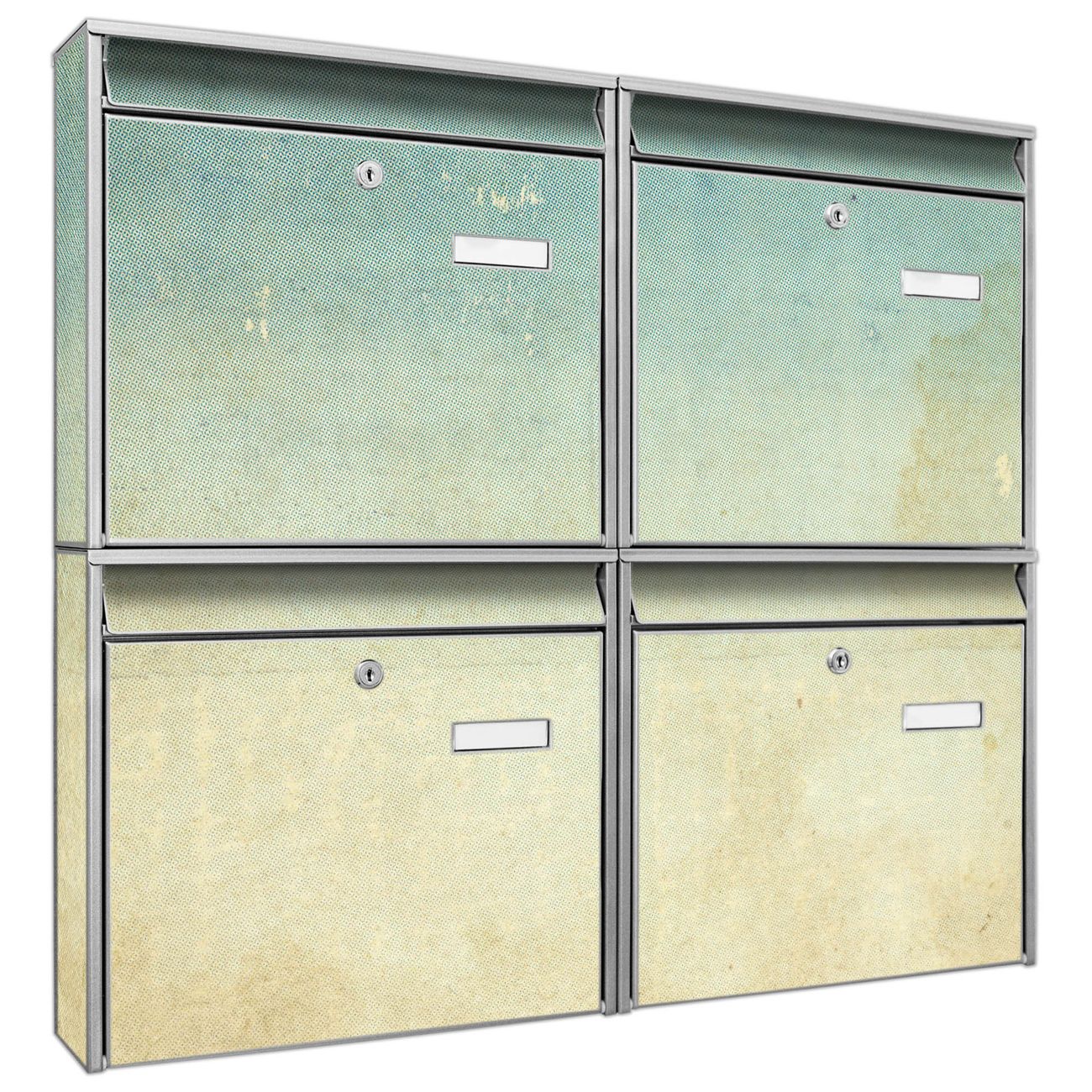 FUNKTION: Die Burg-Wächter Briefkastenanlage mit Motiv Patina Papier bietet Ihnen ausreichend Fassungsvermögen um auch A4 und C4 Sendungen zu empfangen. Das integrierte Namensschild lässt sich individuell beschriften. Wählen Sie aus den Grundfarben weiß, silber und schwarz. DESIGN: Die 4 Briefkästen haben ein ansprechendes und zeitloses Design, ohne dabei auf Funktionalität zu verzichten. Das Material ist sehr stabil, wetterfest und rostfrei. Durch das Motiv Patina Papier werden die Postkästen zu einem Blickfang. DETAILS: Die Postkästen bestehen aus verzinktem Stahl der zusätzlich mit Klarlack versiegelt wurde. Die Kästen sind gesamt 64,5cm hoch, 72,5cm breit und 10cm tief. Das Motiv besteht aus einer wetter- und UV-festen Folie, die Ihren Briefkasten zusätzlich vor Kratzern schützt. Die Postkästen werden mit Montagematerial, je einem Namensschild und je zwei Schlüsseln geliefert. NUTZEN: Das Briefkastenset eignet sich für die Wandmontage, die Größe bietet genügend Platz für Sendungen aller Art. Das zeitlose Design sowie die stabile Bauart bieten Ihnen einen treuen Begleiter für Ihre Post. BANJADO: