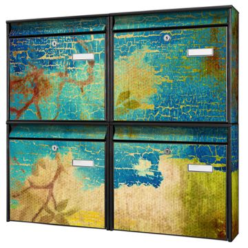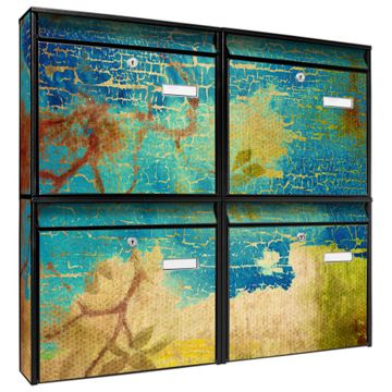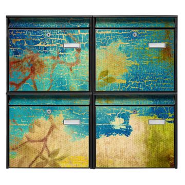 FUNKTION: Die Burg-Wächter Briefkastenanlage mit Motiv Patina bietet Ihnen ausreichend Fassungsvermögen um auch A4 und C4 Sendungen zu empfangen. Das integrierte Namensschild lässt sich individuell beschriften. Wählen Sie aus den Grundfarben weiß, silber und schwarz. DESIGN: Die 4 Briefkästen haben ein ansprechendes und zeitloses Design, ohne dabei auf Funktionalität zu verzichten. Das Material ist sehr stabil, wetterfest und rostfrei. Durch das Motiv Patina werden die Postkästen zu einem Blickfang. DETAILS: Die Postkästen bestehen aus verzinktem Stahl der zusätzlich mit Klarlack versiegelt wurde. Die Kästen sind gesamt 64,5cm hoch, 72,5cm breit und 10cm tief. Das Motiv besteht aus einer wetter- und UV-festen Folie, die Ihren Briefkasten zusätzlich vor Kratzern schützt. Die Postkästen werden mit Montagematerial, je einem Namensschild und je zwei Schlüsseln geliefert. NUTZEN: Das Briefkastenset eignet sich für die Wandmontage, die Größe bietet genügend Platz für Sendungen aller Art. Das zeitlose Design sowie die stabile Bauart bieten Ihnen einen treuen Begleiter für Ihre Post. BANJADO: