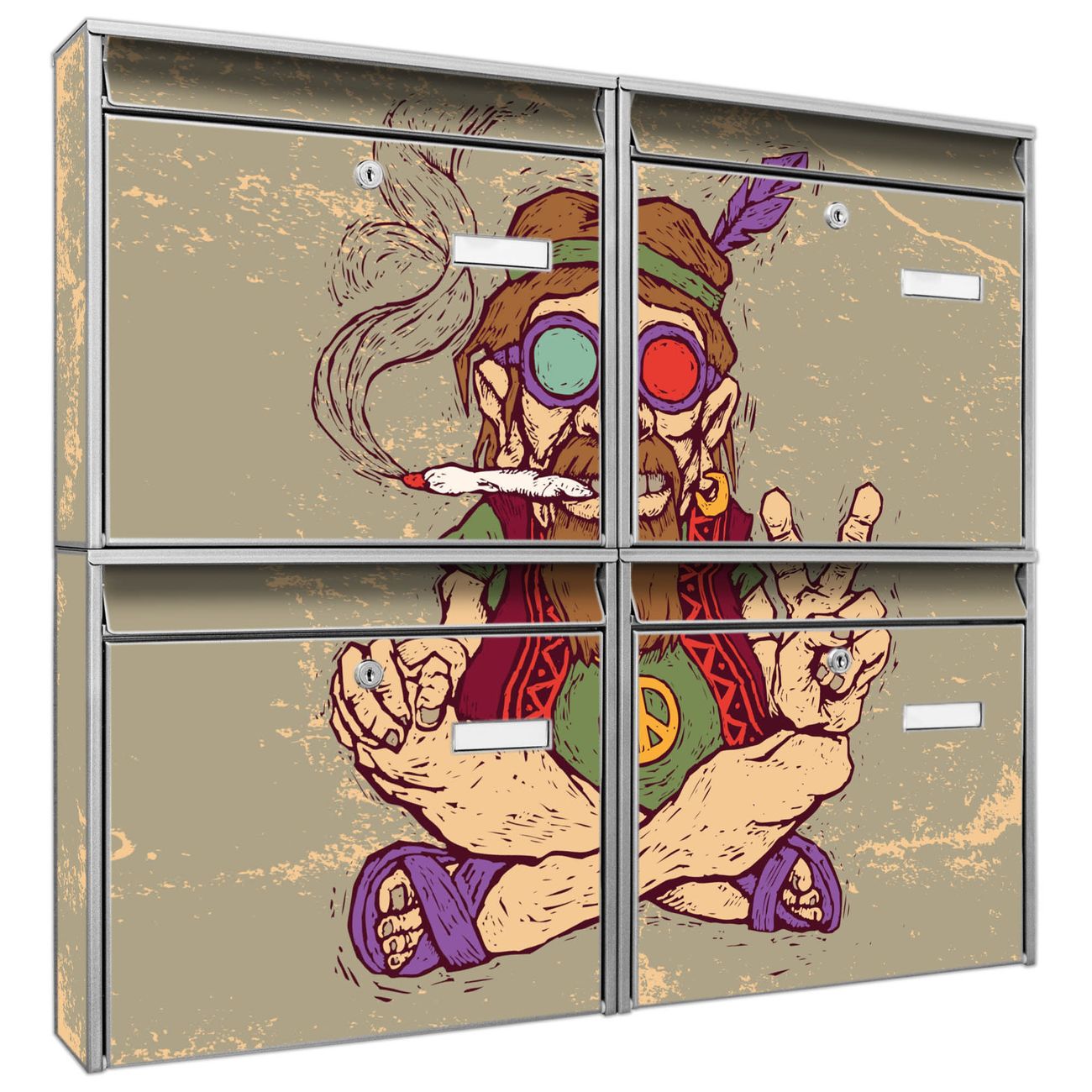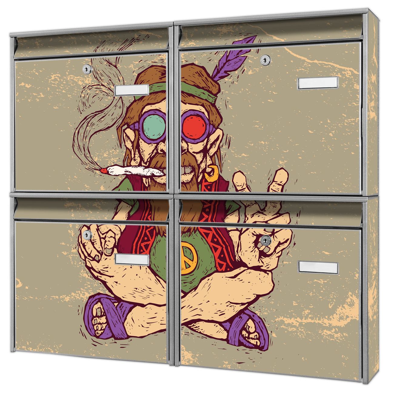 FUNKTION: Die Burg-Wächter Briefkastenanlage mit Motiv Peace bietet Ihnen ausreichend Fassungsvermögen um auch A4 und C4 Sendungen zu empfangen. Das integrierte Namensschild lässt sich individuell beschriften. Wählen Sie aus den Grundfarben weiß, silber und schwarz. DESIGN: Die 4 Briefkästen haben ein ansprechendes und zeitloses Design, ohne dabei auf Funktionalität zu verzichten. Das Material ist sehr stabil, wetterfest und rostfrei. Durch das Motiv Peace werden die Postkästen zu einem Blickfang. DETAILS: Die Postkästen bestehen aus verzinktem Stahl der zusätzlich mit Klarlack versiegelt wurde. Die Kästen sind gesamt 64,5cm hoch, 72,5cm breit und 10cm tief. Das Motiv besteht aus einer wetter- und UV-festen Folie, die Ihren Briefkasten zusätzlich vor Kratzern schützt. Die Postkästen werden mit Montagematerial, je einem Namensschild und je zwei Schlüsseln geliefert. NUTZEN: Das Briefkastenset eignet sich für die Wandmontage, die Größe bietet genügend Platz für Sendungen aller Art. Das zeitlose Design sowie die stabile Bauart bieten Ihnen einen treuen Begleiter für Ihre Post. BANJADO: