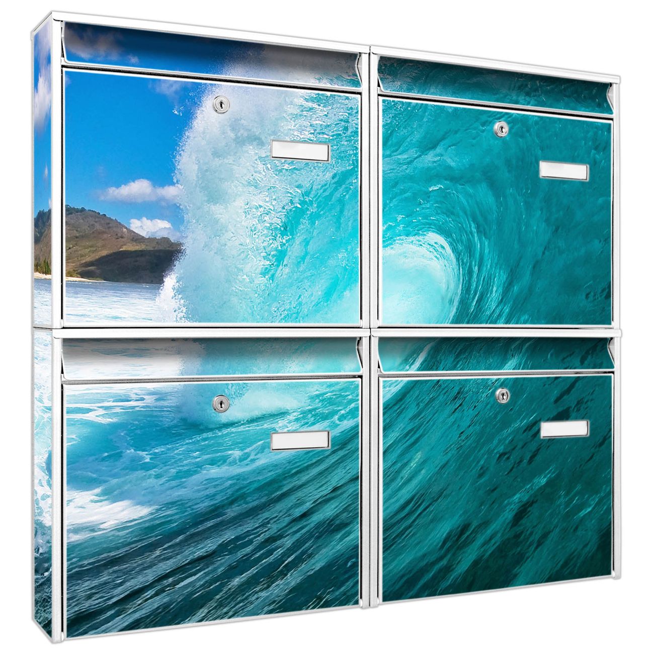 FUNKTION: Die Burg-Wächter Briefkastenanlage mit Motiv Perfekte Welle bietet Ihnen ausreichend Fassungsvermögen um auch A4 und C4 Sendungen zu empfangen. Das integrierte Namensschild lässt sich individuell beschriften. Wählen Sie aus den Grundfarben weiß, silber und schwarz. DESIGN: Die 4 Briefkästen haben ein ansprechendes und zeitloses Design, ohne dabei auf Funktionalität zu verzichten. Das Material ist sehr stabil, wetterfest und rostfrei. Durch das Motiv Perfekte Welle werden die Postkästen zu einem Blickfang. DETAILS: Die Postkästen bestehen aus verzinktem Stahl der zusätzlich mit Klarlack versiegelt wurde. Die Kästen sind gesamt 64,5cm hoch, 72,5cm breit und 10cm tief. Das Motiv besteht aus einer wetter- und UV-festen Folie, die Ihren Briefkasten zusätzlich vor Kratzern schützt. Die Postkästen werden mit Montagematerial, je einem Namensschild und je zwei Schlüsseln geliefert. NUTZEN: Das Briefkastenset eignet sich für die Wandmontage, die Größe bietet genügend Platz für Sendungen aller Art. Das zeitlose Design sowie die stabile Bauart bieten Ihnen einen treuen Begleiter für Ihre Post. BANJADO: