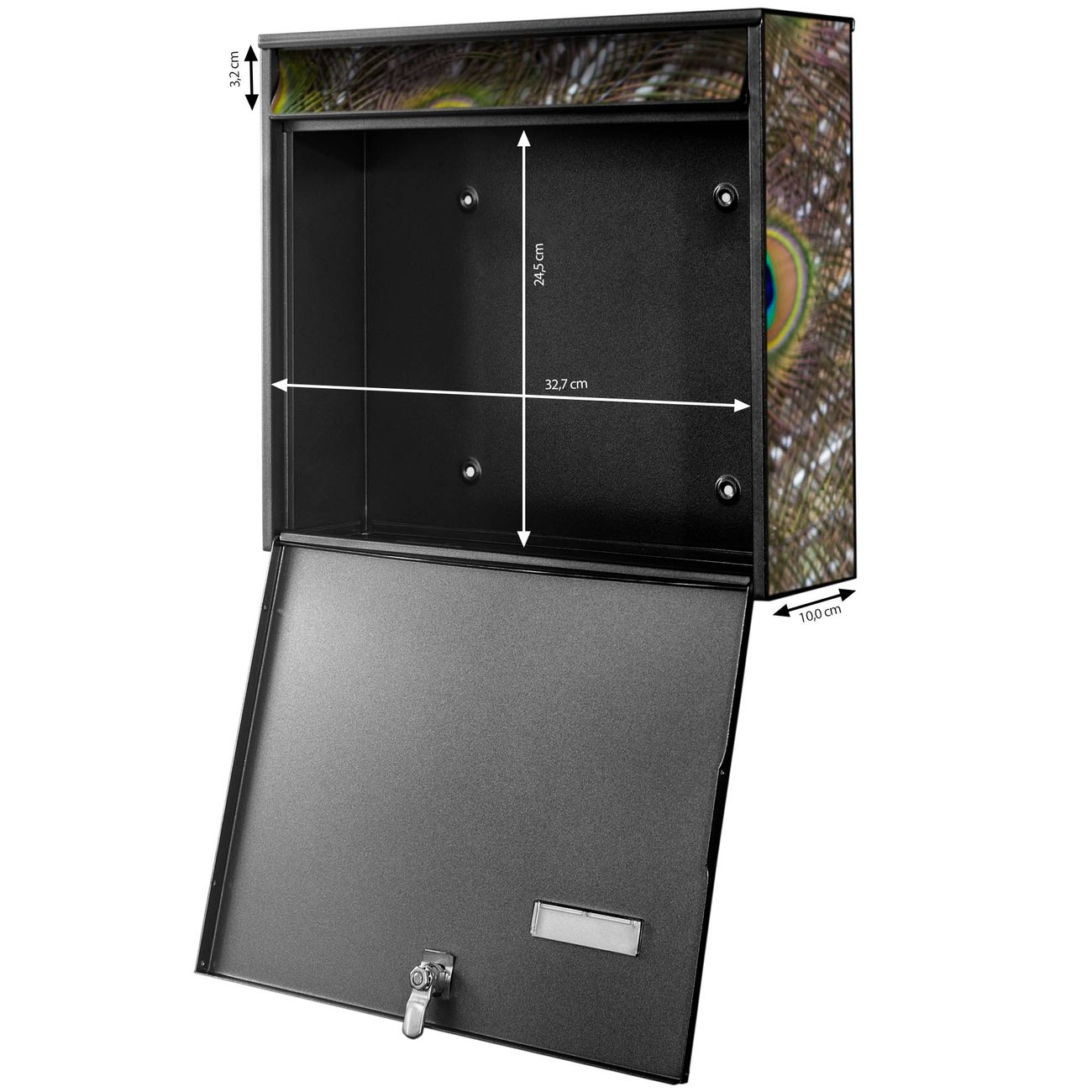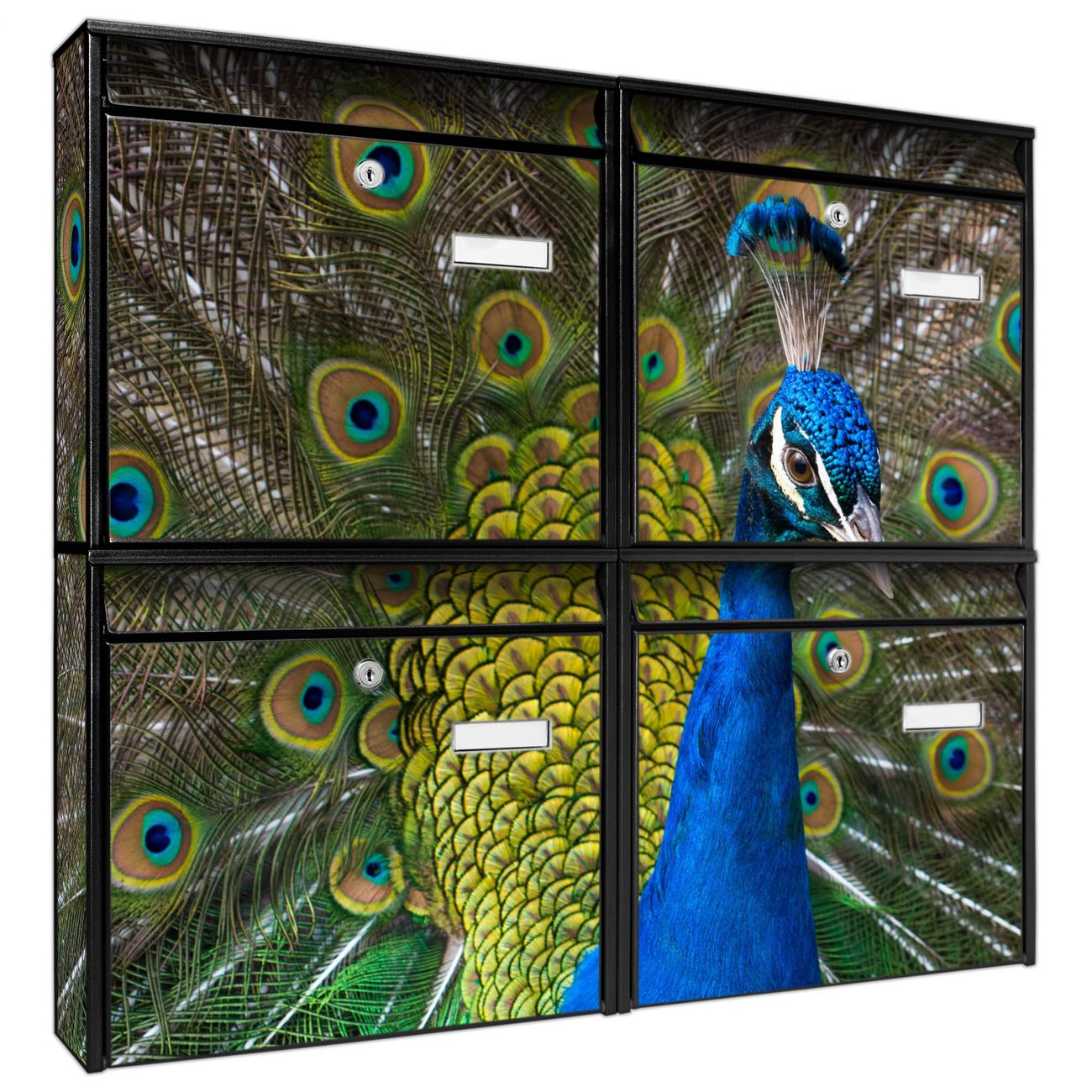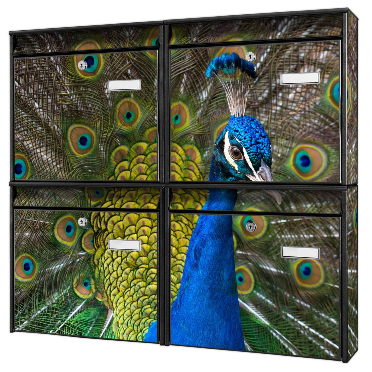 FUNKTION: Die Burg-Wächter Briefkastenanlage mit Motiv Pfau bietet Ihnen ausreichend Fassungsvermögen um auch A4 und C4 Sendungen zu empfangen. Das integrierte Namensschild lässt sich individuell beschriften. Wählen Sie aus den Grundfarben weiß, silber und schwarz. DESIGN: Die 4 Briefkästen haben ein ansprechendes und zeitloses Design, ohne dabei auf Funktionalität zu verzichten. Das Material ist sehr stabil, wetterfest und rostfrei. Durch das Motiv Pfau werden die Postkästen zu einem Blickfang. DETAILS: Die Postkästen bestehen aus verzinktem Stahl der zusätzlich mit Klarlack versiegelt wurde. Die Kästen sind gesamt 64,5cm hoch, 72,5cm breit und 10cm tief. Das Motiv besteht aus einer wetter- und UV-festen Folie, die Ihren Briefkasten zusätzlich vor Kratzern schützt. Die Postkästen werden mit Montagematerial, je einem Namensschild und je zwei Schlüsseln geliefert. NUTZEN: Das Briefkastenset eignet sich für die Wandmontage, die Größe bietet genügend Platz für Sendungen aller Art. Das zeitlose Design sowie die stabile Bauart bieten Ihnen einen treuen Begleiter für Ihre Post. BANJADO: