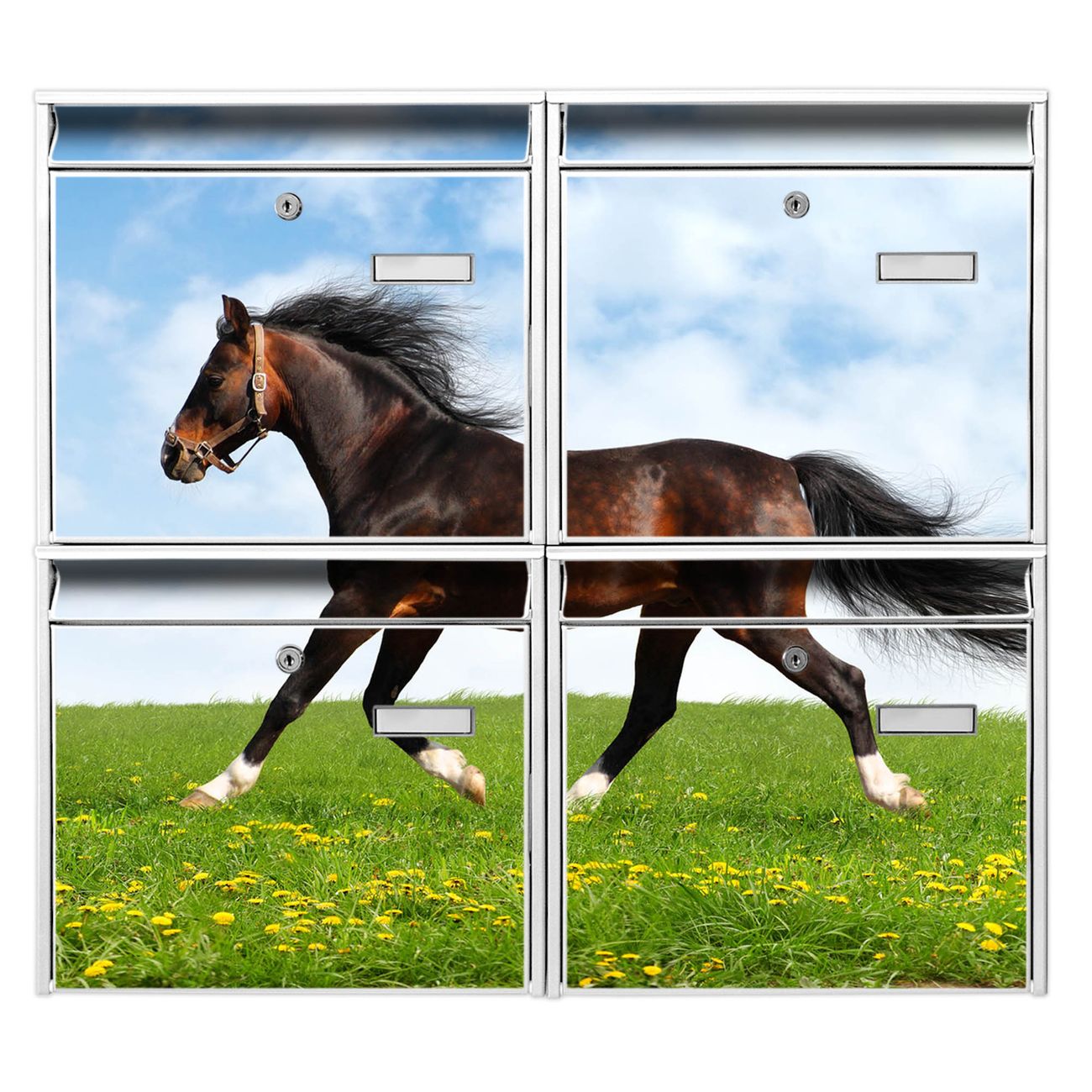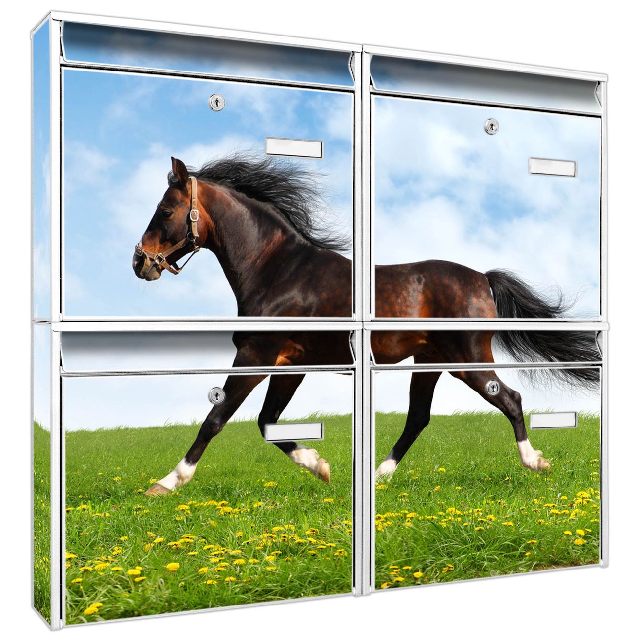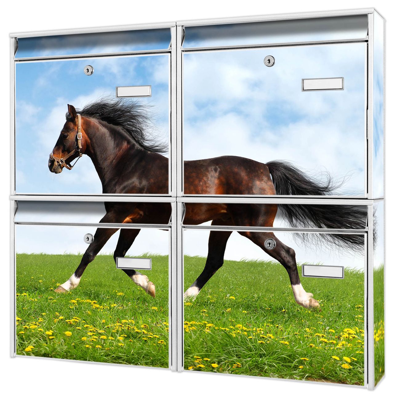 FUNKTION: Die Burg-Wächter Briefkastenanlage mit Motiv Pferd bietet Ihnen ausreichend Fassungsvermögen um auch A4 und C4 Sendungen zu empfangen. Das integrierte Namensschild lässt sich individuell beschriften. Wählen Sie aus den Grundfarben weiß, silber und schwarz. DESIGN: Die 4 Briefkästen haben ein ansprechendes und zeitloses Design, ohne dabei auf Funktionalität zu verzichten. Das Material ist sehr stabil, wetterfest und rostfrei. Durch das Motiv Pferd werden die Postkästen zu einem Blickfang. DETAILS: Die Postkästen bestehen aus verzinktem Stahl der zusätzlich mit Klarlack versiegelt wurde. Die Kästen sind gesamt 64,5cm hoch, 72,5cm breit und 10cm tief. Das Motiv besteht aus einer wetter- und UV-festen Folie, die Ihren Briefkasten zusätzlich vor Kratzern schützt. Die Postkästen werden mit Montagematerial, je einem Namensschild und je zwei Schlüsseln geliefert. NUTZEN: Das Briefkastenset eignet sich für die Wandmontage, die Größe bietet genügend Platz für Sendungen aller Art. Das zeitlose Design sowie die stabile Bauart bieten Ihnen einen treuen Begleiter für Ihre Post. BANJADO: