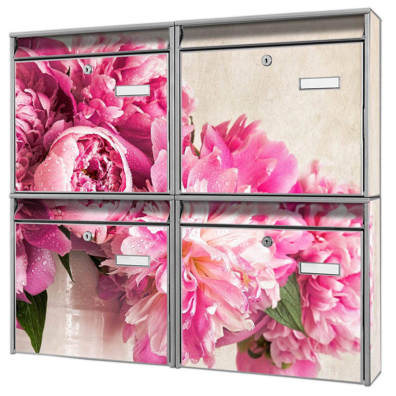 FUNKTION: Die Burg-Wächter Briefkastenanlage mit Motiv Pfingstrose bietet Ihnen ausreichend Fassungsvermögen um auch A4 und C4 Sendungen zu empfangen. Das integrierte Namensschild lässt sich individuell beschriften. Wählen Sie aus den Grundfarben weiß, silber und schwarz. DESIGN: Die 4 Briefkästen haben ein ansprechendes und zeitloses Design, ohne dabei auf Funktionalität zu verzichten. Das Material ist sehr stabil, wetterfest und rostfrei. Durch das Motiv Pfingstrose werden die Postkästen zu einem Blickfang. DETAILS: Die Postkästen bestehen aus verzinktem Stahl der zusätzlich mit Klarlack versiegelt wurde. Die Kästen sind gesamt 64,5cm hoch, 72,5cm breit und 10cm tief. Das Motiv besteht aus einer wetter- und UV-festen Folie, die Ihren Briefkasten zusätzlich vor Kratzern schützt. Die Postkästen werden mit Montagematerial, je einem Namensschild und je zwei Schlüsseln geliefert. NUTZEN: Das Briefkastenset eignet sich für die Wandmontage, die Größe bietet genügend Platz für Sendungen aller Art. Das zeitlose Design sowie die stabile Bauart bieten Ihnen einen treuen Begleiter für Ihre Post. BANJADO: