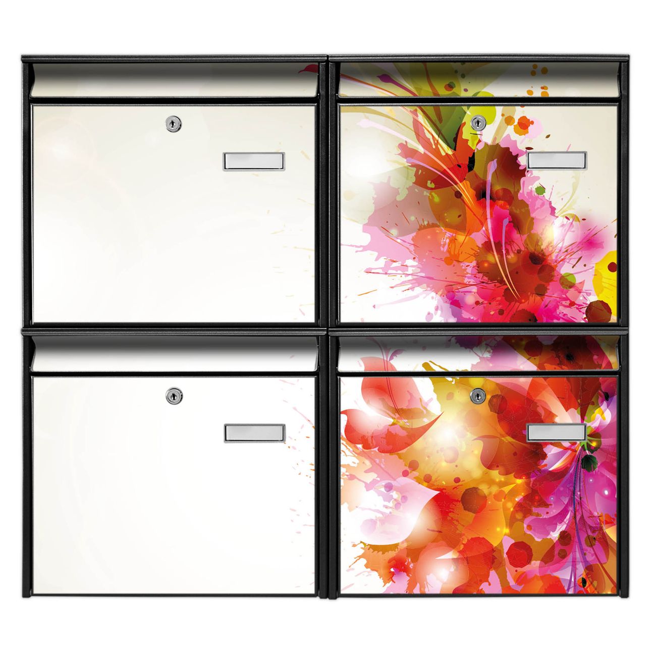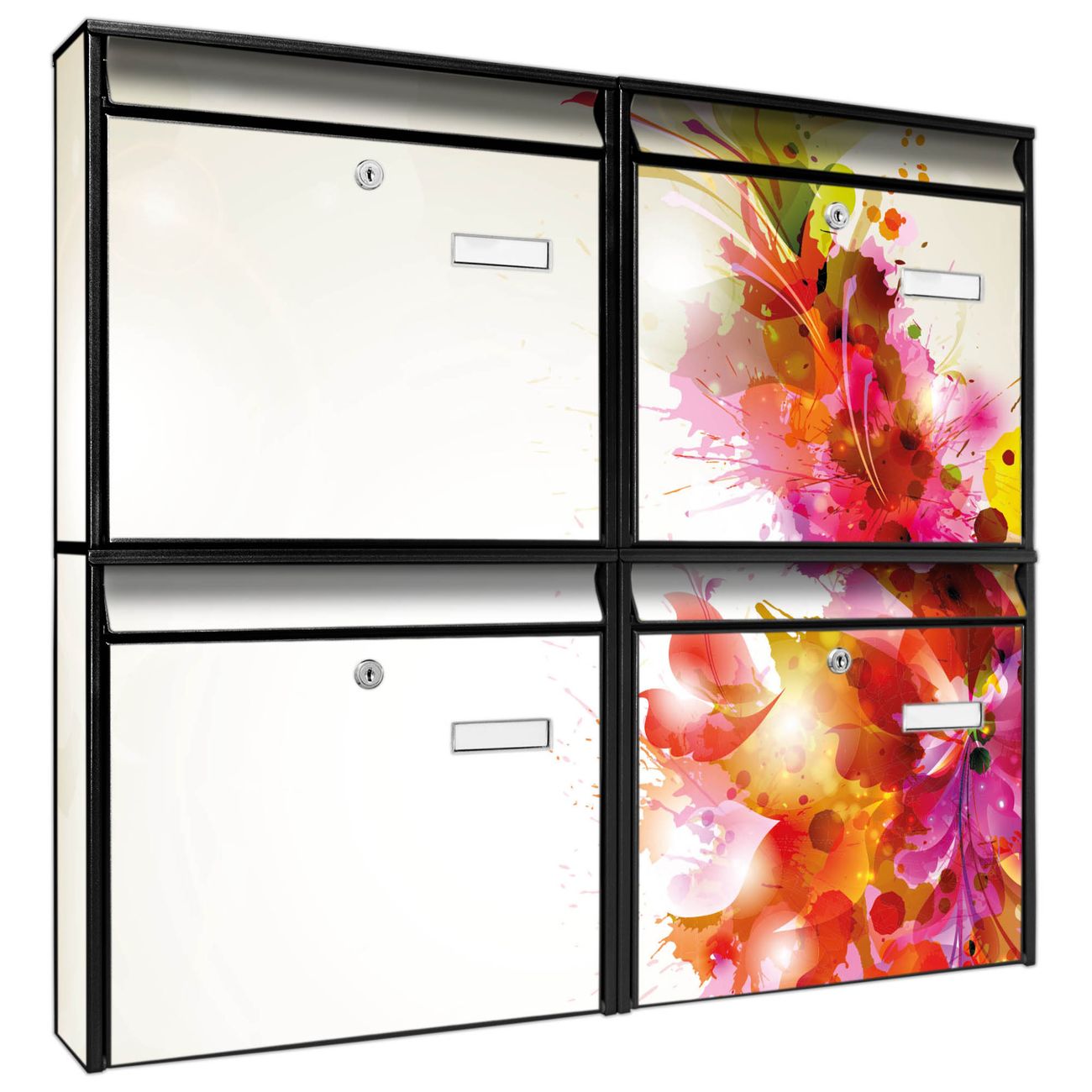 FUNKTION: Die Burg-Wächter Briefkastenanlage mit Motiv Pink Explosion bietet Ihnen ausreichend Fassungsvermögen um auch A4 und C4 Sendungen zu empfangen. Das integrierte Namensschild lässt sich individuell beschriften. Wählen Sie aus den Grundfarben weiß, silber und schwarz. DESIGN: Die 4 Briefkästen haben ein ansprechendes und zeitloses Design, ohne dabei auf Funktionalität zu verzichten. Das Material ist sehr stabil, wetterfest und rostfrei. Durch das Motiv Pink Explosion werden die Postkästen zu einem Blickfang. DETAILS: Die Postkästen bestehen aus verzinktem Stahl der zusätzlich mit Klarlack versiegelt wurde. Die Kästen sind gesamt 64,5cm hoch, 72,5cm breit und 10cm tief. Das Motiv besteht aus einer wetter- und UV-festen Folie, die Ihren Briefkasten zusätzlich vor Kratzern schützt. Die Postkästen werden mit Montagematerial, je einem Namensschild und je zwei Schlüsseln geliefert. NUTZEN: Das Briefkastenset eignet sich für die Wandmontage, die Größe bietet genügend Platz für Sendungen aller Art. Das zeitlose Design sowie die stabile Bauart bieten Ihnen einen treuen Begleiter für Ihre Post. BANJADO: