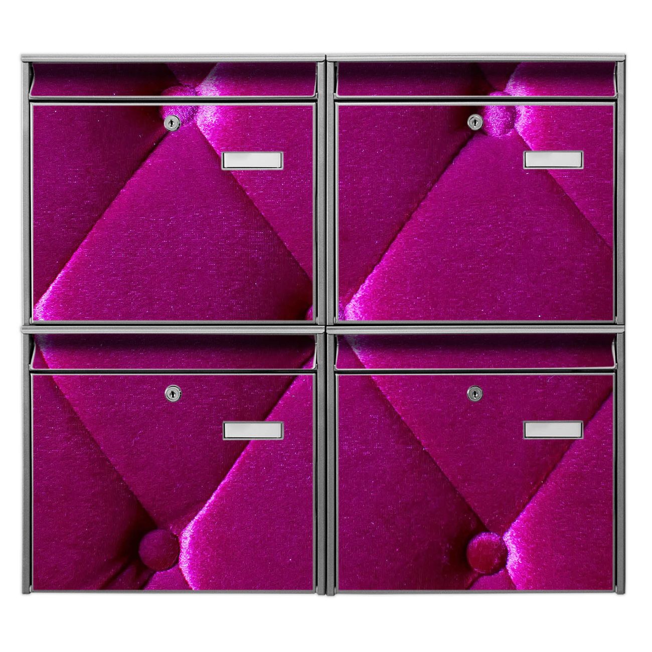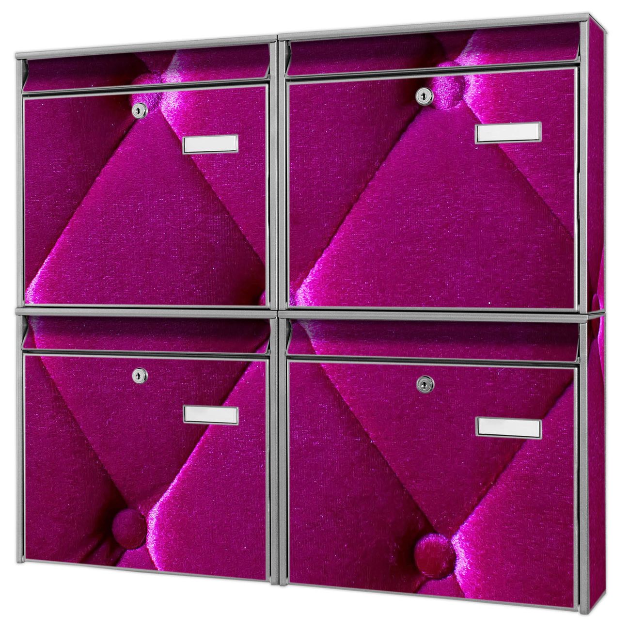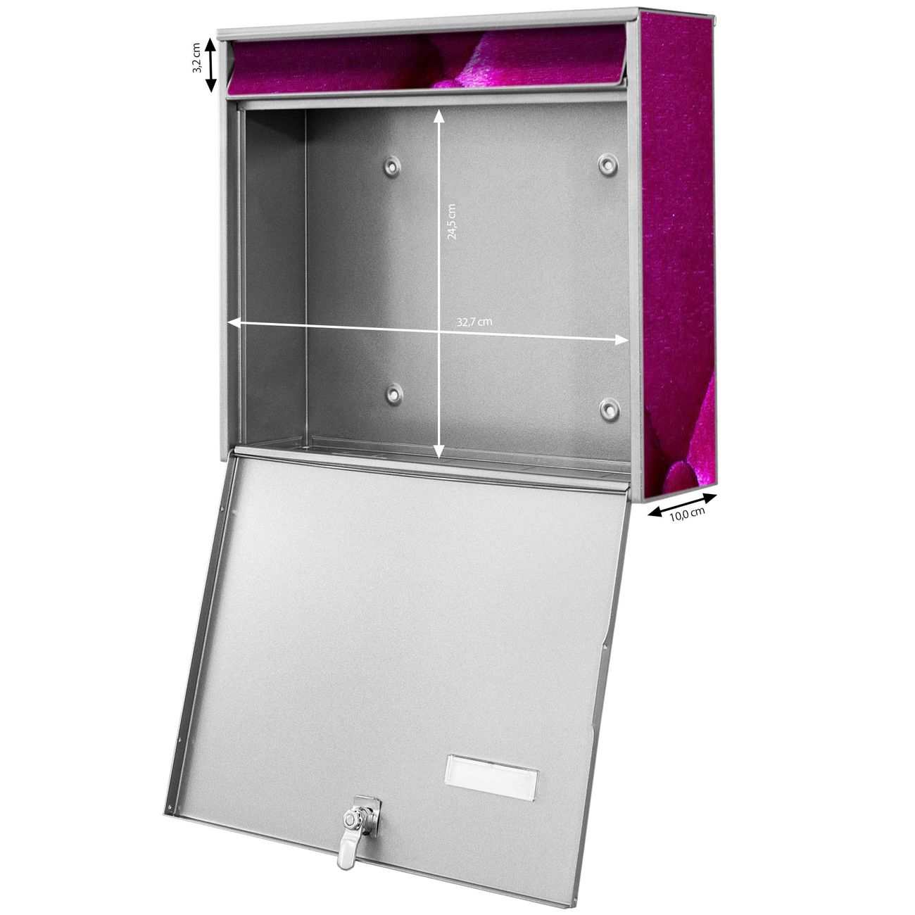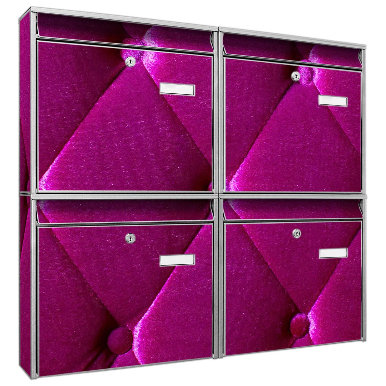 FUNKTION: Die Burg-Wächter Briefkastenanlage mit Motiv Pink Polster bietet Ihnen ausreichend Fassungsvermögen um auch A4 und C4 Sendungen zu empfangen. Das integrierte Namensschild lässt sich individuell beschriften. Wählen Sie aus den Grundfarben weiß, silber und schwarz. DESIGN: Die 4 Briefkästen haben ein ansprechendes und zeitloses Design, ohne dabei auf Funktionalität zu verzichten. Das Material ist sehr stabil, wetterfest und rostfrei. Durch das Motiv Pink Polster werden die Postkästen zu einem Blickfang. DETAILS: Die Postkästen bestehen aus verzinktem Stahl der zusätzlich mit Klarlack versiegelt wurde. Die Kästen sind gesamt 64,5cm hoch, 72,5cm breit und 10cm tief. Das Motiv besteht aus einer wetter- und UV-festen Folie, die Ihren Briefkasten zusätzlich vor Kratzern schützt. Die Postkästen werden mit Montagematerial, je einem Namensschild und je zwei Schlüsseln geliefert. NUTZEN: Das Briefkastenset eignet sich für die Wandmontage, die Größe bietet genügend Platz für Sendungen aller Art. Das zeitlose Design sowie die stabile Bauart bieten Ihnen einen treuen Begleiter für Ihre Post. BANJADO: