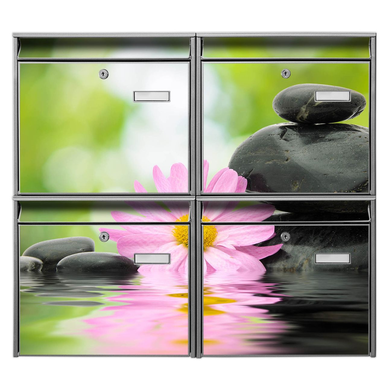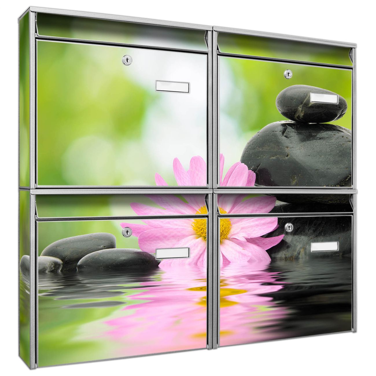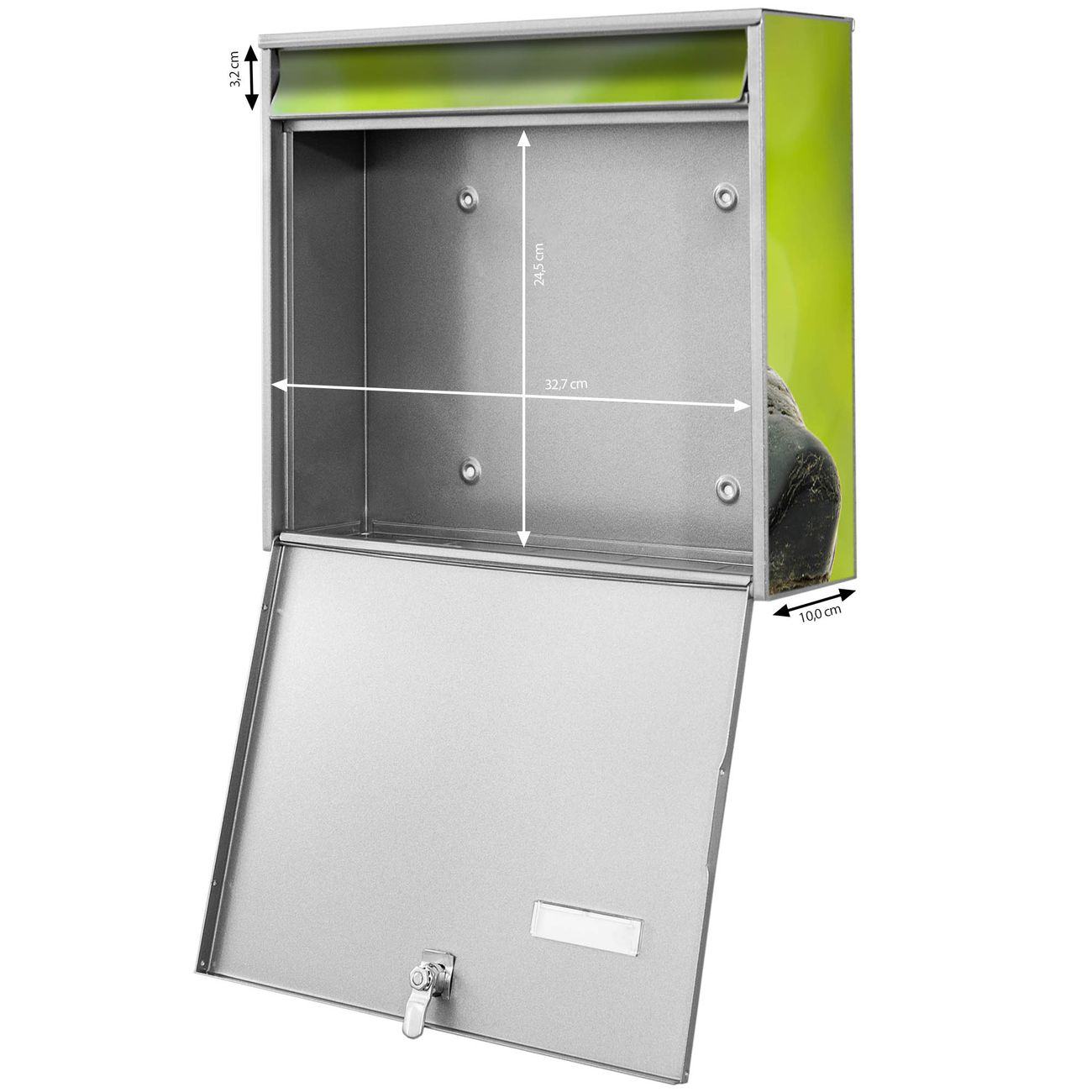 FUNKTION: Die Burg-Wächter Briefkastenanlage mit Motiv Steine & Relax 2 bietet Ihnen ausreichend Fassungsvermögen um auch A4 und C4 Sendungen zu empfangen. Das integrierte Namensschild lässt sich individuell beschriften. Wählen Sie aus den Grundfarben weiß, silber und schwarz. DESIGN: Die 4 Briefkästen haben ein ansprechendes und zeitloses Design, ohne dabei auf Funktionalität zu verzichten. Das Material ist sehr stabil, wetterfest und rostfrei. Durch das Motiv Steine & Relax 2 werden die Postkästen zu einem Blickfang. DETAILS: Die Postkästen bestehen aus verzinktem Stahl der zusätzlich mit Klarlack versiegelt wurde. Die Kästen sind gesamt 64,5cm hoch, 72,5cm breit und 10cm tief. Das Motiv besteht aus einer wetter- und UV-festen Folie, die Ihren Briefkasten zusätzlich vor Kratzern schützt. Die Postkästen werden mit Montagematerial, je einem Namensschild und je zwei Schlüsseln geliefert. NUTZEN: Das Briefkastenset eignet sich für die Wandmontage, die Größe bietet genügend Platz für Sendungen aller Art. Das zeitlose Design sowie die stabile Bauart bieten Ihnen einen treuen Begleiter für Ihre Post. BANJADO: