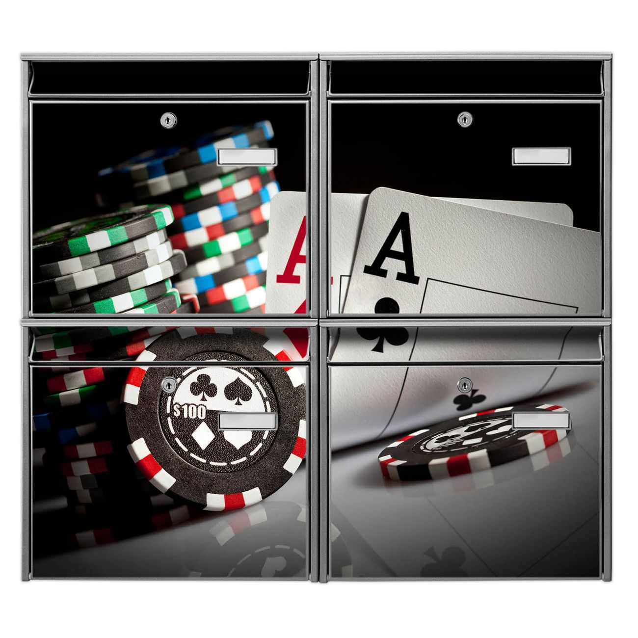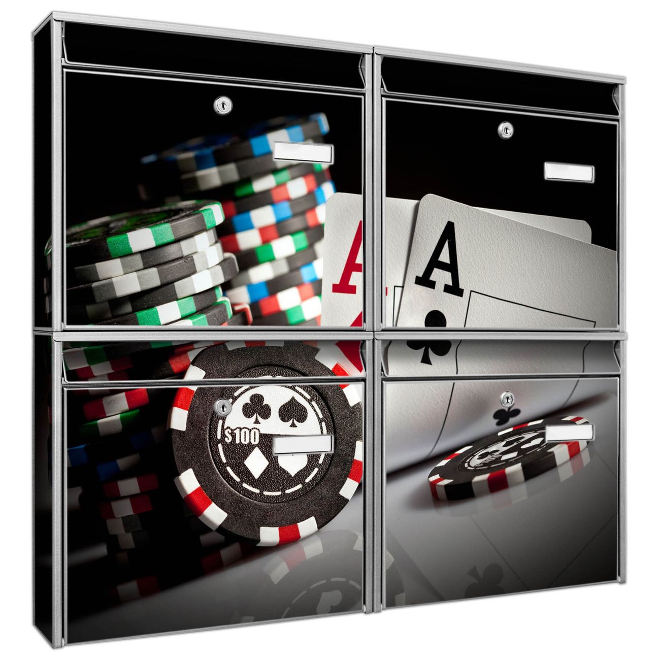 FUNKTION: Die Burg-Wächter Briefkastenanlage mit Motiv Poker bietet Ihnen ausreichend Fassungsvermögen um auch A4 und C4 Sendungen zu empfangen. Das integrierte Namensschild lässt sich individuell beschriften. Wählen Sie aus den Grundfarben weiß, silber und schwarz. DESIGN: Die 4 Briefkästen haben ein ansprechendes und zeitloses Design, ohne dabei auf Funktionalität zu verzichten. Das Material ist sehr stabil, wetterfest und rostfrei. Durch das Motiv Poker werden die Postkästen zu einem Blickfang. DETAILS: Die Postkästen bestehen aus verzinktem Stahl der zusätzlich mit Klarlack versiegelt wurde. Die Kästen sind gesamt 64,5cm hoch, 72,5cm breit und 10cm tief. Das Motiv besteht aus einer wetter- und UV-festen Folie, die Ihren Briefkasten zusätzlich vor Kratzern schützt. Die Postkästen werden mit Montagematerial, je einem Namensschild und je zwei Schlüsseln geliefert. NUTZEN: Das Briefkastenset eignet sich für die Wandmontage, die Größe bietet genügend Platz für Sendungen aller Art. Das zeitlose Design sowie die stabile Bauart bieten Ihnen einen treuen Begleiter für Ihre Post. BANJADO: