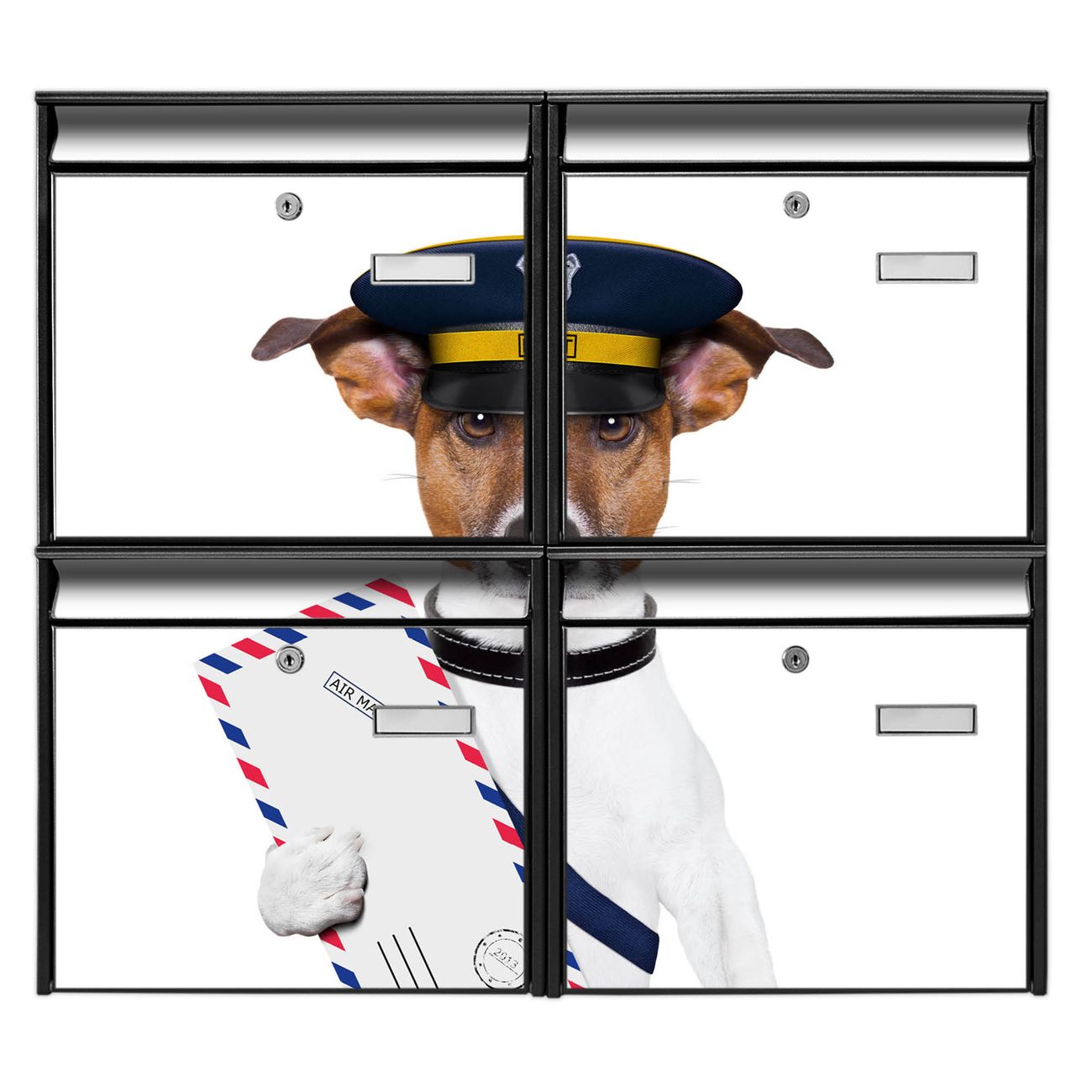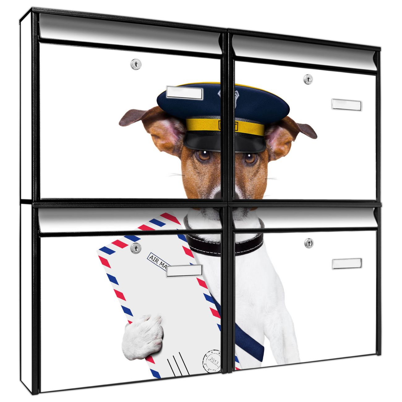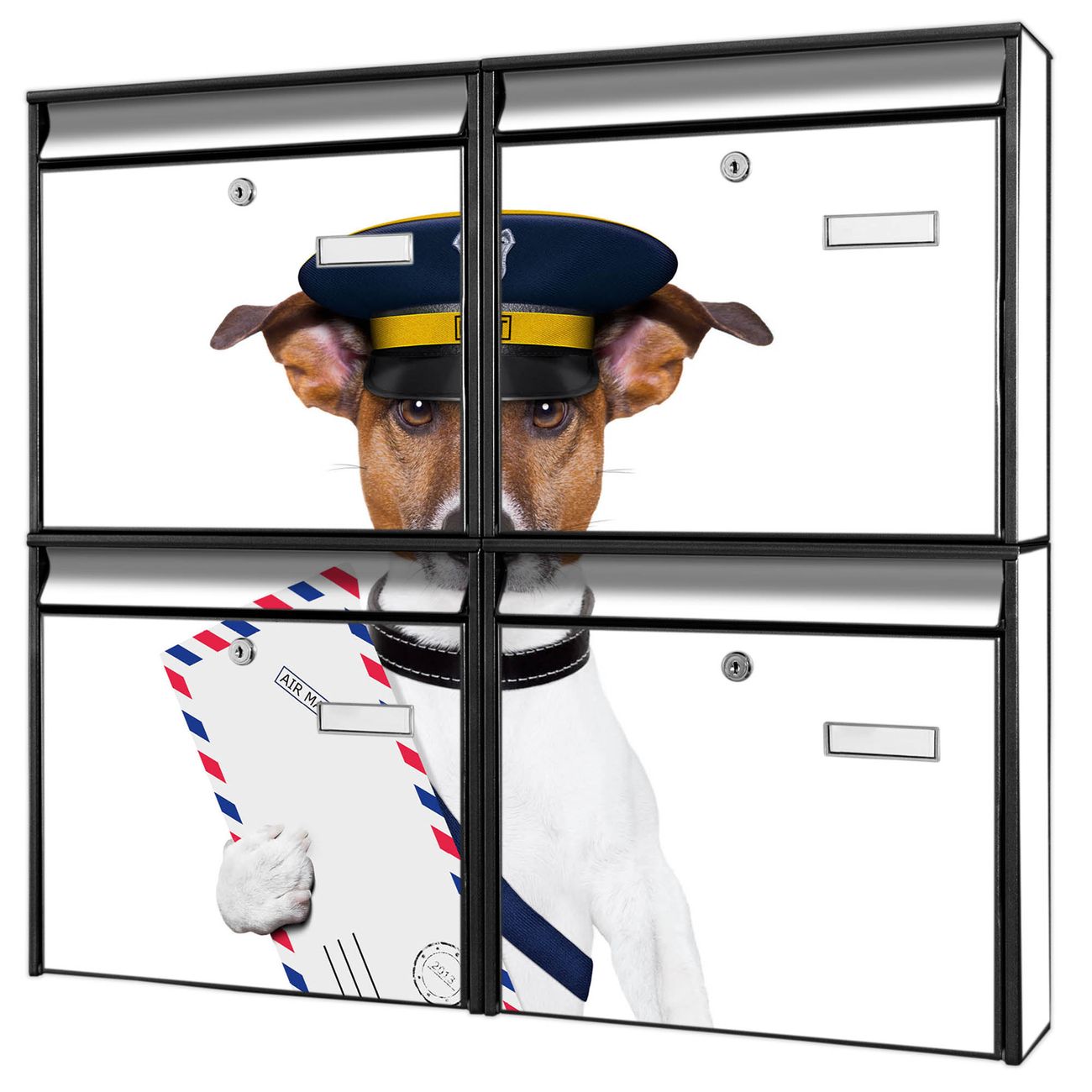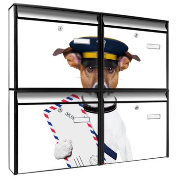 FUNKTION: Die Burg-Wächter Briefkastenanlage mit Motiv Postbote Jack Russel bietet Ihnen ausreichend Fassungsvermögen um auch A4 und C4 Sendungen zu empfangen. Das integrierte Namensschild lässt sich individuell beschriften. Wählen Sie aus den Grundfarben weiß, silber und schwarz. DESIGN: Die 4 Briefkästen haben ein ansprechendes und zeitloses Design, ohne dabei auf Funktionalität zu verzichten. Das Material ist sehr stabil, wetterfest und rostfrei. Durch das Motiv Postbote Jack Russel werden die Postkästen zu einem Blickfang. DETAILS: Die Postkästen bestehen aus verzinktem Stahl der zusätzlich mit Klarlack versiegelt wurde. Die Kästen sind gesamt 64,5cm hoch, 72,5cm breit und 10cm tief. Das Motiv besteht aus einer wetter- und UV-festen Folie, die Ihren Briefkasten zusätzlich vor Kratzern schützt. Die Postkästen werden mit Montagematerial, je einem Namensschild und je zwei Schlüsseln geliefert. NUTZEN: Das Briefkastenset eignet sich für die Wandmontage, die Größe bietet genügend Platz für Sendungen aller Art. Das zeitlose Design sowie die stabile Bauart bieten Ihnen einen treuen Begleiter für Ihre Post. BANJADO: