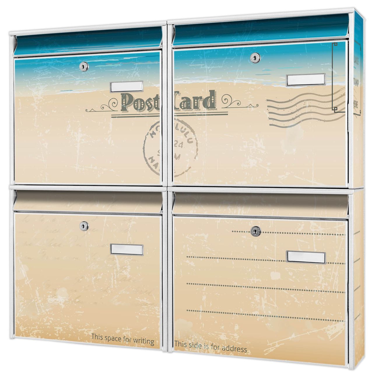 FUNKTION: Die Burg-Wächter Briefkastenanlage mit Motiv Postkarte bietet Ihnen ausreichend Fassungsvermögen um auch A4 und C4 Sendungen zu empfangen. Das integrierte Namensschild lässt sich individuell beschriften. Wählen Sie aus den Grundfarben weiß, silber und schwarz. DESIGN: Die 4 Briefkästen haben ein ansprechendes und zeitloses Design, ohne dabei auf Funktionalität zu verzichten. Das Material ist sehr stabil, wetterfest und rostfrei. Durch das Motiv Postkarte werden die Postkästen zu einem Blickfang. DETAILS: Die Postkästen bestehen aus verzinktem Stahl der zusätzlich mit Klarlack versiegelt wurde. Die Kästen sind gesamt 64,5cm hoch, 72,5cm breit und 10cm tief. Das Motiv besteht aus einer wetter- und UV-festen Folie, die Ihren Briefkasten zusätzlich vor Kratzern schützt. Die Postkästen werden mit Montagematerial, je einem Namensschild und je zwei Schlüsseln geliefert. NUTZEN: Das Briefkastenset eignet sich für die Wandmontage, die Größe bietet genügend Platz für Sendungen aller Art. Das zeitlose Design sowie die stabile Bauart bieten Ihnen einen treuen Begleiter für Ihre Post. BANJADO: