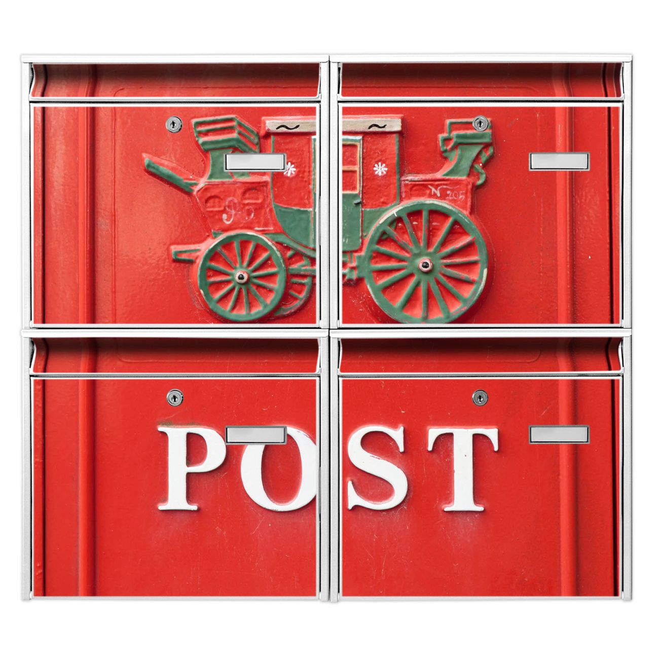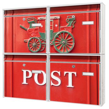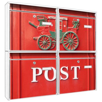 FUNKTION: Die Burg-Wächter Briefkastenanlage mit Motiv Postkasten Nostalgie bietet Ihnen ausreichend Fassungsvermögen um auch A4 und C4 Sendungen zu empfangen. Das integrierte Namensschild lässt sich individuell beschriften. Wählen Sie aus den Grundfarben weiß, silber und schwarz. DESIGN: Die 4 Briefkästen haben ein ansprechendes und zeitloses Design, ohne dabei auf Funktionalität zu verzichten. Das Material ist sehr stabil, wetterfest und rostfrei. Durch das Motiv Postkasten Nostalgie werden die Postkästen zu einem Blickfang. DETAILS: Die Postkästen bestehen aus verzinktem Stahl der zusätzlich mit Klarlack versiegelt wurde. Die Kästen sind gesamt 64,5cm hoch, 72,5cm breit und 10cm tief. Das Motiv besteht aus einer wetter- und UV-festen Folie, die Ihren Briefkasten zusätzlich vor Kratzern schützt. Die Postkästen werden mit Montagematerial, je einem Namensschild und je zwei Schlüsseln geliefert. NUTZEN: Das Briefkastenset eignet sich für die Wandmontage, die Größe bietet genügend Platz für Sendungen aller Art. Das zeitlose Design sowie die stabile Bauart bieten Ihnen einen treuen Begleiter für Ihre Post. BANJADO: