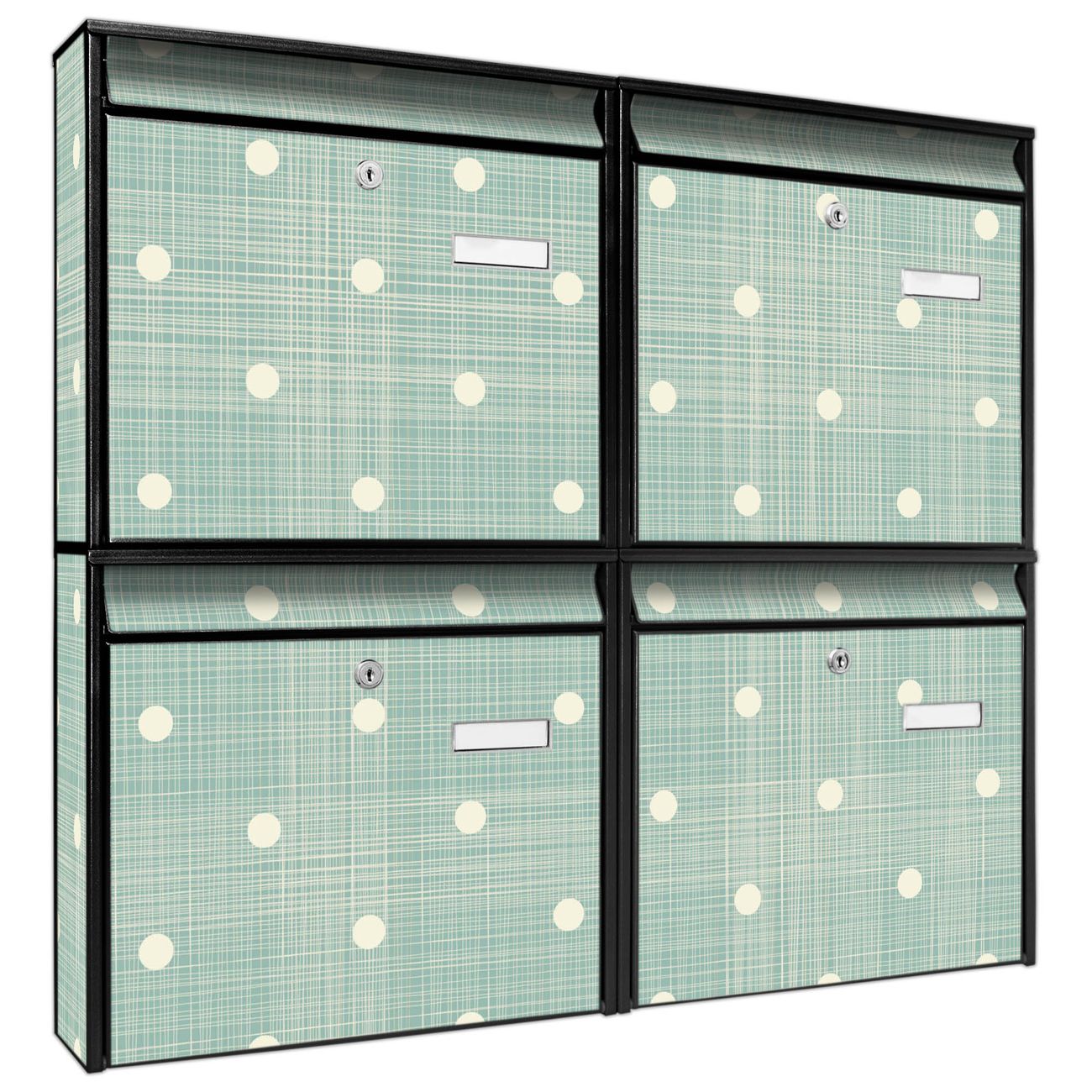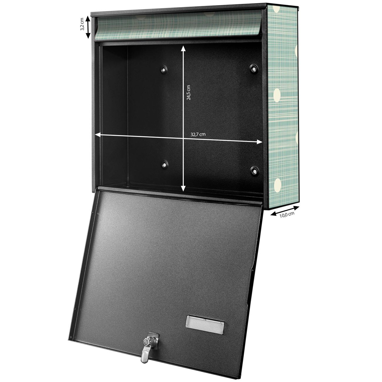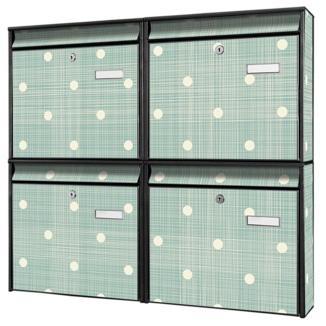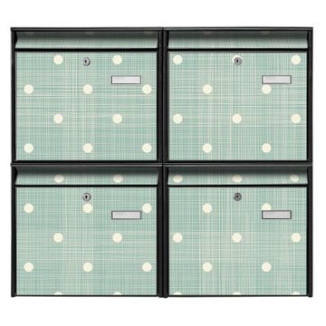 FUNKTION: Die Burg-Wächter Briefkastenanlage mit Motiv Punkte Lindgrün bietet Ihnen ausreichend Fassungsvermögen um auch A4 und C4 Sendungen zu empfangen. Das integrierte Namensschild lässt sich individuell beschriften. Wählen Sie aus den Grundfarben weiß, silber und schwarz. DESIGN: Die 4 Briefkästen haben ein ansprechendes und zeitloses Design, ohne dabei auf Funktionalität zu verzichten. Das Material ist sehr stabil, wetterfest und rostfrei. Durch das Motiv Punkte Lindgrün werden die Postkästen zu einem Blickfang. DETAILS: Die Postkästen bestehen aus verzinktem Stahl der zusätzlich mit Klarlack versiegelt wurde. Die Kästen sind gesamt 64,5cm hoch, 72,5cm breit und 10cm tief. Das Motiv besteht aus einer wetter- und UV-festen Folie, die Ihren Briefkasten zusätzlich vor Kratzern schützt. Die Postkästen werden mit Montagematerial, je einem Namensschild und je zwei Schlüsseln geliefert. NUTZEN: Das Briefkastenset eignet sich für die Wandmontage, die Größe bietet genügend Platz für Sendungen aller Art. Das zeitlose Design sowie die stabile Bauart bieten Ihnen einen treuen Begleiter für Ihre Post. BANJADO: