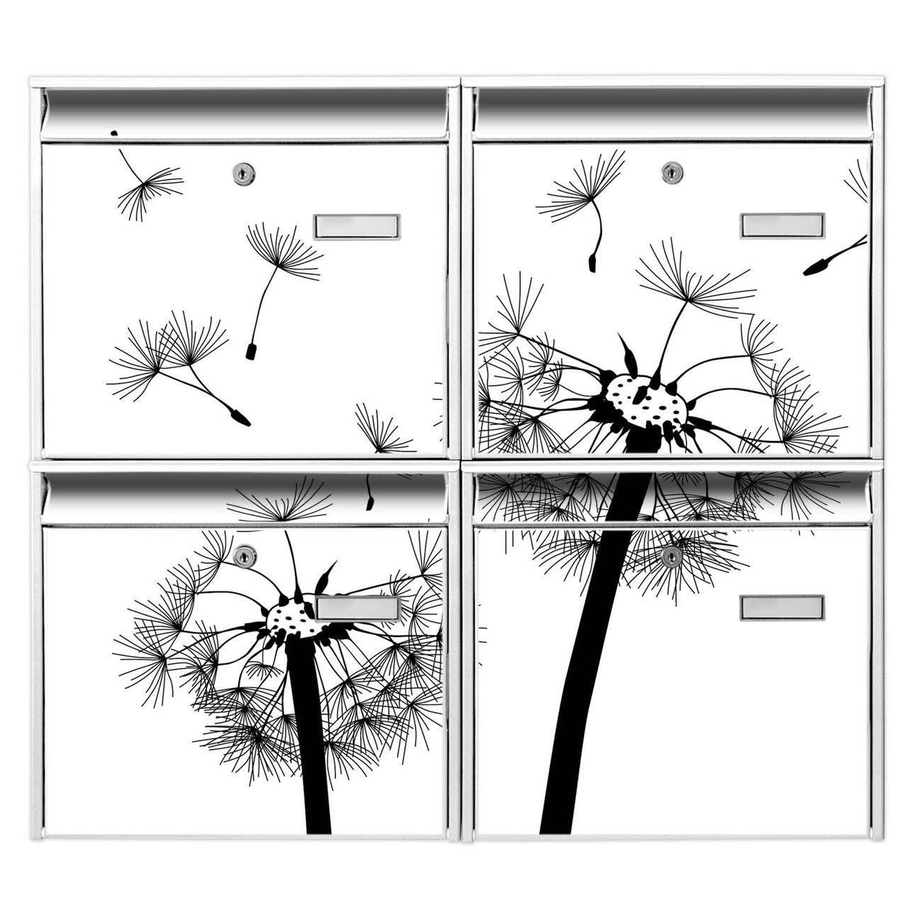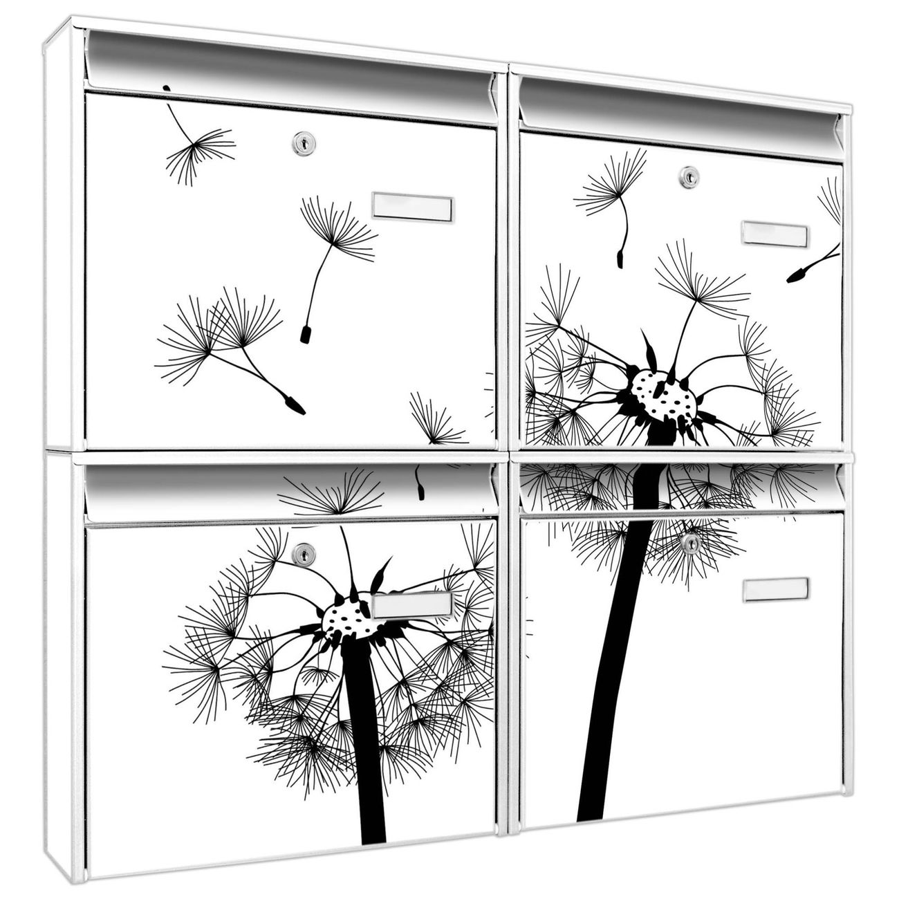 FUNKTION: Die Burg-Wächter Briefkastenanlage mit Motiv Pusteblume 2 bietet Ihnen ausreichend Fassungsvermögen um auch A4 und C4 Sendungen zu empfangen. Das integrierte Namensschild lässt sich individuell beschriften. Wählen Sie aus den Grundfarben weiß, silber und schwarz. DESIGN: Die 4 Briefkästen haben ein ansprechendes und zeitloses Design, ohne dabei auf Funktionalität zu verzichten. Das Material ist sehr stabil, wetterfest und rostfrei. Durch das Motiv Pusteblume 2 werden die Postkästen zu einem Blickfang. DETAILS: Die Postkästen bestehen aus verzinktem Stahl der zusätzlich mit Klarlack versiegelt wurde. Die Kästen sind gesamt 64,5cm hoch, 72,5cm breit und 10cm tief. Das Motiv besteht aus einer wetter- und UV-festen Folie, die Ihren Briefkasten zusätzlich vor Kratzern schützt. Die Postkästen werden mit Montagematerial, je einem Namensschild und je zwei Schlüsseln geliefert. NUTZEN: Das Briefkastenset eignet sich für die Wandmontage, die Größe bietet genügend Platz für Sendungen aller Art. Das zeitlose Design sowie die stabile Bauart bieten Ihnen einen treuen Begleiter für Ihre Post. BANJADO: