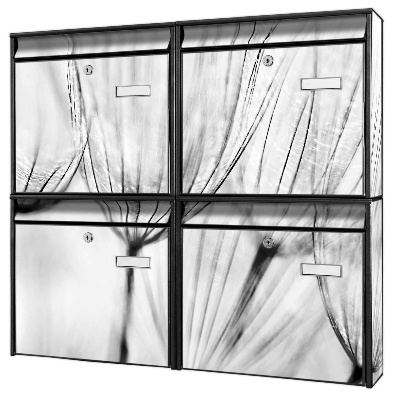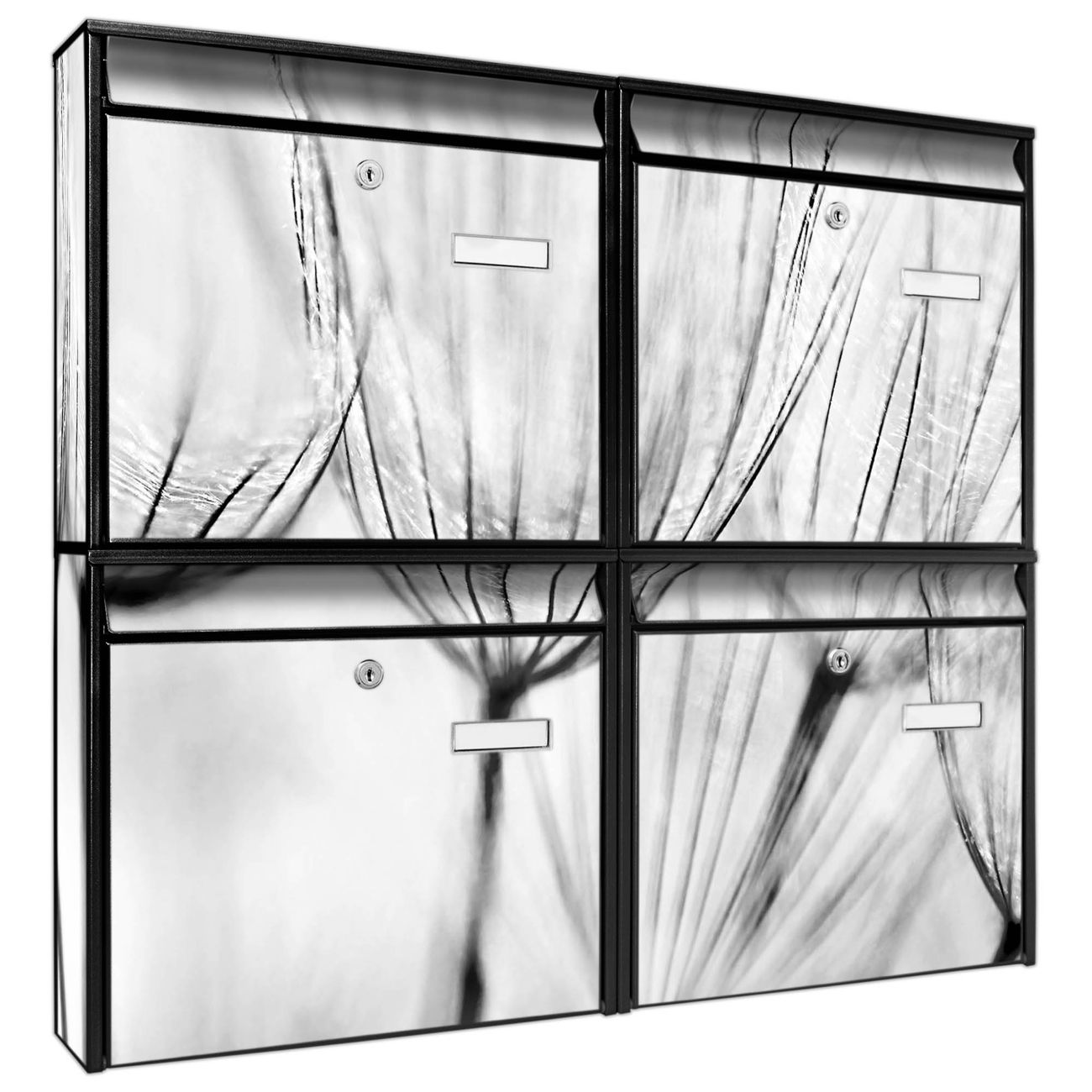 FUNKTION: Die Burg-Wächter Briefkastenanlage mit Motiv Pusteblumen SW bietet Ihnen ausreichend Fassungsvermögen um auch A4 und C4 Sendungen zu empfangen. Das integrierte Namensschild lässt sich individuell beschriften. Wählen Sie aus den Grundfarben weiß, silber und schwarz. DESIGN: Die 4 Briefkästen haben ein ansprechendes und zeitloses Design, ohne dabei auf Funktionalität zu verzichten. Das Material ist sehr stabil, wetterfest und rostfrei. Durch das Motiv Pusteblumen SW werden die Postkästen zu einem Blickfang. DETAILS: Die Postkästen bestehen aus verzinktem Stahl der zusätzlich mit Klarlack versiegelt wurde. Die Kästen sind gesamt 64,5cm hoch, 72,5cm breit und 10cm tief. Das Motiv besteht aus einer wetter- und UV-festen Folie, die Ihren Briefkasten zusätzlich vor Kratzern schützt. Die Postkästen werden mit Montagematerial, je einem Namensschild und je zwei Schlüsseln geliefert. NUTZEN: Das Briefkastenset eignet sich für die Wandmontage, die Größe bietet genügend Platz für Sendungen aller Art. Das zeitlose Design sowie die stabile Bauart bieten Ihnen einen treuen Begleiter für Ihre Post. BANJADO: