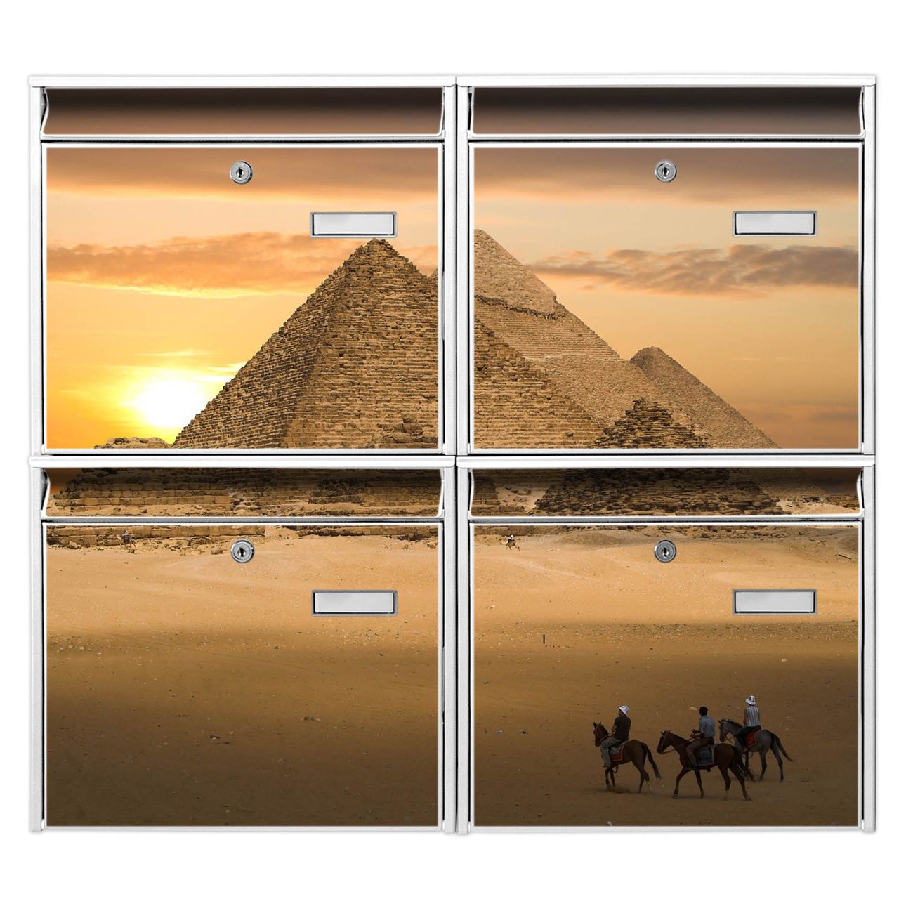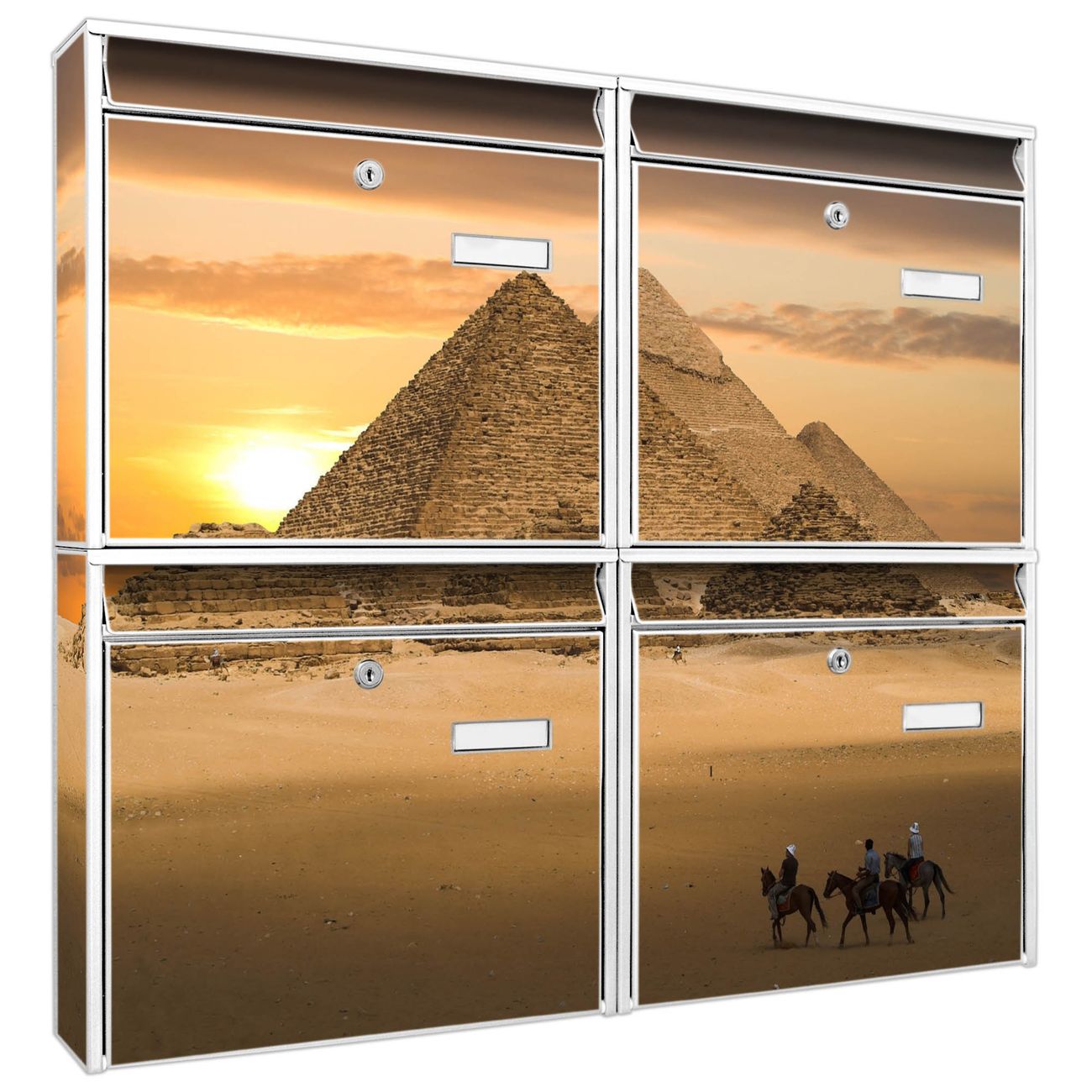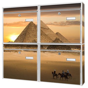 FUNKTION: Die Burg-Wächter Briefkastenanlage mit Motiv Pyramiden bietet Ihnen ausreichend Fassungsvermögen um auch A4 und C4 Sendungen zu empfangen. Das integrierte Namensschild lässt sich individuell beschriften. Wählen Sie aus den Grundfarben weiß, silber und schwarz. DESIGN: Die 4 Briefkästen haben ein ansprechendes und zeitloses Design, ohne dabei auf Funktionalität zu verzichten. Das Material ist sehr stabil, wetterfest und rostfrei. Durch das Motiv Pyramiden werden die Postkästen zu einem Blickfang. DETAILS: Die Postkästen bestehen aus verzinktem Stahl der zusätzlich mit Klarlack versiegelt wurde. Die Kästen sind gesamt 64,5cm hoch, 72,5cm breit und 10cm tief. Das Motiv besteht aus einer wetter- und UV-festen Folie, die Ihren Briefkasten zusätzlich vor Kratzern schützt. Die Postkästen werden mit Montagematerial, je einem Namensschild und je zwei Schlüsseln geliefert. NUTZEN: Das Briefkastenset eignet sich für die Wandmontage, die Größe bietet genügend Platz für Sendungen aller Art. Das zeitlose Design sowie die stabile Bauart bieten Ihnen einen treuen Begleiter für Ihre Post. BANJADO: