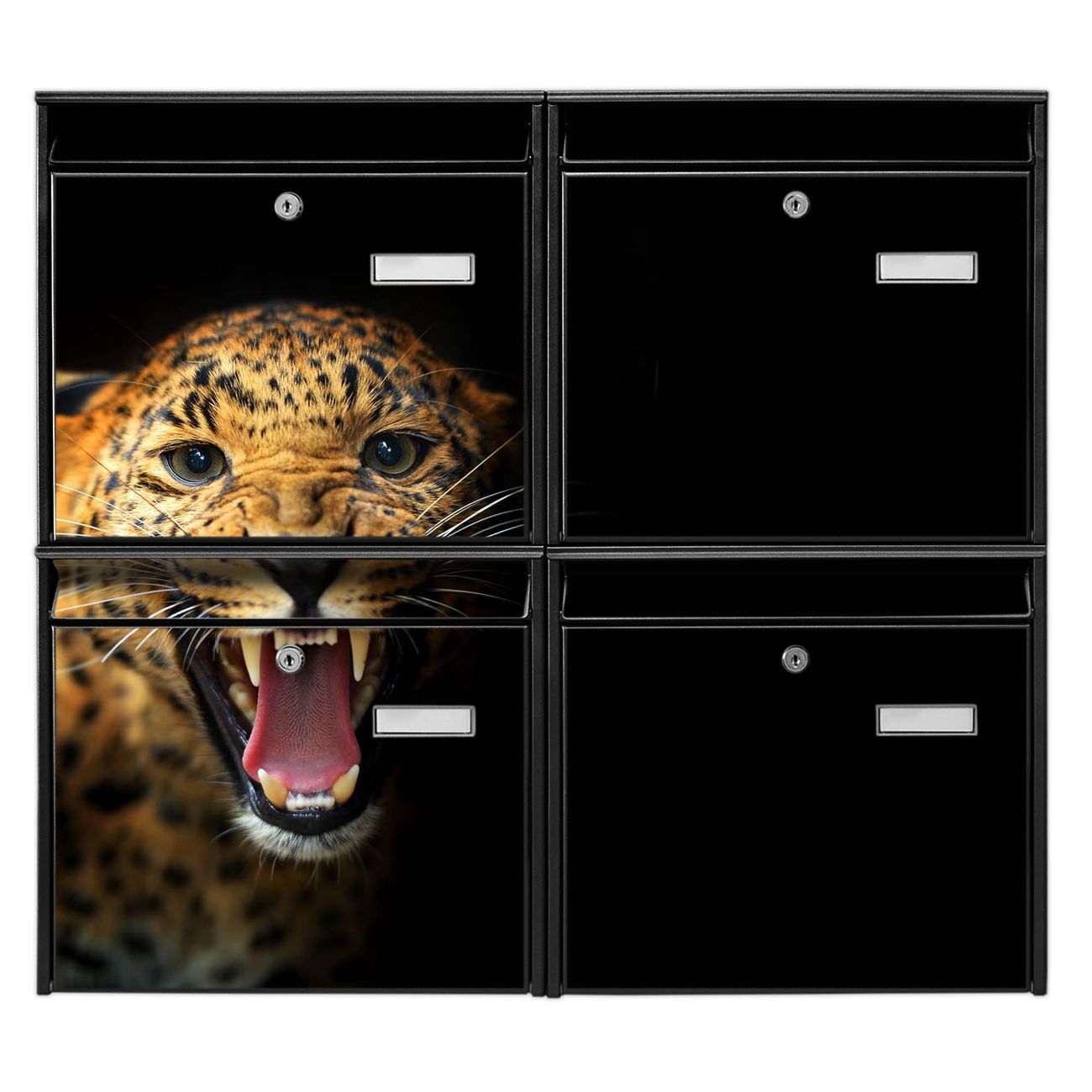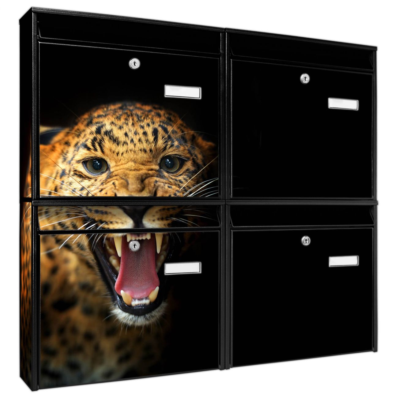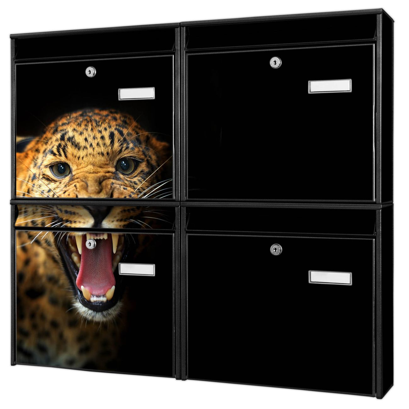 FUNKTION: Die Burg-Wächter Briefkastenanlage mit Motiv Raubkatze bietet Ihnen ausreichend Fassungsvermögen um auch A4 und C4 Sendungen zu empfangen. Das integrierte Namensschild lässt sich individuell beschriften. Wählen Sie aus den Grundfarben weiß, silber und schwarz. DESIGN: Die 4 Briefkästen haben ein ansprechendes und zeitloses Design, ohne dabei auf Funktionalität zu verzichten. Das Material ist sehr stabil, wetterfest und rostfrei. Durch das Motiv Raubkatze werden die Postkästen zu einem Blickfang. DETAILS: Die Postkästen bestehen aus verzinktem Stahl der zusätzlich mit Klarlack versiegelt wurde. Die Kästen sind gesamt 64,5cm hoch, 72,5cm breit und 10cm tief. Das Motiv besteht aus einer wetter- und UV-festen Folie, die Ihren Briefkasten zusätzlich vor Kratzern schützt. Die Postkästen werden mit Montagematerial, je einem Namensschild und je zwei Schlüsseln geliefert. NUTZEN: Das Briefkastenset eignet sich für die Wandmontage, die Größe bietet genügend Platz für Sendungen aller Art. Das zeitlose Design sowie die stabile Bauart bieten Ihnen einen treuen Begleiter für Ihre Post. BANJADO: