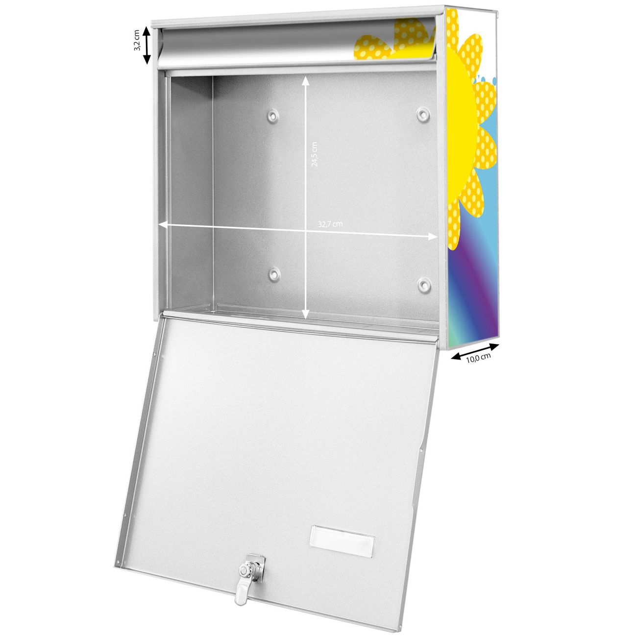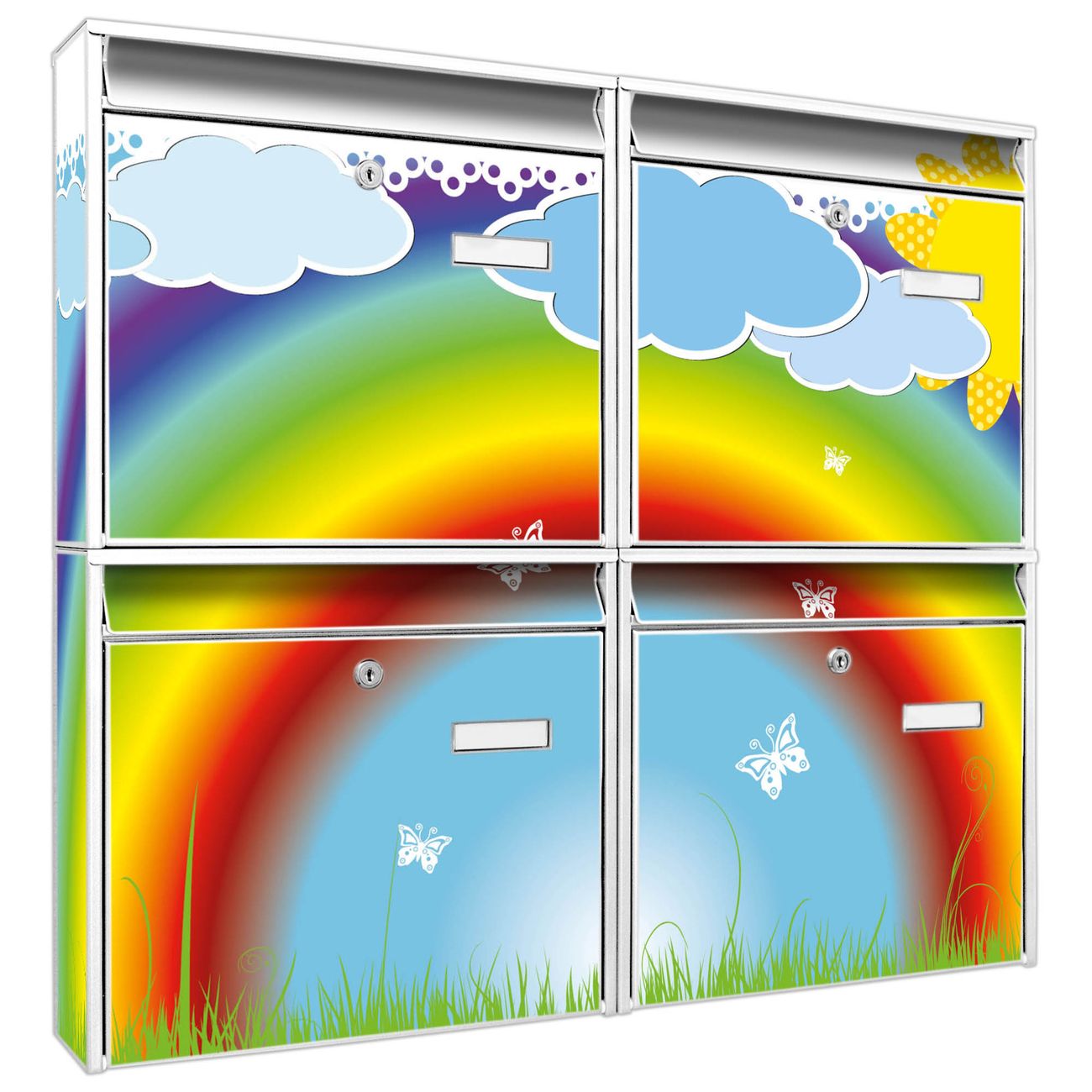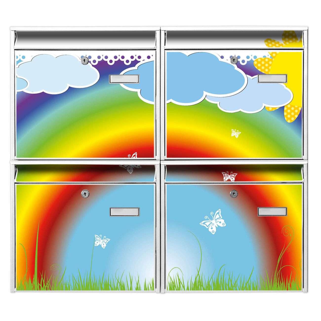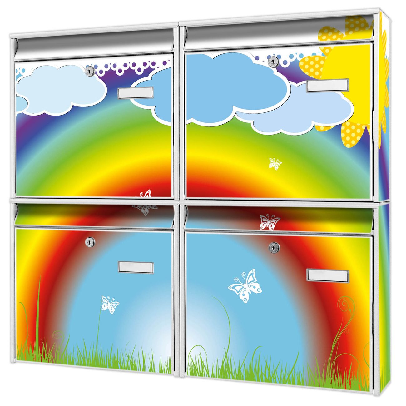 FUNKTION: Die Burg-Wächter Briefkastenanlage mit Motiv Regenbogen bietet Ihnen ausreichend Fassungsvermögen um auch A4 und C4 Sendungen zu empfangen. Das integrierte Namensschild lässt sich individuell beschriften. Wählen Sie aus den Grundfarben weiß, silber und schwarz. DESIGN: Die 4 Briefkästen haben ein ansprechendes und zeitloses Design, ohne dabei auf Funktionalität zu verzichten. Das Material ist sehr stabil, wetterfest und rostfrei. Durch das Motiv Regenbogen werden die Postkästen zu einem Blickfang. DETAILS: Die Postkästen bestehen aus verzinktem Stahl der zusätzlich mit Klarlack versiegelt wurde. Die Kästen sind gesamt 64,5cm hoch, 72,5cm breit und 10cm tief. Das Motiv besteht aus einer wetter- und UV-festen Folie, die Ihren Briefkasten zusätzlich vor Kratzern schützt. Die Postkästen werden mit Montagematerial, je einem Namensschild und je zwei Schlüsseln geliefert. NUTZEN: Das Briefkastenset eignet sich für die Wandmontage, die Größe bietet genügend Platz für Sendungen aller Art. Das zeitlose Design sowie die stabile Bauart bieten Ihnen einen treuen Begleiter für Ihre Post. BANJADO: