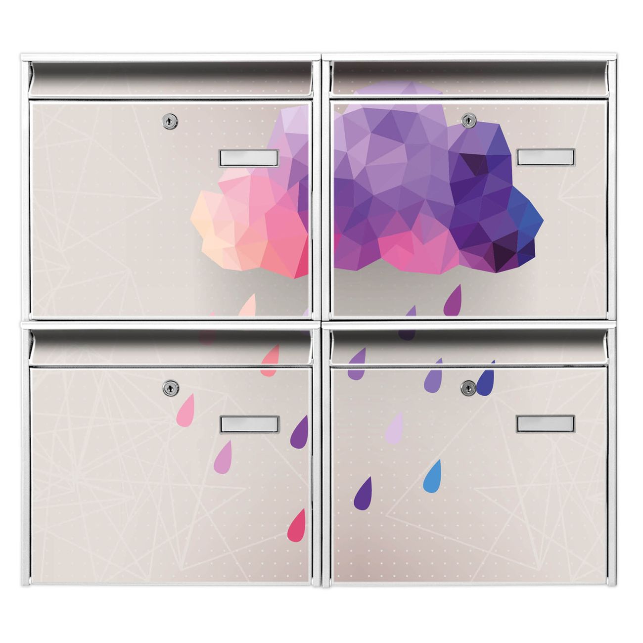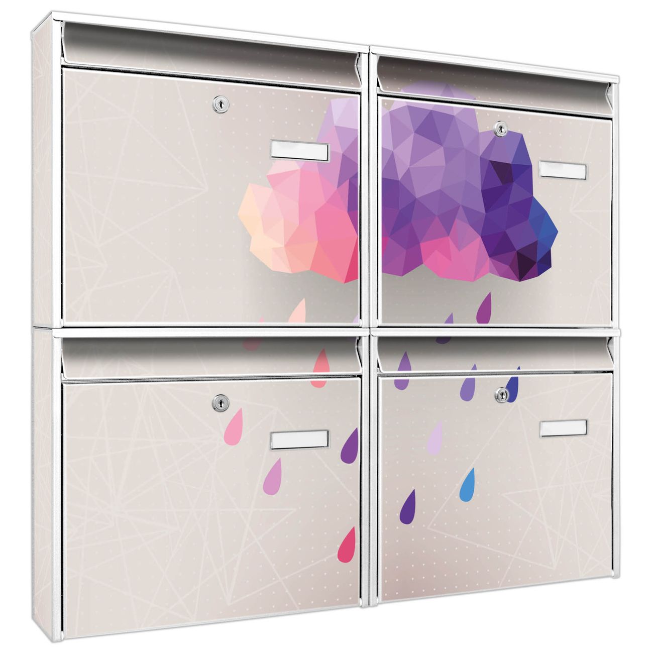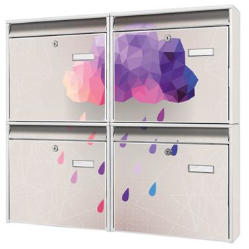 FUNKTION: Die Burg-Wächter Briefkastenanlage mit Motiv Regenwolke bietet Ihnen ausreichend Fassungsvermögen um auch A4 und C4 Sendungen zu empfangen. Das integrierte Namensschild lässt sich individuell beschriften. Wählen Sie aus den Grundfarben weiß, silber und schwarz. DESIGN: Die 4 Briefkästen haben ein ansprechendes und zeitloses Design, ohne dabei auf Funktionalität zu verzichten. Das Material ist sehr stabil, wetterfest und rostfrei. Durch das Motiv Regenwolke werden die Postkästen zu einem Blickfang. DETAILS: Die Postkästen bestehen aus verzinktem Stahl der zusätzlich mit Klarlack versiegelt wurde. Die Kästen sind gesamt 64,5cm hoch, 72,5cm breit und 10cm tief. Das Motiv besteht aus einer wetter- und UV-festen Folie, die Ihren Briefkasten zusätzlich vor Kratzern schützt. Die Postkästen werden mit Montagematerial, je einem Namensschild und je zwei Schlüsseln geliefert. NUTZEN: Das Briefkastenset eignet sich für die Wandmontage, die Größe bietet genügend Platz für Sendungen aller Art. Das zeitlose Design sowie die stabile Bauart bieten Ihnen einen treuen Begleiter für Ihre Post. BANJADO: