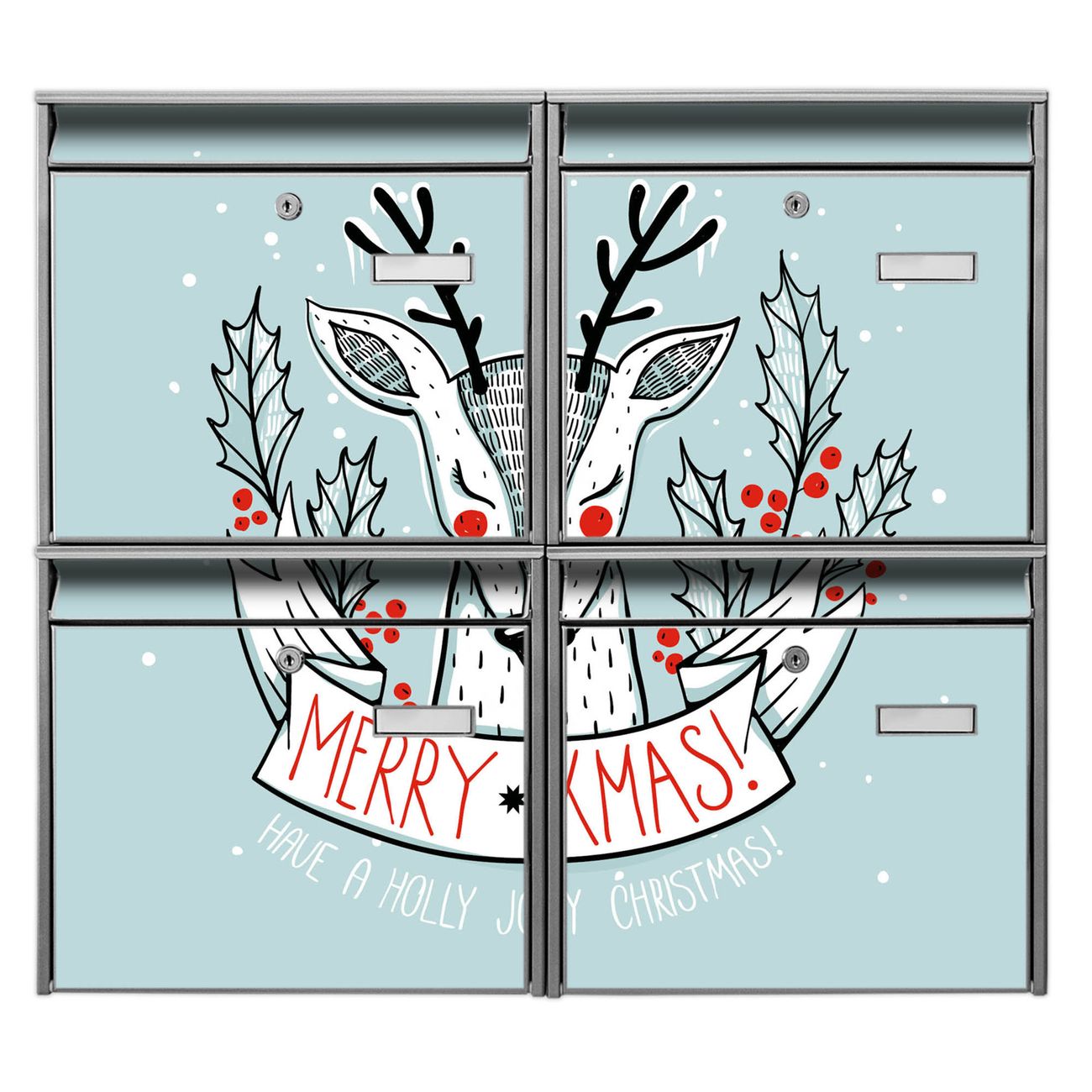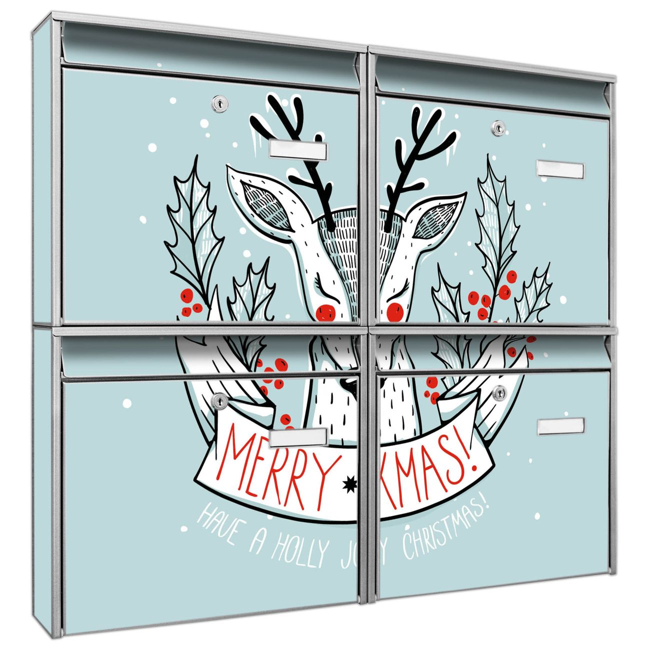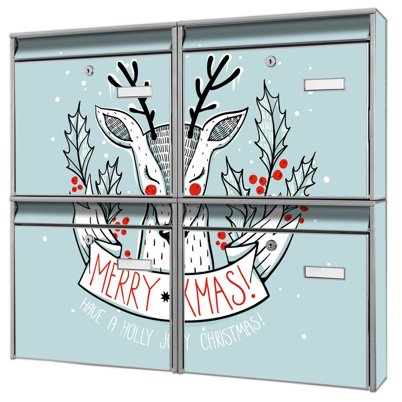 FUNKTION: Die Burg-Wächter Briefkastenanlage mit Motiv Rentier bietet Ihnen ausreichend Fassungsvermögen um auch A4 und C4 Sendungen zu empfangen. Das integrierte Namensschild lässt sich individuell beschriften. Wählen Sie aus den Grundfarben weiß, silber und schwarz. DESIGN: Die 4 Briefkästen haben ein ansprechendes und zeitloses Design, ohne dabei auf Funktionalität zu verzichten. Das Material ist sehr stabil, wetterfest und rostfrei. Durch das Motiv Rentier werden die Postkästen zu einem Blickfang. DETAILS: Die Postkästen bestehen aus verzinktem Stahl der zusätzlich mit Klarlack versiegelt wurde. Die Kästen sind gesamt 64,5cm hoch, 72,5cm breit und 10cm tief. Das Motiv besteht aus einer wetter- und UV-festen Folie, die Ihren Briefkasten zusätzlich vor Kratzern schützt. Die Postkästen werden mit Montagematerial, je einem Namensschild und je zwei Schlüsseln geliefert. NUTZEN: Das Briefkastenset eignet sich für die Wandmontage, die Größe bietet genügend Platz für Sendungen aller Art. Das zeitlose Design sowie die stabile Bauart bieten Ihnen einen treuen Begleiter für Ihre Post. BANJADO: