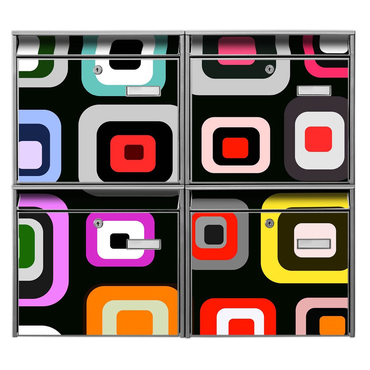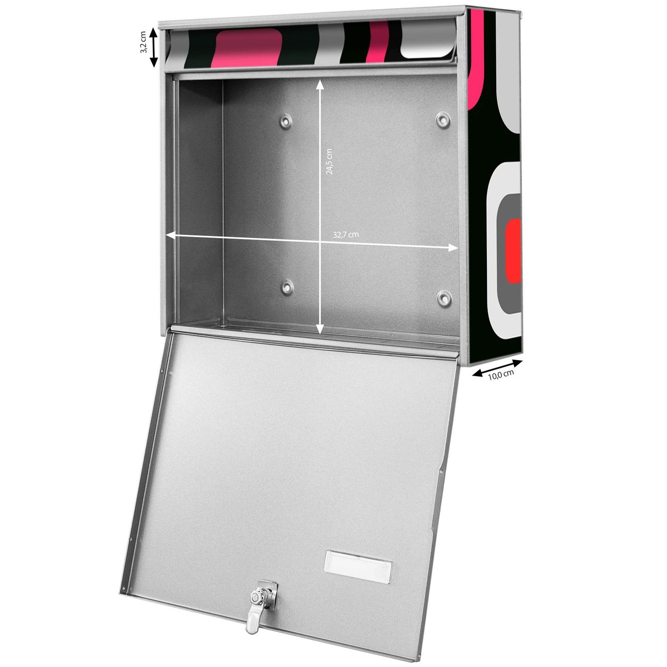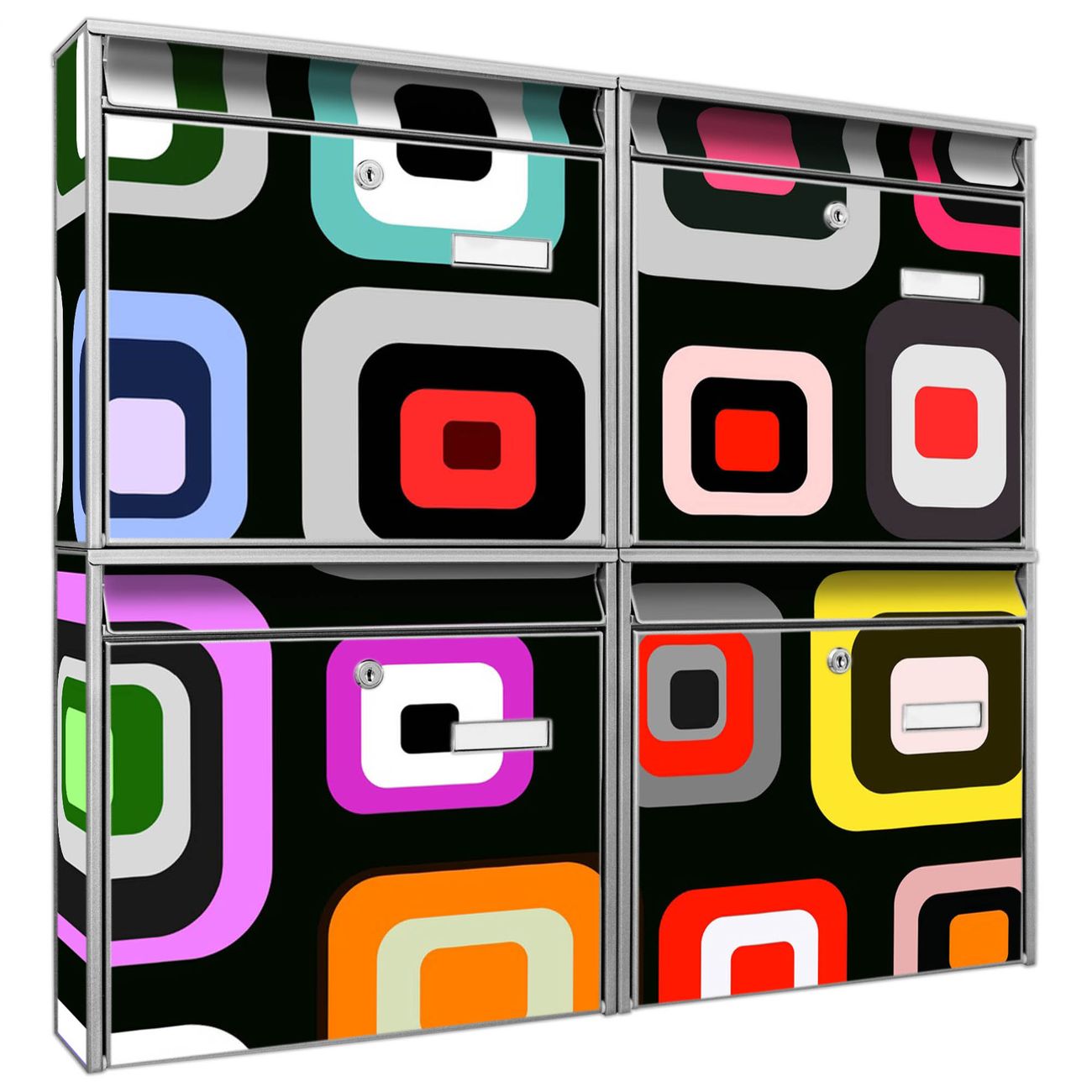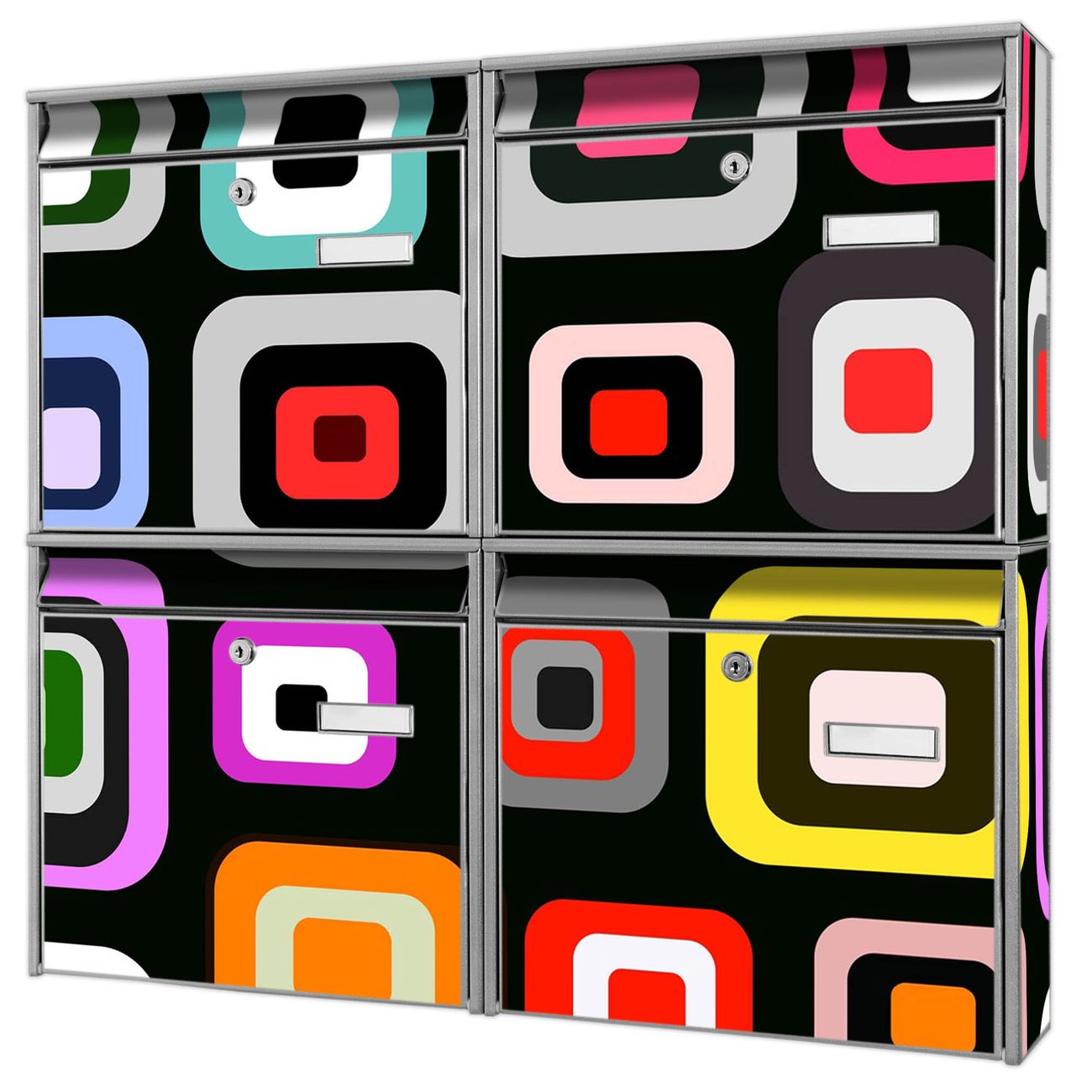 FUNKTION: Die Burg-Wächter Briefkastenanlage mit Motiv Retro bietet Ihnen ausreichend Fassungsvermögen um auch A4 und C4 Sendungen zu empfangen. Das integrierte Namensschild lässt sich individuell beschriften. Wählen Sie aus den Grundfarben weiß, silber und schwarz. DESIGN: Die 4 Briefkästen haben ein ansprechendes und zeitloses Design, ohne dabei auf Funktionalität zu verzichten. Das Material ist sehr stabil, wetterfest und rostfrei. Durch das Motiv Retro werden die Postkästen zu einem Blickfang. DETAILS: Die Postkästen bestehen aus verzinktem Stahl der zusätzlich mit Klarlack versiegelt wurde. Die Kästen sind gesamt 64,5cm hoch, 72,5cm breit und 10cm tief. Das Motiv besteht aus einer wetter- und UV-festen Folie, die Ihren Briefkasten zusätzlich vor Kratzern schützt. Die Postkästen werden mit Montagematerial, je einem Namensschild und je zwei Schlüsseln geliefert. NUTZEN: Das Briefkastenset eignet sich für die Wandmontage, die Größe bietet genügend Platz für Sendungen aller Art. Das zeitlose Design sowie die stabile Bauart bieten Ihnen einen treuen Begleiter für Ihre Post. BANJADO: