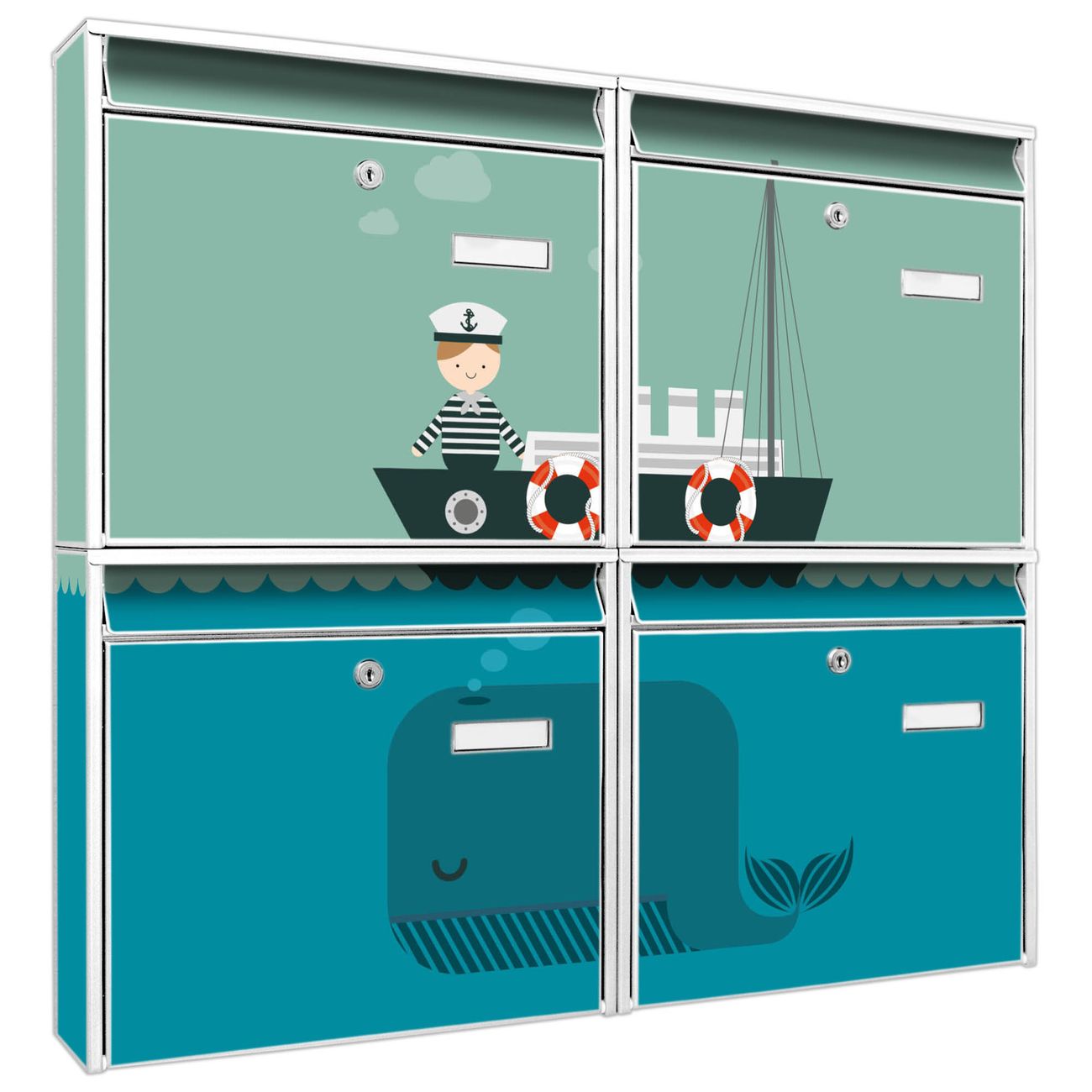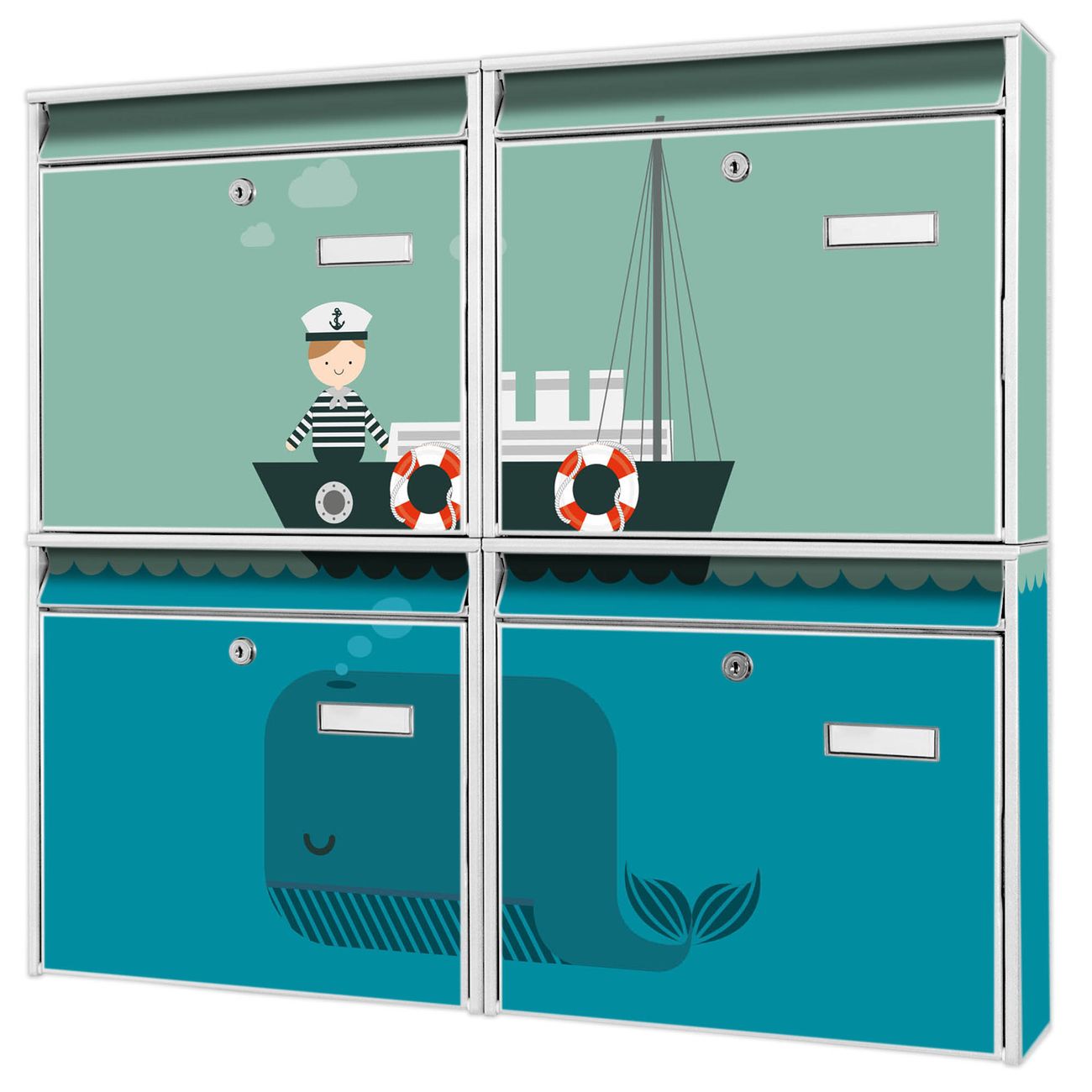 FUNKTION: Die Burg-Wächter Briefkastenanlage mit Motiv Rettet die Wale bietet Ihnen ausreichend Fassungsvermögen um auch A4 und C4 Sendungen zu empfangen. Das integrierte Namensschild lässt sich individuell beschriften. Wählen Sie aus den Grundfarben weiß, silber und schwarz. DESIGN: Die 4 Briefkästen haben ein ansprechendes und zeitloses Design, ohne dabei auf Funktionalität zu verzichten. Das Material ist sehr stabil, wetterfest und rostfrei. Durch das Motiv Rettet die Wale werden die Postkästen zu einem Blickfang. DETAILS: Die Postkästen bestehen aus verzinktem Stahl der zusätzlich mit Klarlack versiegelt wurde. Die Kästen sind gesamt 64,5cm hoch, 72,5cm breit und 10cm tief. Das Motiv besteht aus einer wetter- und UV-festen Folie, die Ihren Briefkasten zusätzlich vor Kratzern schützt. Die Postkästen werden mit Montagematerial, je einem Namensschild und je zwei Schlüsseln geliefert. NUTZEN: Das Briefkastenset eignet sich für die Wandmontage, die Größe bietet genügend Platz für Sendungen aller Art. Das zeitlose Design sowie die stabile Bauart bieten Ihnen einen treuen Begleiter für Ihre Post. BANJADO:
