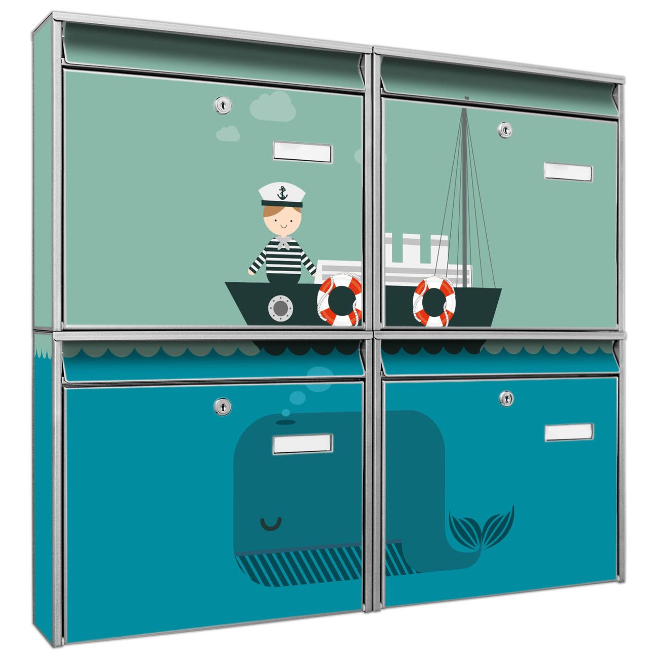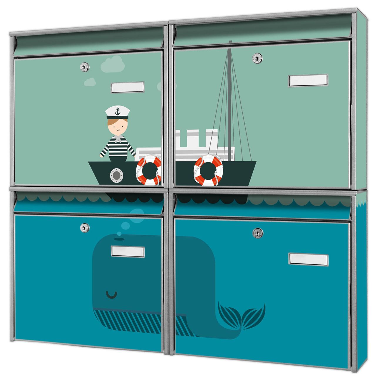 FUNKTION: Die Burg-Wächter Briefkastenanlage mit Motiv Rettet die Wale bietet Ihnen ausreichend Fassungsvermögen um auch A4 und C4 Sendungen zu empfangen. Das integrierte Namensschild lässt sich individuell beschriften. Wählen Sie aus den Grundfarben weiß, silber und schwarz. DESIGN: Die 4 Briefkästen haben ein ansprechendes und zeitloses Design, ohne dabei auf Funktionalität zu verzichten. Das Material ist sehr stabil, wetterfest und rostfrei. Durch das Motiv Rettet die Wale werden die Postkästen zu einem Blickfang. DETAILS: Die Postkästen bestehen aus verzinktem Stahl der zusätzlich mit Klarlack versiegelt wurde. Die Kästen sind gesamt 64,5cm hoch, 72,5cm breit und 10cm tief. Das Motiv besteht aus einer wetter- und UV-festen Folie, die Ihren Briefkasten zusätzlich vor Kratzern schützt. Die Postkästen werden mit Montagematerial, je einem Namensschild und je zwei Schlüsseln geliefert. NUTZEN: Das Briefkastenset eignet sich für die Wandmontage, die Größe bietet genügend Platz für Sendungen aller Art. Das zeitlose Design sowie die stabile Bauart bieten Ihnen einen treuen Begleiter für Ihre Post. BANJADO: