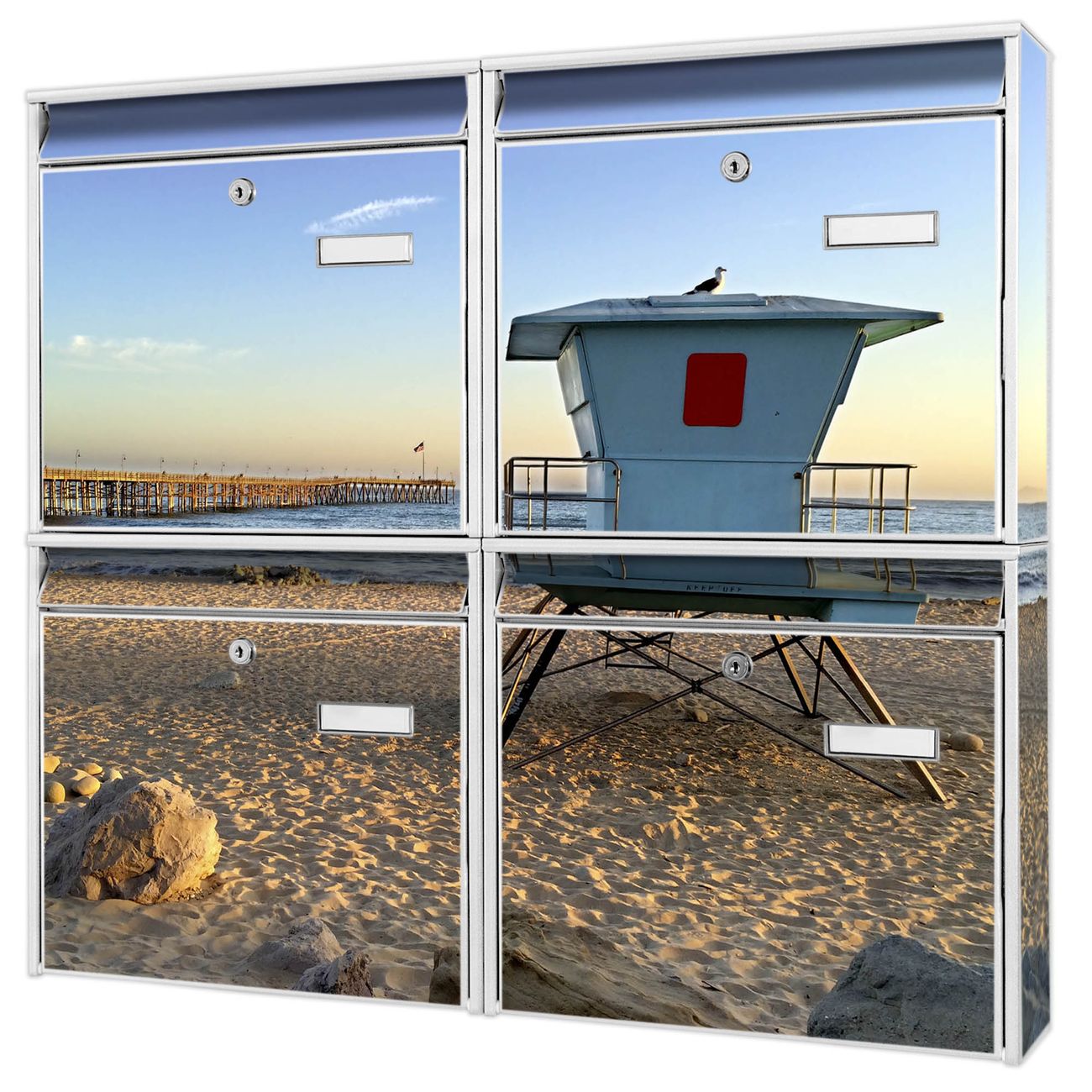 FUNKTION: Die Burg-Wächter Briefkastenanlage mit Motiv Rettungsturm bietet Ihnen ausreichend Fassungsvermögen um auch A4 und C4 Sendungen zu empfangen. Das integrierte Namensschild lässt sich individuell beschriften. Wählen Sie aus den Grundfarben weiß, silber und schwarz. DESIGN: Die 4 Briefkästen haben ein ansprechendes und zeitloses Design, ohne dabei auf Funktionalität zu verzichten. Das Material ist sehr stabil, wetterfest und rostfrei. Durch das Motiv Rettungsturm werden die Postkästen zu einem Blickfang. DETAILS: Die Postkästen bestehen aus verzinktem Stahl der zusätzlich mit Klarlack versiegelt wurde. Die Kästen sind gesamt 64,5cm hoch, 72,5cm breit und 10cm tief. Das Motiv besteht aus einer wetter- und UV-festen Folie, die Ihren Briefkasten zusätzlich vor Kratzern schützt. Die Postkästen werden mit Montagematerial, je einem Namensschild und je zwei Schlüsseln geliefert. NUTZEN: Das Briefkastenset eignet sich für die Wandmontage, die Größe bietet genügend Platz für Sendungen aller Art. Das zeitlose Design sowie die stabile Bauart bieten Ihnen einen treuen Begleiter für Ihre Post. BANJADO: