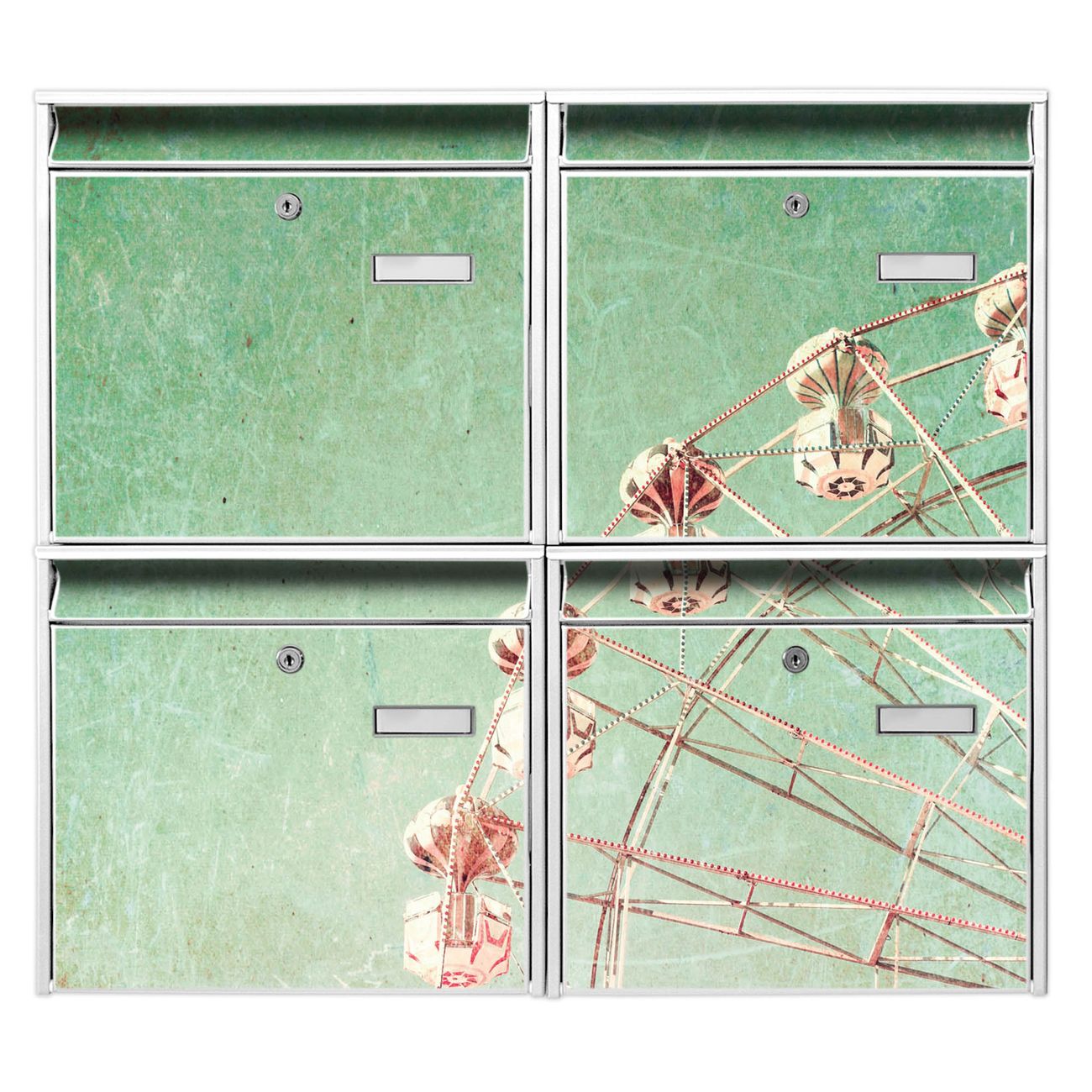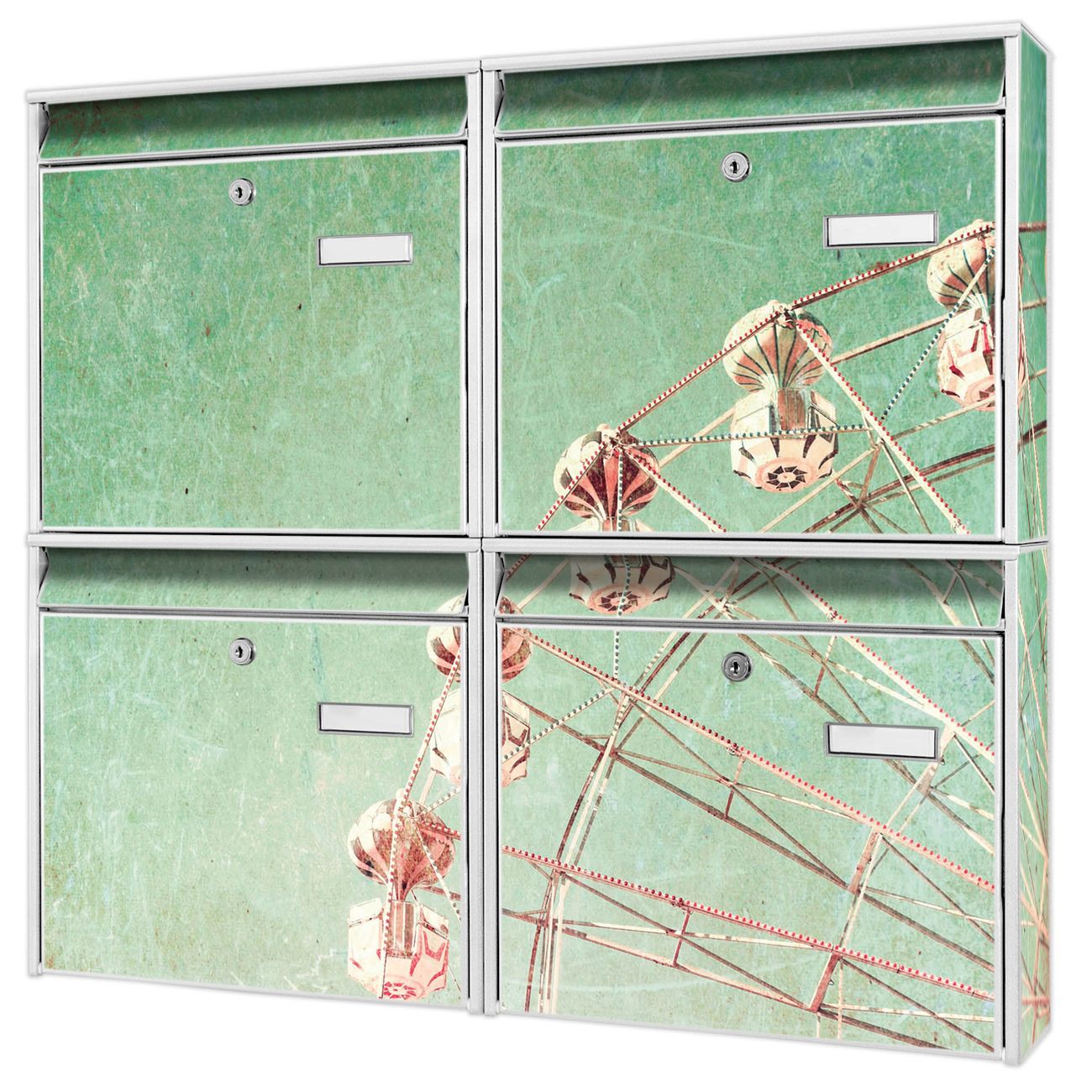 FUNKTION: Die Burg-Wächter Briefkastenanlage mit Motiv Riesenrad 1 bietet Ihnen ausreichend Fassungsvermögen um auch A4 und C4 Sendungen zu empfangen. Das integrierte Namensschild lässt sich individuell beschriften. Wählen Sie aus den Grundfarben weiß, silber und schwarz. DESIGN: Die 4 Briefkästen haben ein ansprechendes und zeitloses Design, ohne dabei auf Funktionalität zu verzichten. Das Material ist sehr stabil, wetterfest und rostfrei. Durch das Motiv Riesenrad 1 werden die Postkästen zu einem Blickfang. DETAILS: Die Postkästen bestehen aus verzinktem Stahl der zusätzlich mit Klarlack versiegelt wurde. Die Kästen sind gesamt 64,5cm hoch, 72,5cm breit und 10cm tief. Das Motiv besteht aus einer wetter- und UV-festen Folie, die Ihren Briefkasten zusätzlich vor Kratzern schützt. Die Postkästen werden mit Montagematerial, je einem Namensschild und je zwei Schlüsseln geliefert. NUTZEN: Das Briefkastenset eignet sich für die Wandmontage, die Größe bietet genügend Platz für Sendungen aller Art. Das zeitlose Design sowie die stabile Bauart bieten Ihnen einen treuen Begleiter für Ihre Post. BANJADO: