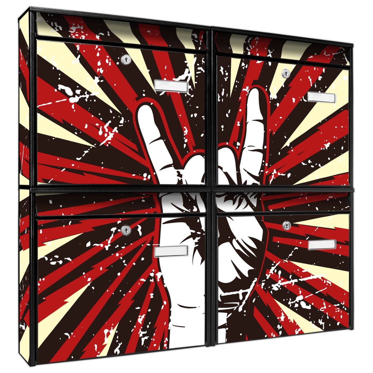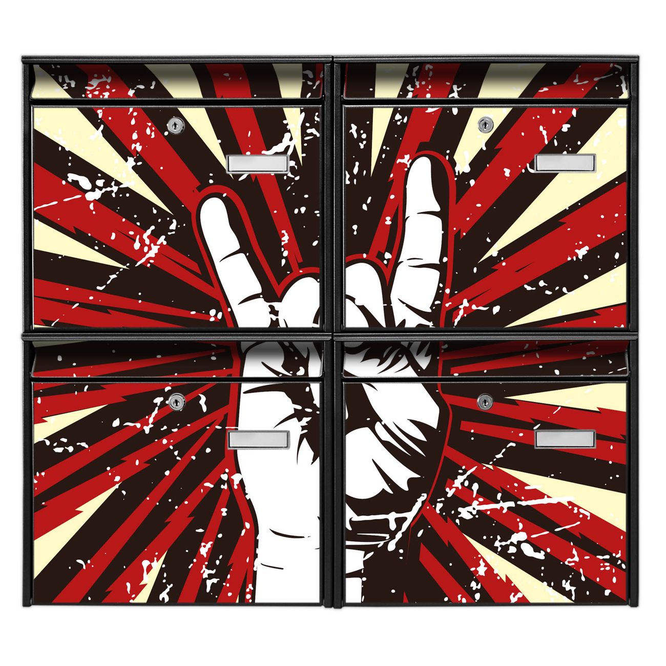 FUNKTION: Die Burg-Wächter Briefkastenanlage mit Motiv Rock On bietet Ihnen ausreichend Fassungsvermögen um auch A4 und C4 Sendungen zu empfangen. Das integrierte Namensschild lässt sich individuell beschriften. Wählen Sie aus den Grundfarben weiß, silber und schwarz. DESIGN: Die 4 Briefkästen haben ein ansprechendes und zeitloses Design, ohne dabei auf Funktionalität zu verzichten. Das Material ist sehr stabil, wetterfest und rostfrei. Durch das Motiv Rock On werden die Postkästen zu einem Blickfang. DETAILS: Die Postkästen bestehen aus verzinktem Stahl der zusätzlich mit Klarlack versiegelt wurde. Die Kästen sind gesamt 64,5cm hoch, 72,5cm breit und 10cm tief. Das Motiv besteht aus einer wetter- und UV-festen Folie, die Ihren Briefkasten zusätzlich vor Kratzern schützt. Die Postkästen werden mit Montagematerial, je einem Namensschild und je zwei Schlüsseln geliefert. NUTZEN: Das Briefkastenset eignet sich für die Wandmontage, die Größe bietet genügend Platz für Sendungen aller Art. Das zeitlose Design sowie die stabile Bauart bieten Ihnen einen treuen Begleiter für Ihre Post. BANJADO: