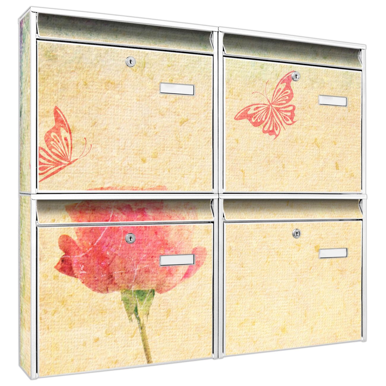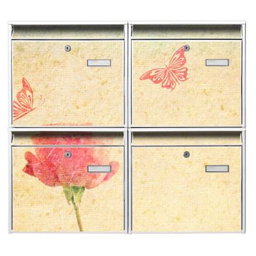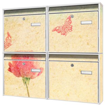FUNKTION: Die Burg-Wächter Briefkastenanlage mit Motiv Romantik bietet Ihnen ausreichend Fassungsvermögen um auch A4 und C4 Sendungen zu empfangen. Das integrierte Namensschild lässt sich individuell beschriften. Wählen Sie aus den Grundfarben weiß, silber und schwarz. DESIGN: Die 4 Briefkästen haben ein ansprechendes und zeitloses Design, ohne dabei auf Funktionalität zu verzichten. Das Material ist sehr stabil, wetterfest und rostfrei. Durch das Motiv Romantik werden die Postkästen zu einem Blickfang. DETAILS: Die Postkästen bestehen aus verzinktem Stahl der zusätzlich mit Klarlack versiegelt wurde. Die Kästen sind gesamt 64,5cm hoch, 72,5cm breit und 10cm tief. Das Motiv besteht aus einer wetter- und UV-festen Folie, die Ihren Briefkasten zusätzlich vor Kratzern schützt. Die Postkästen werden mit Montagematerial, je einem Namensschild und je zwei Schlüsseln geliefert. NUTZEN: Das Briefkastenset eignet sich für die Wandmontage, die Größe bietet genügend Platz für Sendungen aller Art. Das zeitlose Design sowie die stabile Bauart bieten Ihnen einen treuen Begleiter für Ihre Post. BANJADO: