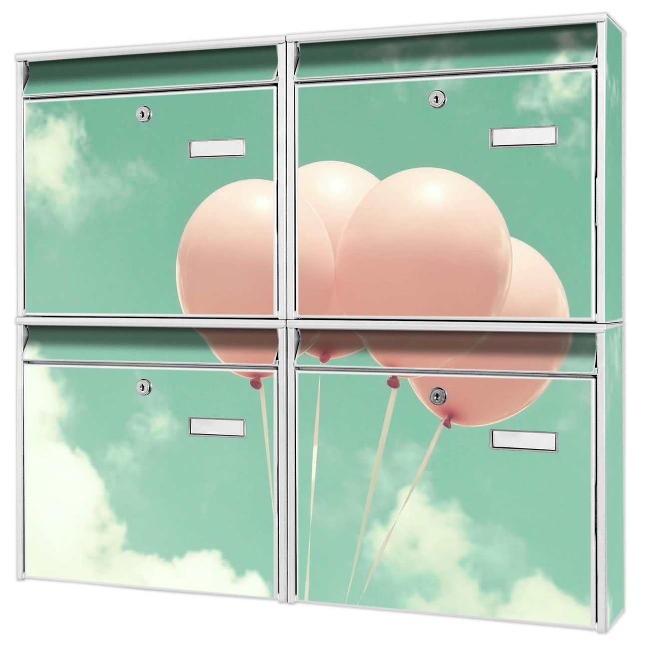 FUNKTION: Die Burg-Wächter Briefkastenanlage mit Motiv Rosa Ballons bietet Ihnen ausreichend Fassungsvermögen um auch A4 und C4 Sendungen zu empfangen. Das integrierte Namensschild lässt sich individuell beschriften. Wählen Sie aus den Grundfarben weiß, silber und schwarz. DESIGN: Die 4 Briefkästen haben ein ansprechendes und zeitloses Design, ohne dabei auf Funktionalität zu verzichten. Das Material ist sehr stabil, wetterfest und rostfrei. Durch das Motiv Rosa Ballons werden die Postkästen zu einem Blickfang. DETAILS: Die Postkästen bestehen aus verzinktem Stahl der zusätzlich mit Klarlack versiegelt wurde. Die Kästen sind gesamt 64,5cm hoch, 72,5cm breit und 10cm tief. Das Motiv besteht aus einer wetter- und UV-festen Folie, die Ihren Briefkasten zusätzlich vor Kratzern schützt. Die Postkästen werden mit Montagematerial, je einem Namensschild und je zwei Schlüsseln geliefert. NUTZEN: Das Briefkastenset eignet sich für die Wandmontage, die Größe bietet genügend Platz für Sendungen aller Art. Das zeitlose Design sowie die stabile Bauart bieten Ihnen einen treuen Begleiter für Ihre Post. BANJADO: