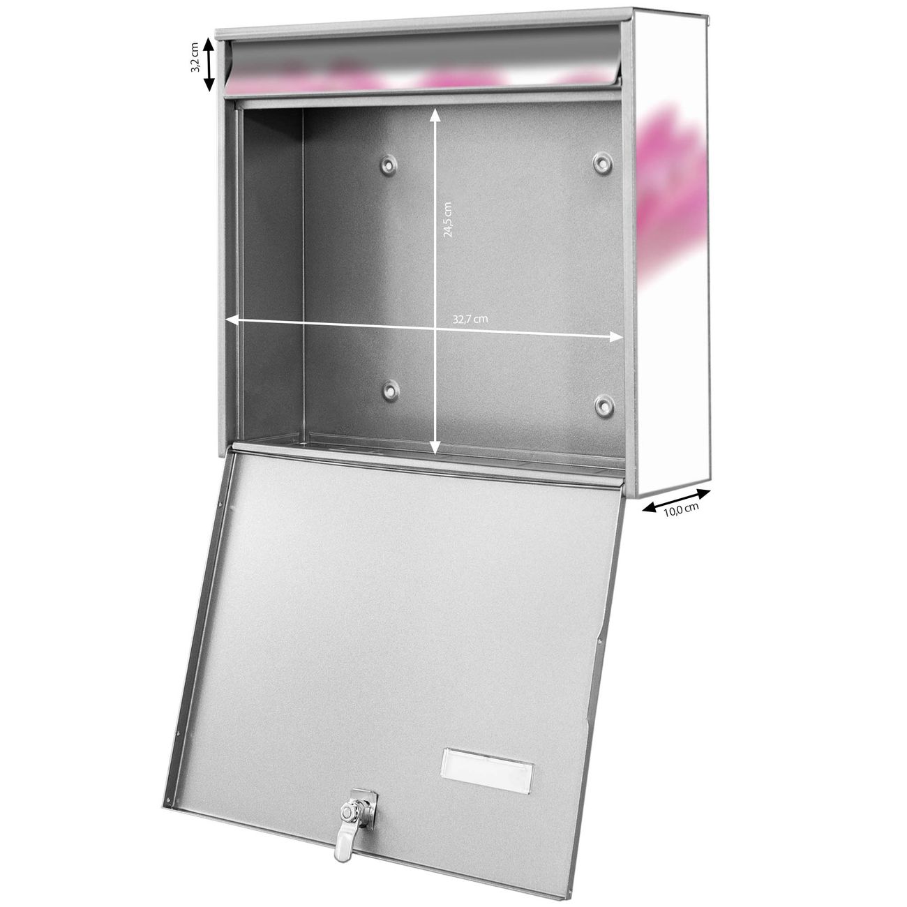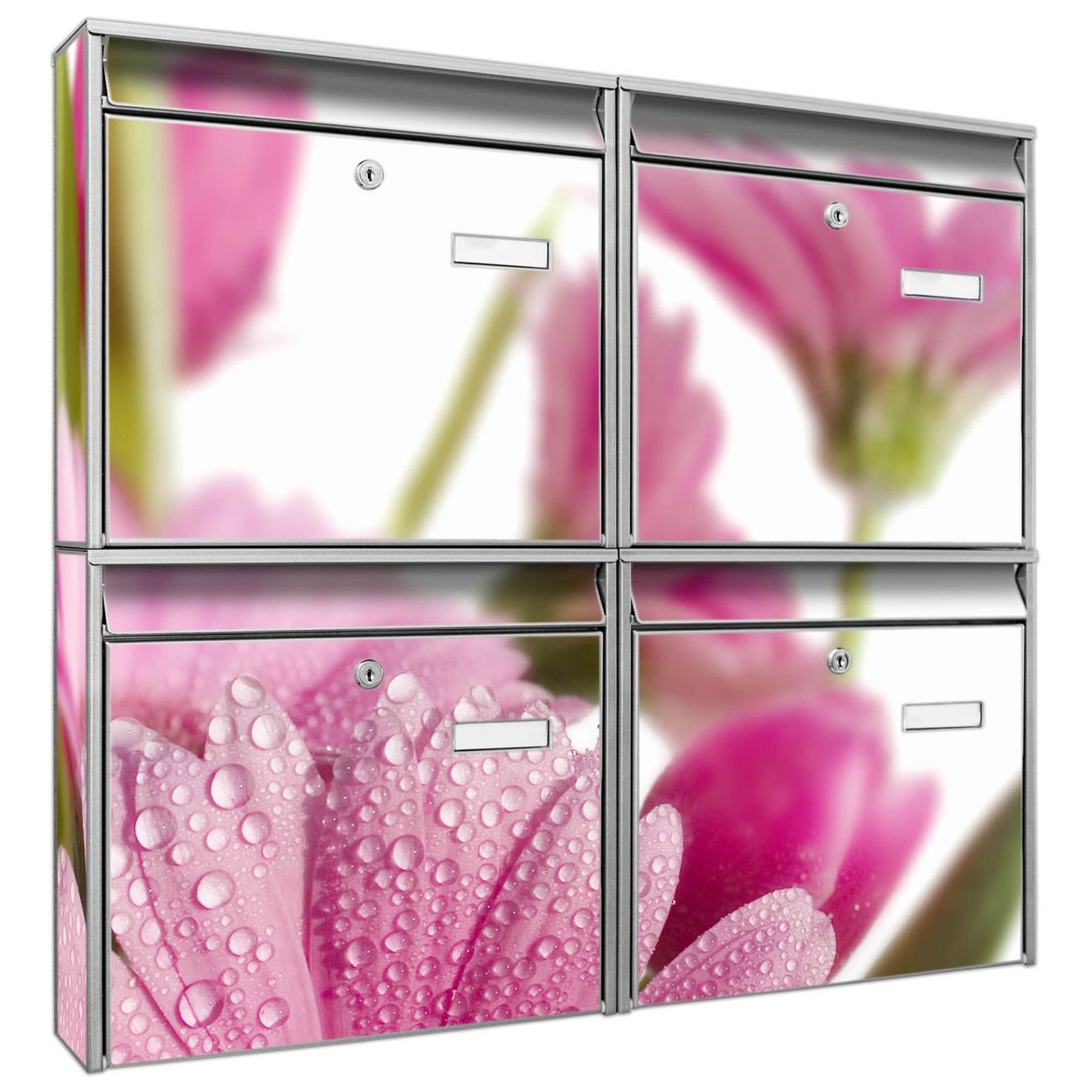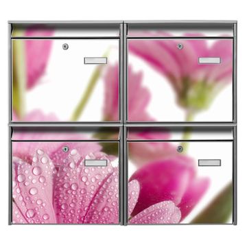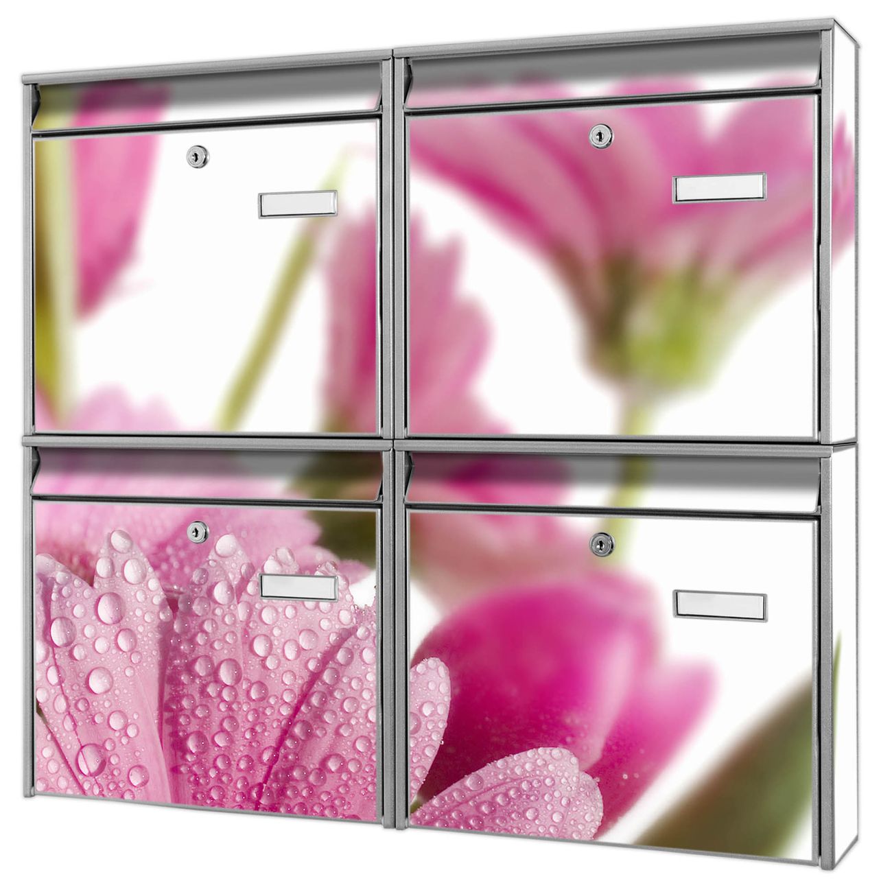 FUNKTION: Die Burg-Wächter Briefkastenanlage mit Motiv Rosa Gerbera bietet Ihnen ausreichend Fassungsvermögen um auch A4 und C4 Sendungen zu empfangen. Das integrierte Namensschild lässt sich individuell beschriften. Wählen Sie aus den Grundfarben weiß, silber und schwarz. DESIGN: Die 4 Briefkästen haben ein ansprechendes und zeitloses Design, ohne dabei auf Funktionalität zu verzichten. Das Material ist sehr stabil, wetterfest und rostfrei. Durch das Motiv Rosa Gerbera werden die Postkästen zu einem Blickfang. DETAILS: Die Postkästen bestehen aus verzinktem Stahl der zusätzlich mit Klarlack versiegelt wurde. Die Kästen sind gesamt 64,5cm hoch, 72,5cm breit und 10cm tief. Das Motiv besteht aus einer wetter- und UV-festen Folie, die Ihren Briefkasten zusätzlich vor Kratzern schützt. Die Postkästen werden mit Montagematerial, je einem Namensschild und je zwei Schlüsseln geliefert. NUTZEN: Das Briefkastenset eignet sich für die Wandmontage, die Größe bietet genügend Platz für Sendungen aller Art. Das zeitlose Design sowie die stabile Bauart bieten Ihnen einen treuen Begleiter für Ihre Post. BANJADO: