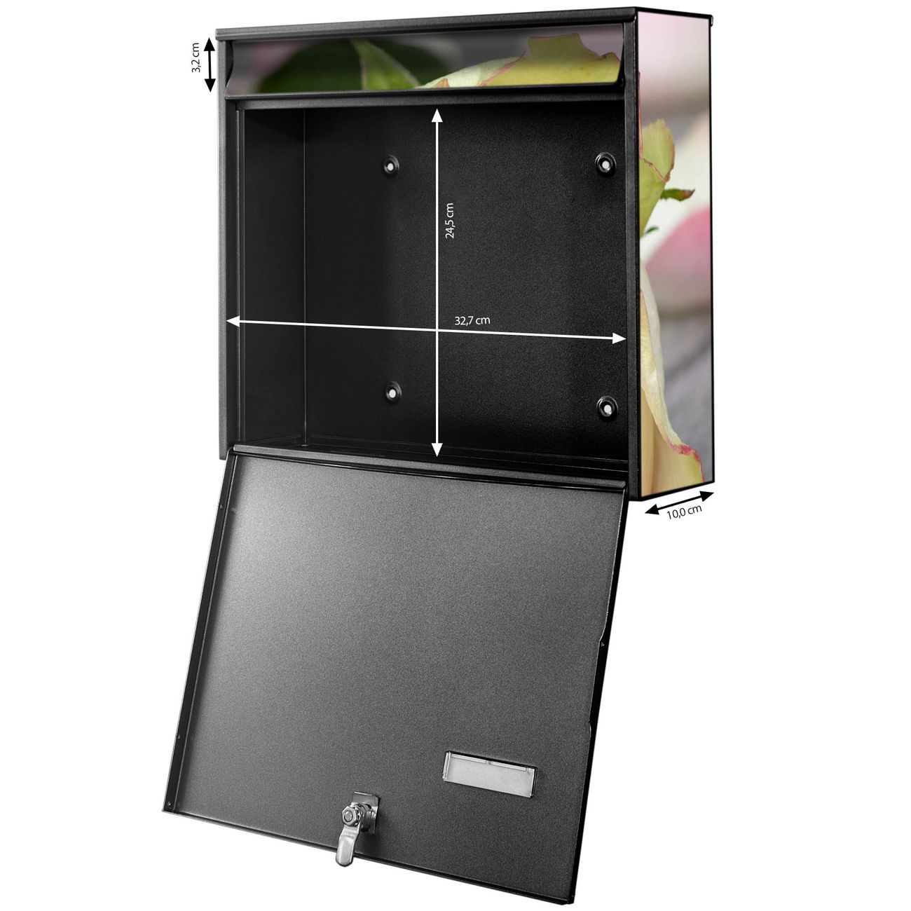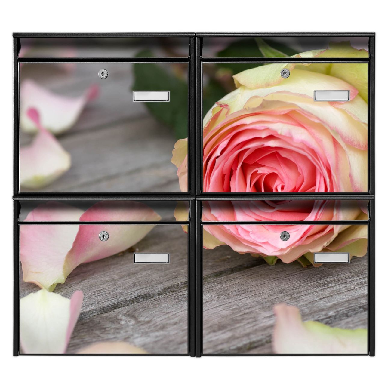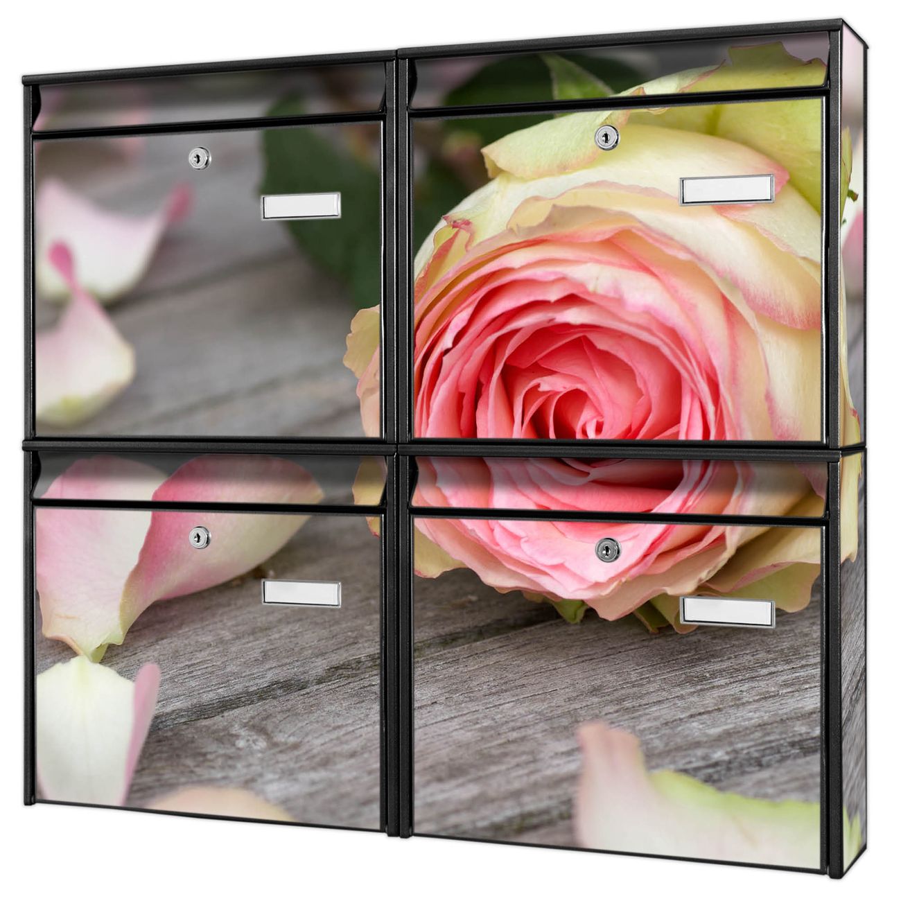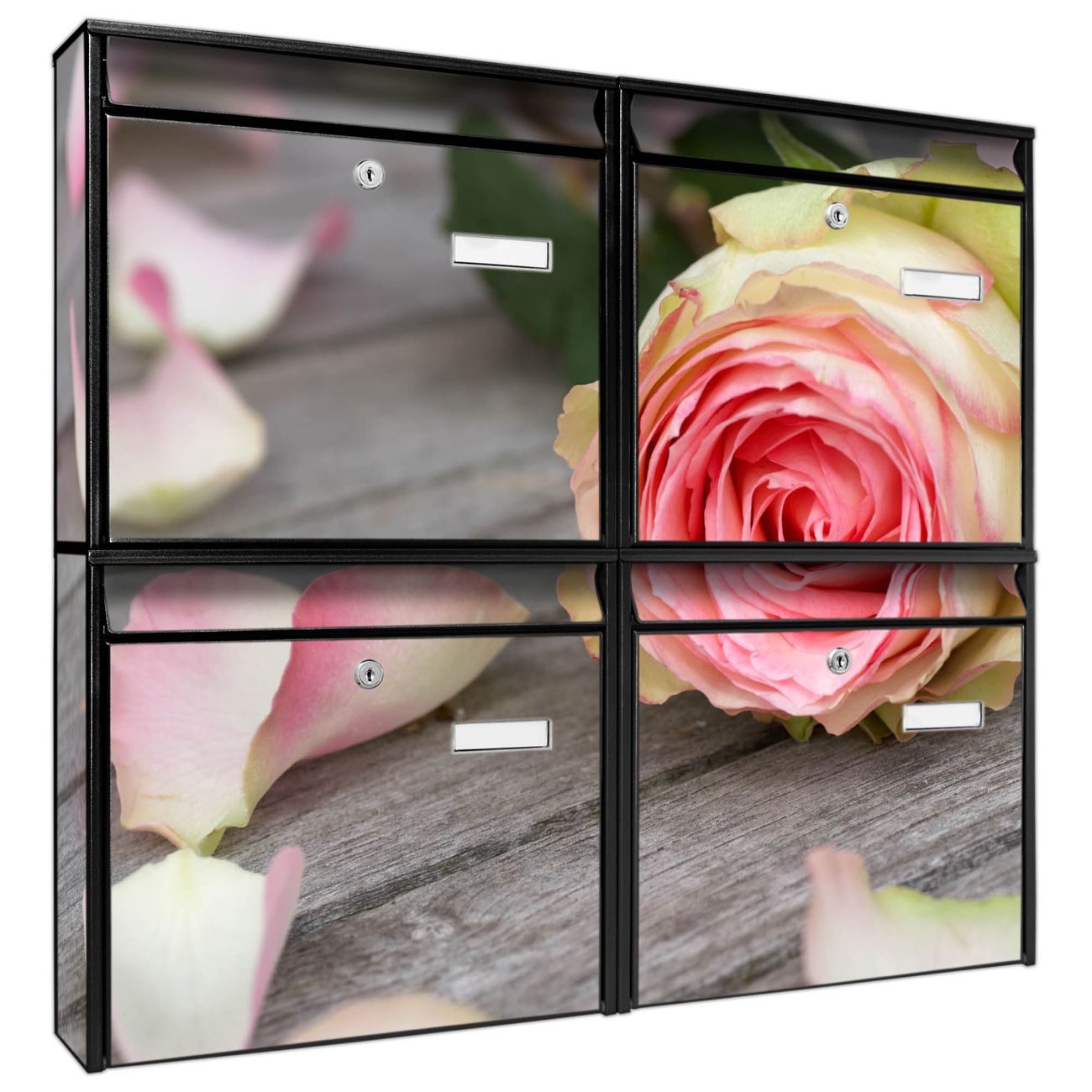 FUNKTION: Die Burg-Wächter Briefkastenanlage mit Motiv Rosa Rose bietet Ihnen ausreichend Fassungsvermögen um auch A4 und C4 Sendungen zu empfangen. Das integrierte Namensschild lässt sich individuell beschriften. Wählen Sie aus den Grundfarben weiß, silber und schwarz. DESIGN: Die 4 Briefkästen haben ein ansprechendes und zeitloses Design, ohne dabei auf Funktionalität zu verzichten. Das Material ist sehr stabil, wetterfest und rostfrei. Durch das Motiv Rosa Rose werden die Postkästen zu einem Blickfang. DETAILS: Die Postkästen bestehen aus verzinktem Stahl der zusätzlich mit Klarlack versiegelt wurde. Die Kästen sind gesamt 64,5cm hoch, 72,5cm breit und 10cm tief. Das Motiv besteht aus einer wetter- und UV-festen Folie, die Ihren Briefkasten zusätzlich vor Kratzern schützt. Die Postkästen werden mit Montagematerial, je einem Namensschild und je zwei Schlüsseln geliefert. NUTZEN: Das Briefkastenset eignet sich für die Wandmontage, die Größe bietet genügend Platz für Sendungen aller Art. Das zeitlose Design sowie die stabile Bauart bieten Ihnen einen treuen Begleiter für Ihre Post. BANJADO: