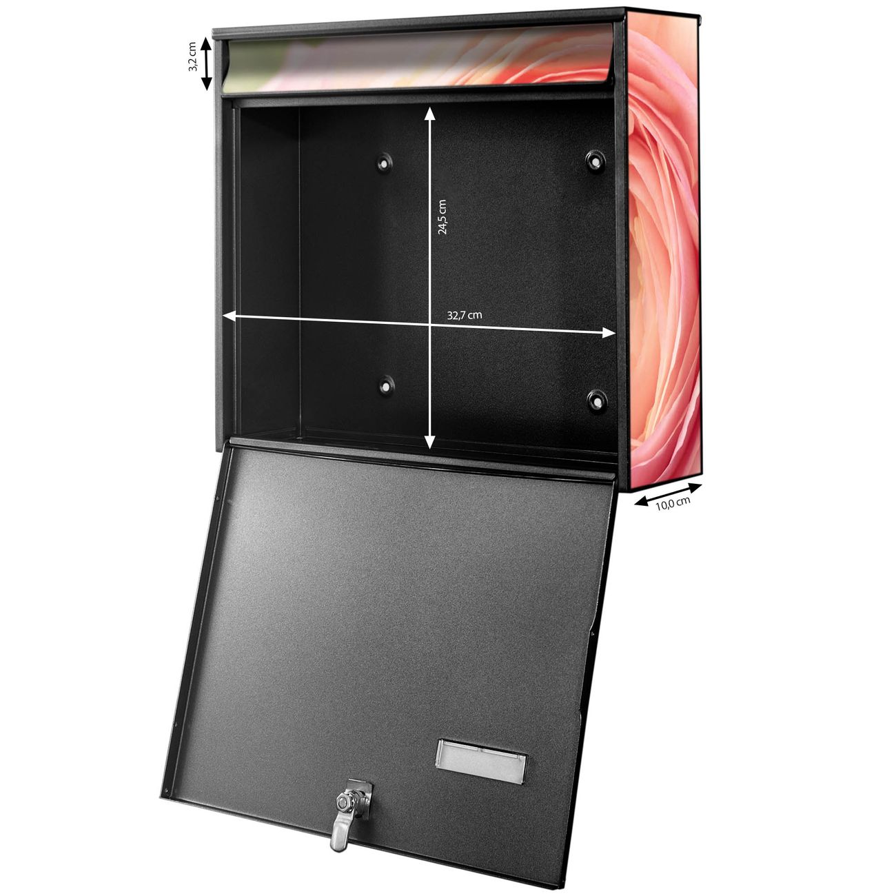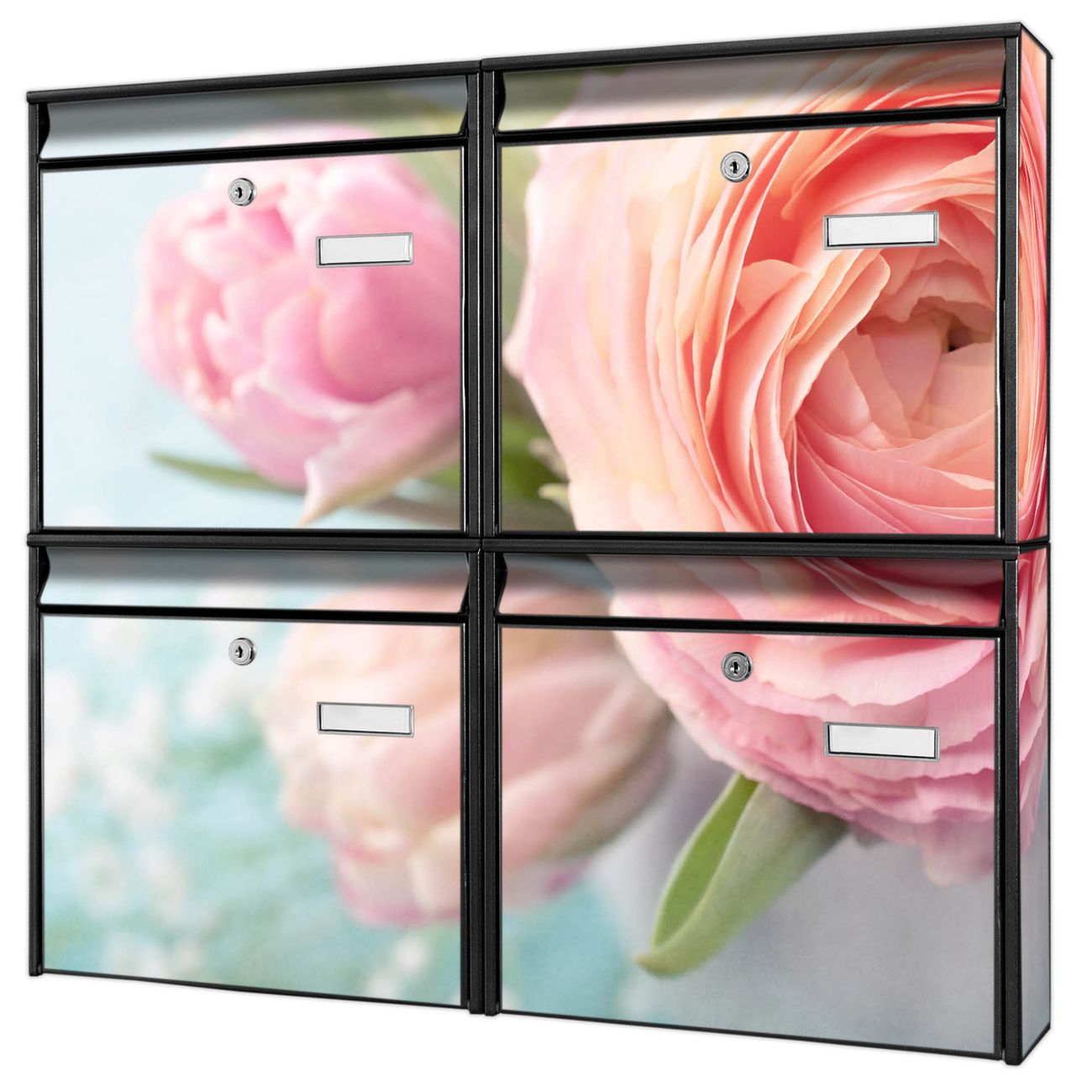 FUNKTION: Die Burg-Wächter Briefkastenanlage mit Motiv Rosa Tulpe bietet Ihnen ausreichend Fassungsvermögen um auch A4 und C4 Sendungen zu empfangen. Das integrierte Namensschild lässt sich individuell beschriften. Wählen Sie aus den Grundfarben weiß, silber und schwarz. DESIGN: Die 4 Briefkästen haben ein ansprechendes und zeitloses Design, ohne dabei auf Funktionalität zu verzichten. Das Material ist sehr stabil, wetterfest und rostfrei. Durch das Motiv Rosa Tulpe werden die Postkästen zu einem Blickfang. DETAILS: Die Postkästen bestehen aus verzinktem Stahl der zusätzlich mit Klarlack versiegelt wurde. Die Kästen sind gesamt 64,5cm hoch, 72,5cm breit und 10cm tief. Das Motiv besteht aus einer wetter- und UV-festen Folie, die Ihren Briefkasten zusätzlich vor Kratzern schützt. Die Postkästen werden mit Montagematerial, je einem Namensschild und je zwei Schlüsseln geliefert. NUTZEN: Das Briefkastenset eignet sich für die Wandmontage, die Größe bietet genügend Platz für Sendungen aller Art. Das zeitlose Design sowie die stabile Bauart bieten Ihnen einen treuen Begleiter für Ihre Post. BANJADO: