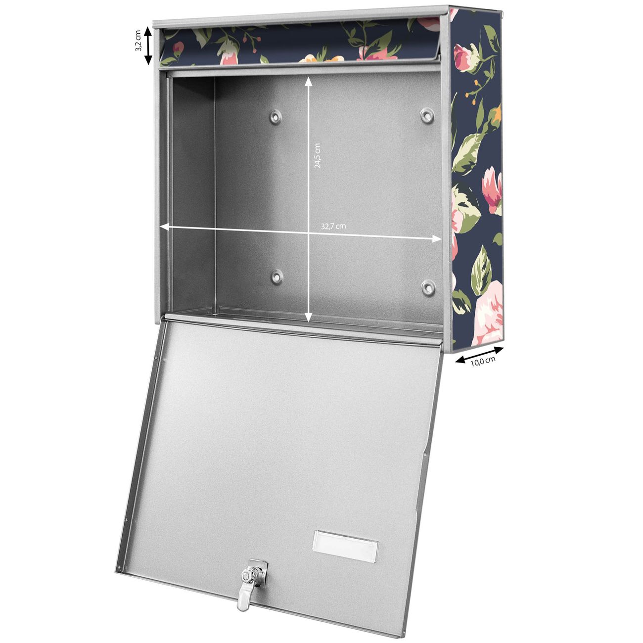 FUNKTION: Die Burg-Wächter Briefkastenanlage mit Motiv Rosen Auf Anthrazit bietet Ihnen ausreichend Fassungsvermögen um auch A4 und C4 Sendungen zu empfangen. Das integrierte Namensschild lässt sich individuell beschriften. Wählen Sie aus den Grundfarben weiß, silber und schwarz. DESIGN: Die 4 Briefkästen haben ein ansprechendes und zeitloses Design, ohne dabei auf Funktionalität zu verzichten. Das Material ist sehr stabil, wetterfest und rostfrei. Durch das Motiv Rosen Auf Anthrazit werden die Postkästen zu einem Blickfang. DETAILS: Die Postkästen bestehen aus verzinktem Stahl der zusätzlich mit Klarlack versiegelt wurde. Die Kästen sind gesamt 64,5cm hoch, 72,5cm breit und 10cm tief. Das Motiv besteht aus einer wetter- und UV-festen Folie, die Ihren Briefkasten zusätzlich vor Kratzern schützt. Die Postkästen werden mit Montagematerial, je einem Namensschild und je zwei Schlüsseln geliefert. NUTZEN: Das Briefkastenset eignet sich für die Wandmontage, die Größe bietet genügend Platz für Sendungen aller Art. Das zeitlose Design sowie die stabile Bauart bieten Ihnen einen treuen Begleiter für Ihre Post. BANJADO: