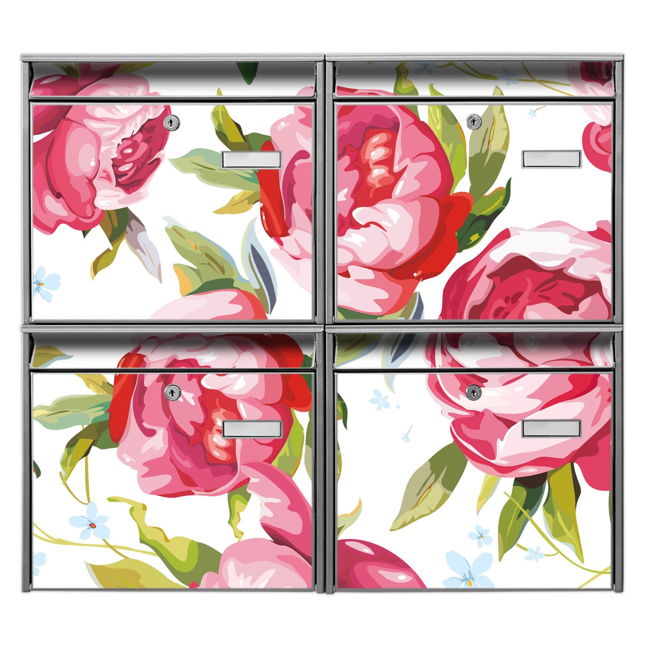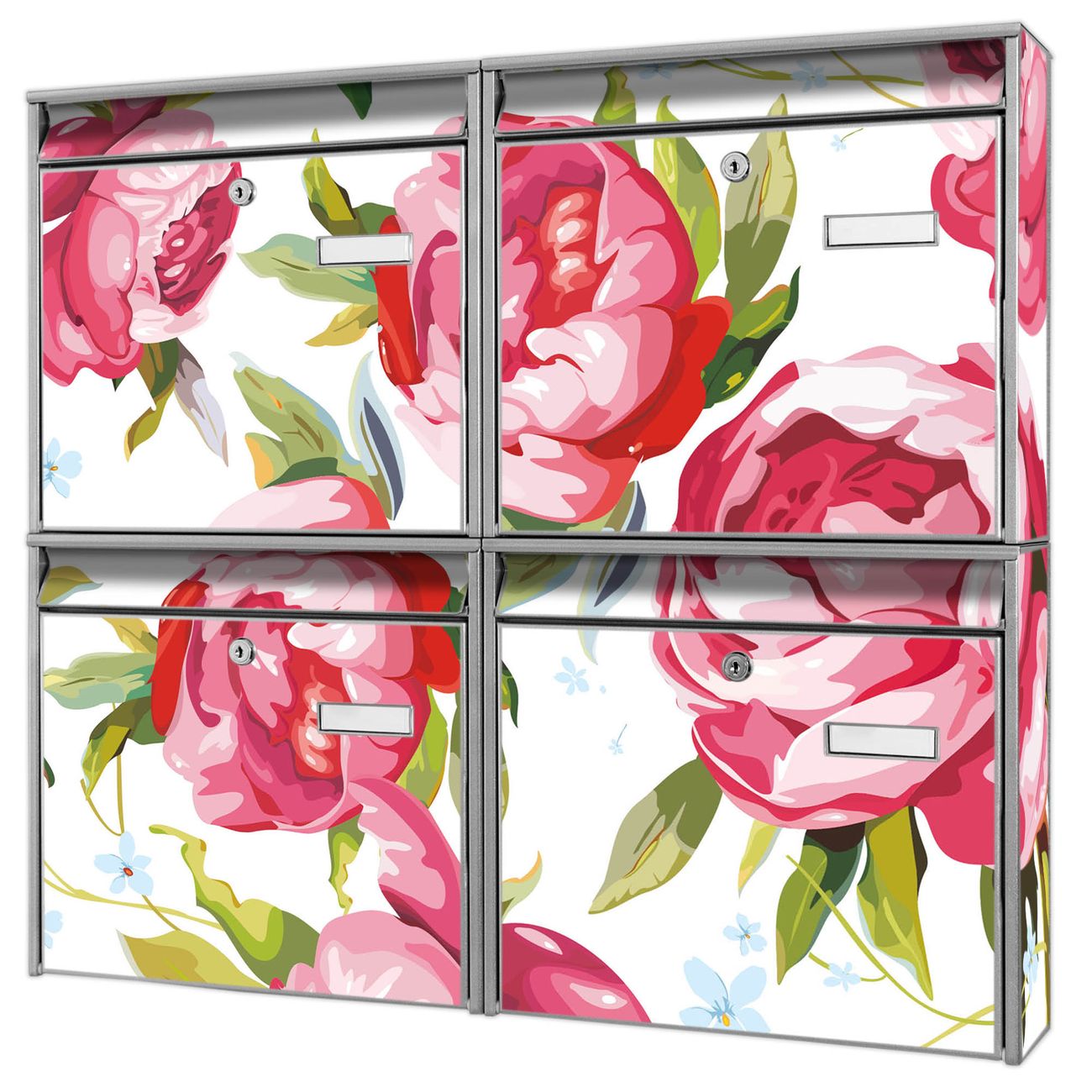 FUNKTION: Die Burg-Wächter Briefkastenanlage mit Motiv Rosen Rustikal bietet Ihnen ausreichend Fassungsvermögen um auch A4 und C4 Sendungen zu empfangen. Das integrierte Namensschild lässt sich individuell beschriften. Wählen Sie aus den Grundfarben weiß, silber und schwarz. DESIGN: Die 4 Briefkästen haben ein ansprechendes und zeitloses Design, ohne dabei auf Funktionalität zu verzichten. Das Material ist sehr stabil, wetterfest und rostfrei. Durch das Motiv Rosen Rustikal werden die Postkästen zu einem Blickfang. DETAILS: Die Postkästen bestehen aus verzinktem Stahl der zusätzlich mit Klarlack versiegelt wurde. Die Kästen sind gesamt 64,5cm hoch, 72,5cm breit und 10cm tief. Das Motiv besteht aus einer wetter- und UV-festen Folie, die Ihren Briefkasten zusätzlich vor Kratzern schützt. Die Postkästen werden mit Montagematerial, je einem Namensschild und je zwei Schlüsseln geliefert. NUTZEN: Das Briefkastenset eignet sich für die Wandmontage, die Größe bietet genügend Platz für Sendungen aller Art. Das zeitlose Design sowie die stabile Bauart bieten Ihnen einen treuen Begleiter für Ihre Post. BANJADO: