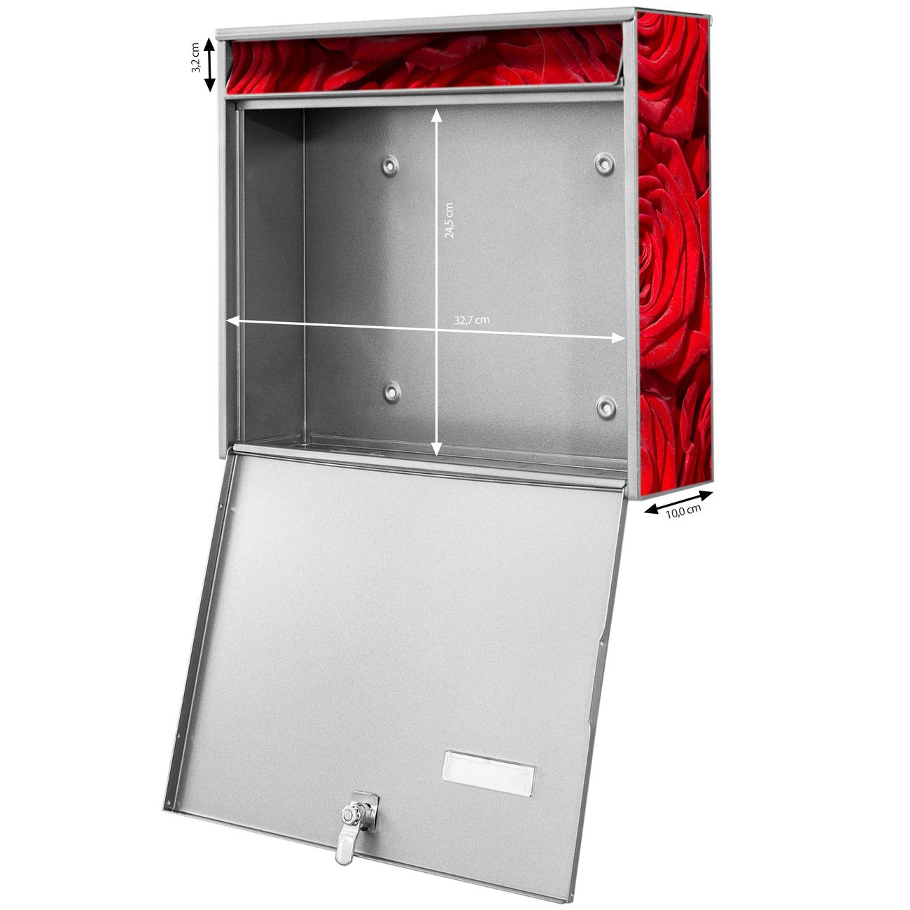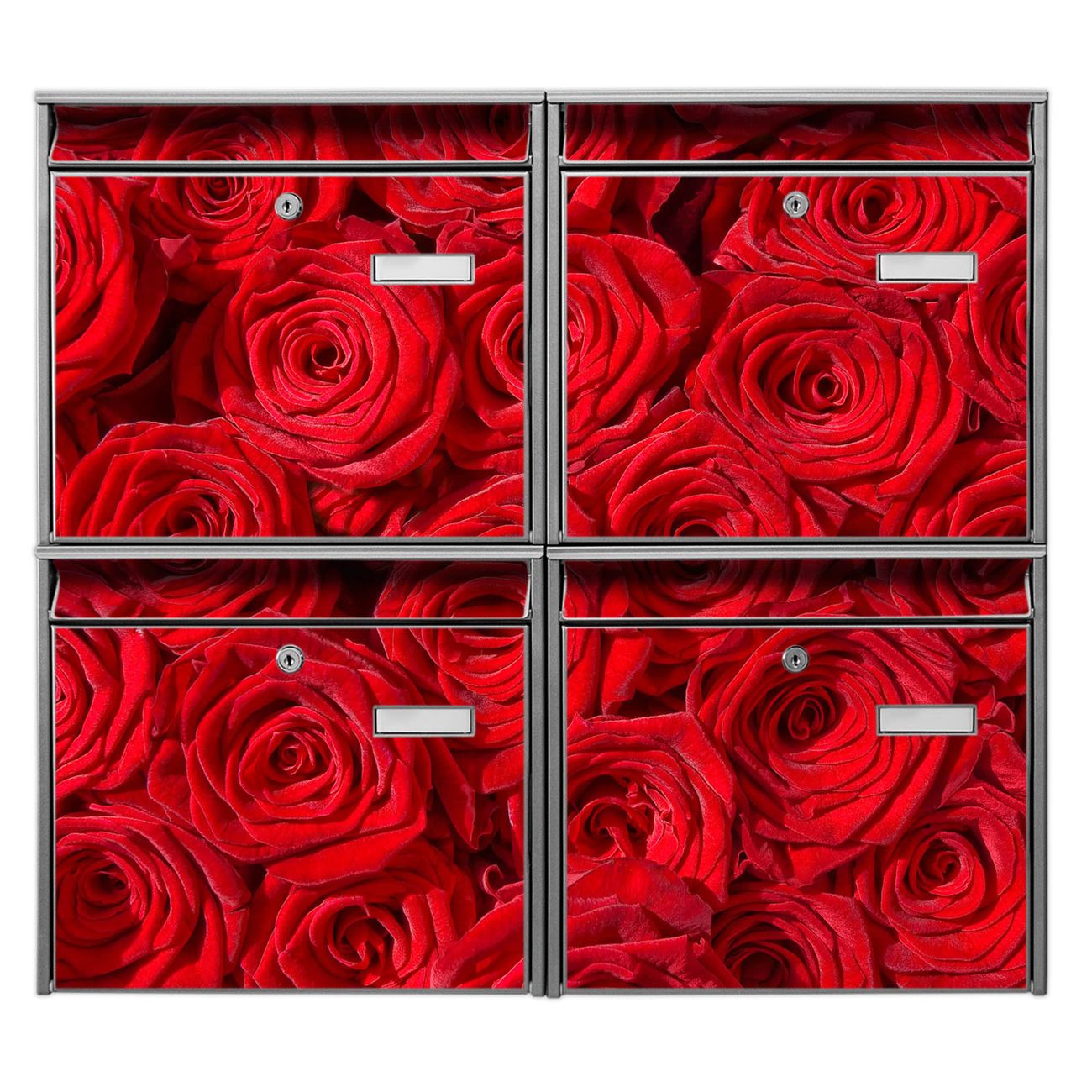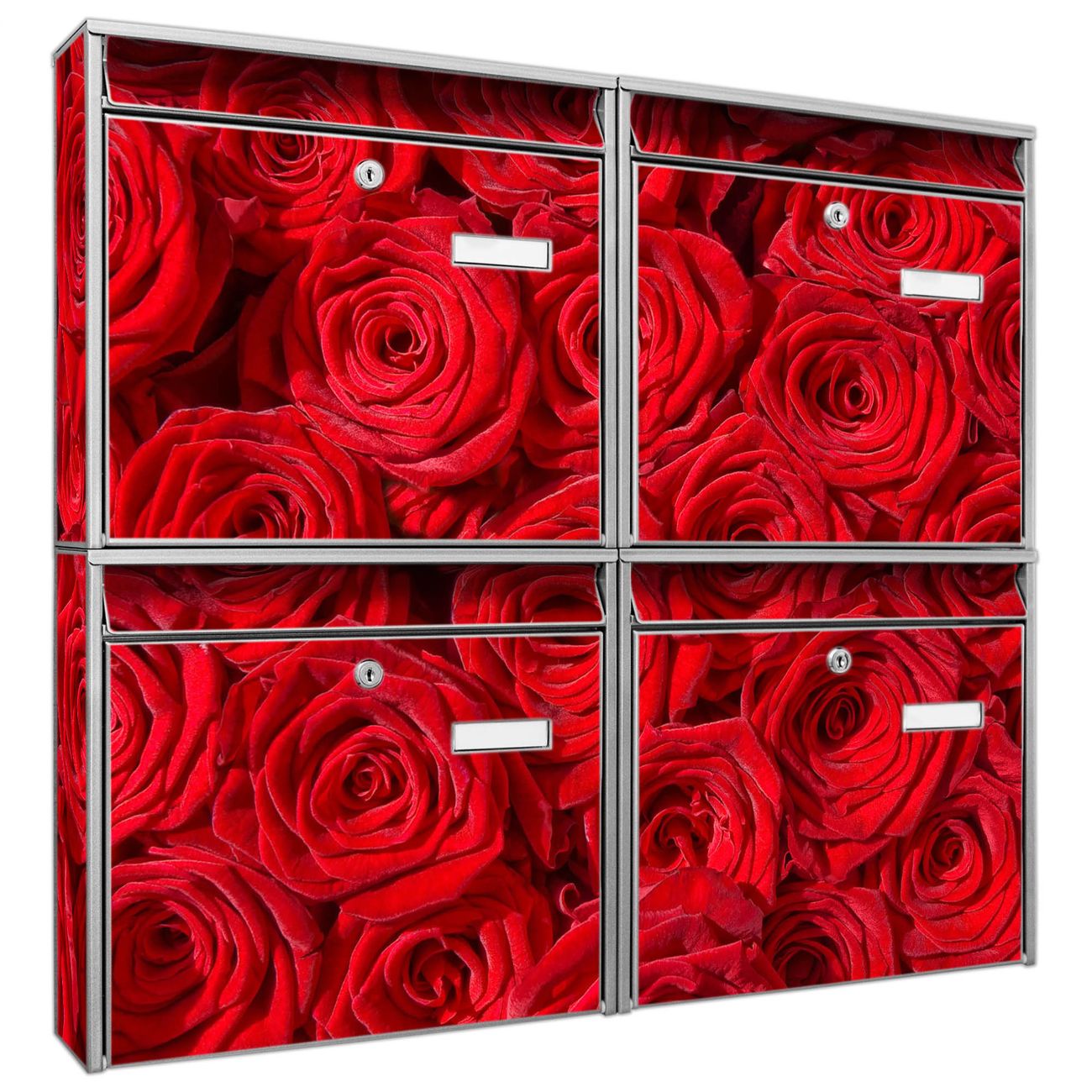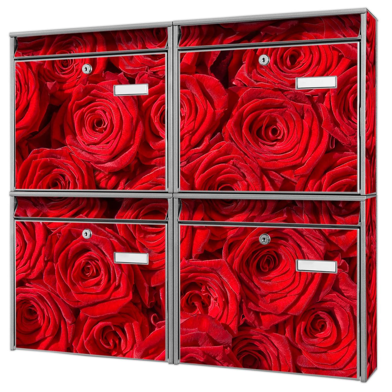 FUNKTION: Die Burg-Wächter Briefkastenanlage mit Motiv Rosenbett bietet Ihnen ausreichend Fassungsvermögen um auch A4 und C4 Sendungen zu empfangen. Das integrierte Namensschild lässt sich individuell beschriften. Wählen Sie aus den Grundfarben weiß, silber und schwarz. DESIGN: Die 4 Briefkästen haben ein ansprechendes und zeitloses Design, ohne dabei auf Funktionalität zu verzichten. Das Material ist sehr stabil, wetterfest und rostfrei. Durch das Motiv Rosenbett werden die Postkästen zu einem Blickfang. DETAILS: Die Postkästen bestehen aus verzinktem Stahl der zusätzlich mit Klarlack versiegelt wurde. Die Kästen sind gesamt 64,5cm hoch, 72,5cm breit und 10cm tief. Das Motiv besteht aus einer wetter- und UV-festen Folie, die Ihren Briefkasten zusätzlich vor Kratzern schützt. Die Postkästen werden mit Montagematerial, je einem Namensschild und je zwei Schlüsseln geliefert. NUTZEN: Das Briefkastenset eignet sich für die Wandmontage, die Größe bietet genügend Platz für Sendungen aller Art. Das zeitlose Design sowie die stabile Bauart bieten Ihnen einen treuen Begleiter für Ihre Post. BANJADO: