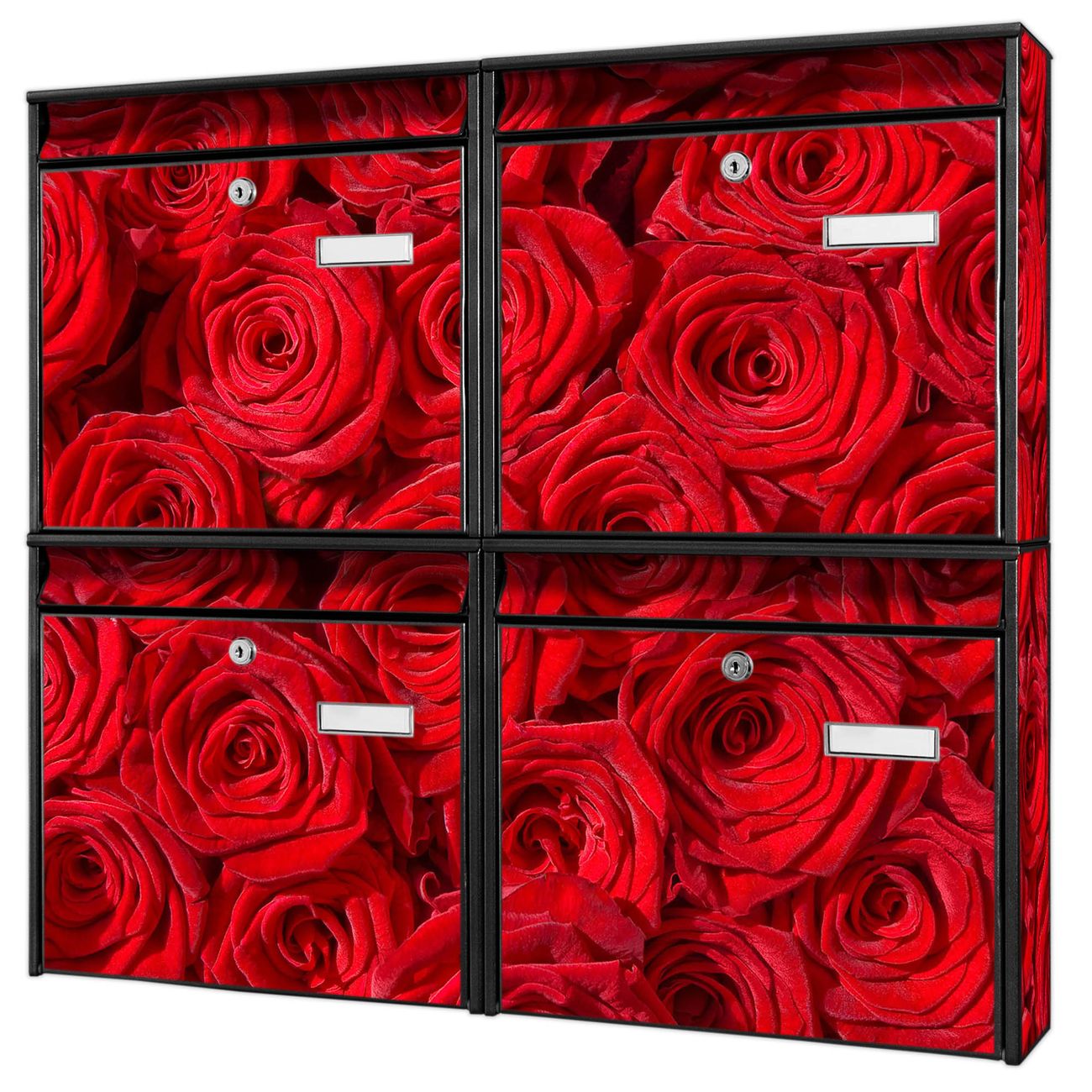 FUNKTION: Die Burg-Wächter Briefkastenanlage mit Motiv Rosenbett bietet Ihnen ausreichend Fassungsvermögen um auch A4 und C4 Sendungen zu empfangen. Das integrierte Namensschild lässt sich individuell beschriften. Wählen Sie aus den Grundfarben weiß, silber und schwarz. DESIGN: Die 4 Briefkästen haben ein ansprechendes und zeitloses Design, ohne dabei auf Funktionalität zu verzichten. Das Material ist sehr stabil, wetterfest und rostfrei. Durch das Motiv Rosenbett werden die Postkästen zu einem Blickfang. DETAILS: Die Postkästen bestehen aus verzinktem Stahl der zusätzlich mit Klarlack versiegelt wurde. Die Kästen sind gesamt 64,5cm hoch, 72,5cm breit und 10cm tief. Das Motiv besteht aus einer wetter- und UV-festen Folie, die Ihren Briefkasten zusätzlich vor Kratzern schützt. Die Postkästen werden mit Montagematerial, je einem Namensschild und je zwei Schlüsseln geliefert. NUTZEN: Das Briefkastenset eignet sich für die Wandmontage, die Größe bietet genügend Platz für Sendungen aller Art. Das zeitlose Design sowie die stabile Bauart bieten Ihnen einen treuen Begleiter für Ihre Post. BANJADO: