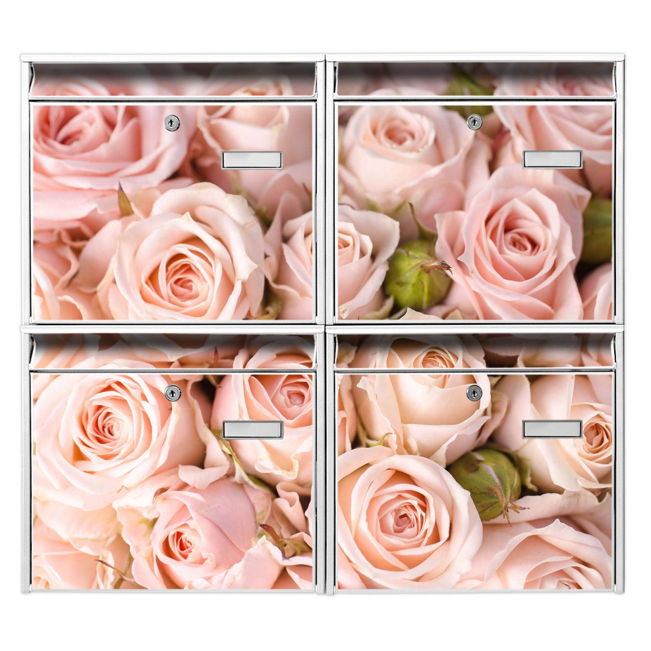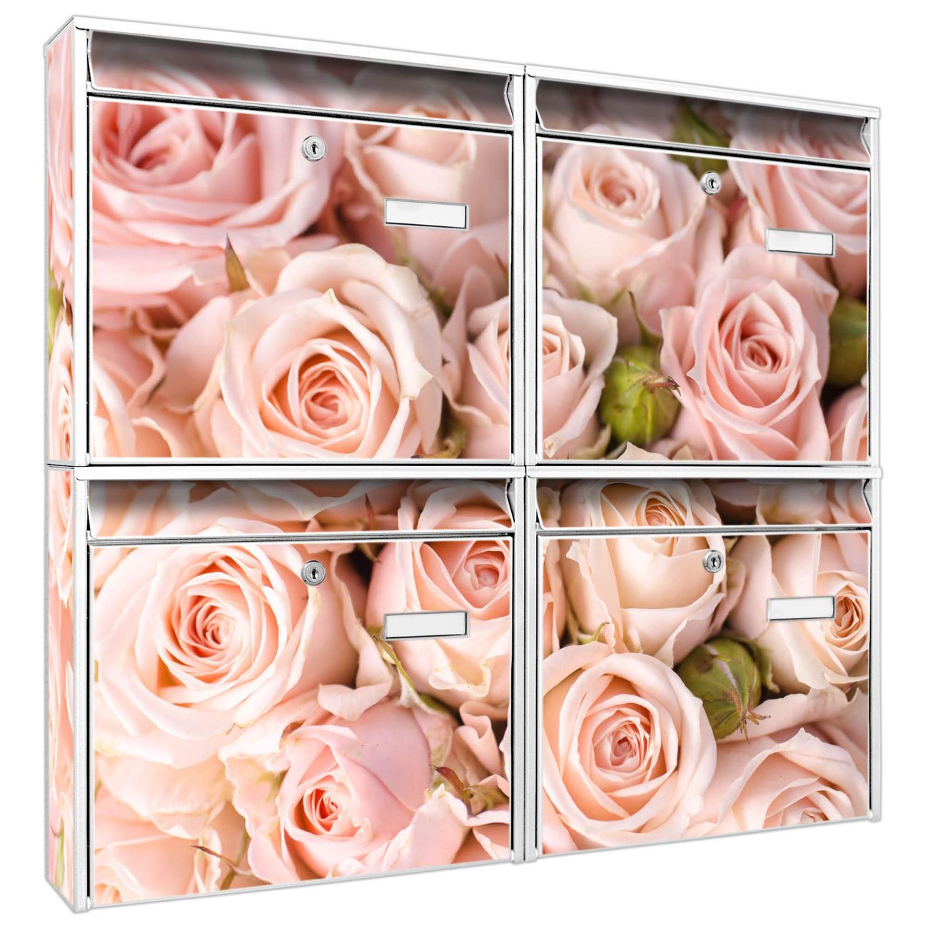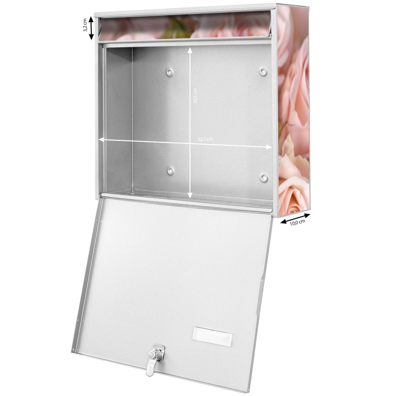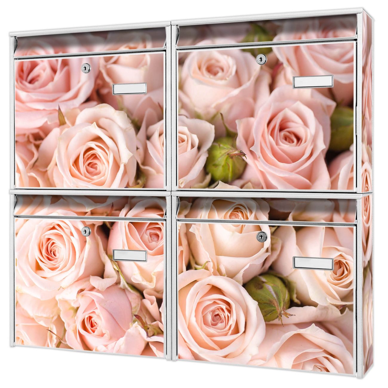 FUNKTION: Die Burg-Wächter Briefkastenanlage mit Motiv Rosenbouquet bietet Ihnen ausreichend Fassungsvermögen um auch A4 und C4 Sendungen zu empfangen. Das integrierte Namensschild lässt sich individuell beschriften. Wählen Sie aus den Grundfarben weiß, silber und schwarz. DESIGN: Die 4 Briefkästen haben ein ansprechendes und zeitloses Design, ohne dabei auf Funktionalität zu verzichten. Das Material ist sehr stabil, wetterfest und rostfrei. Durch das Motiv Rosenbouquet werden die Postkästen zu einem Blickfang. DETAILS: Die Postkästen bestehen aus verzinktem Stahl der zusätzlich mit Klarlack versiegelt wurde. Die Kästen sind gesamt 64,5cm hoch, 72,5cm breit und 10cm tief. Das Motiv besteht aus einer wetter- und UV-festen Folie, die Ihren Briefkasten zusätzlich vor Kratzern schützt. Die Postkästen werden mit Montagematerial, je einem Namensschild und je zwei Schlüsseln geliefert. NUTZEN: Das Briefkastenset eignet sich für die Wandmontage, die Größe bietet genügend Platz für Sendungen aller Art. Das zeitlose Design sowie die stabile Bauart bieten Ihnen einen treuen Begleiter für Ihre Post. BANJADO: