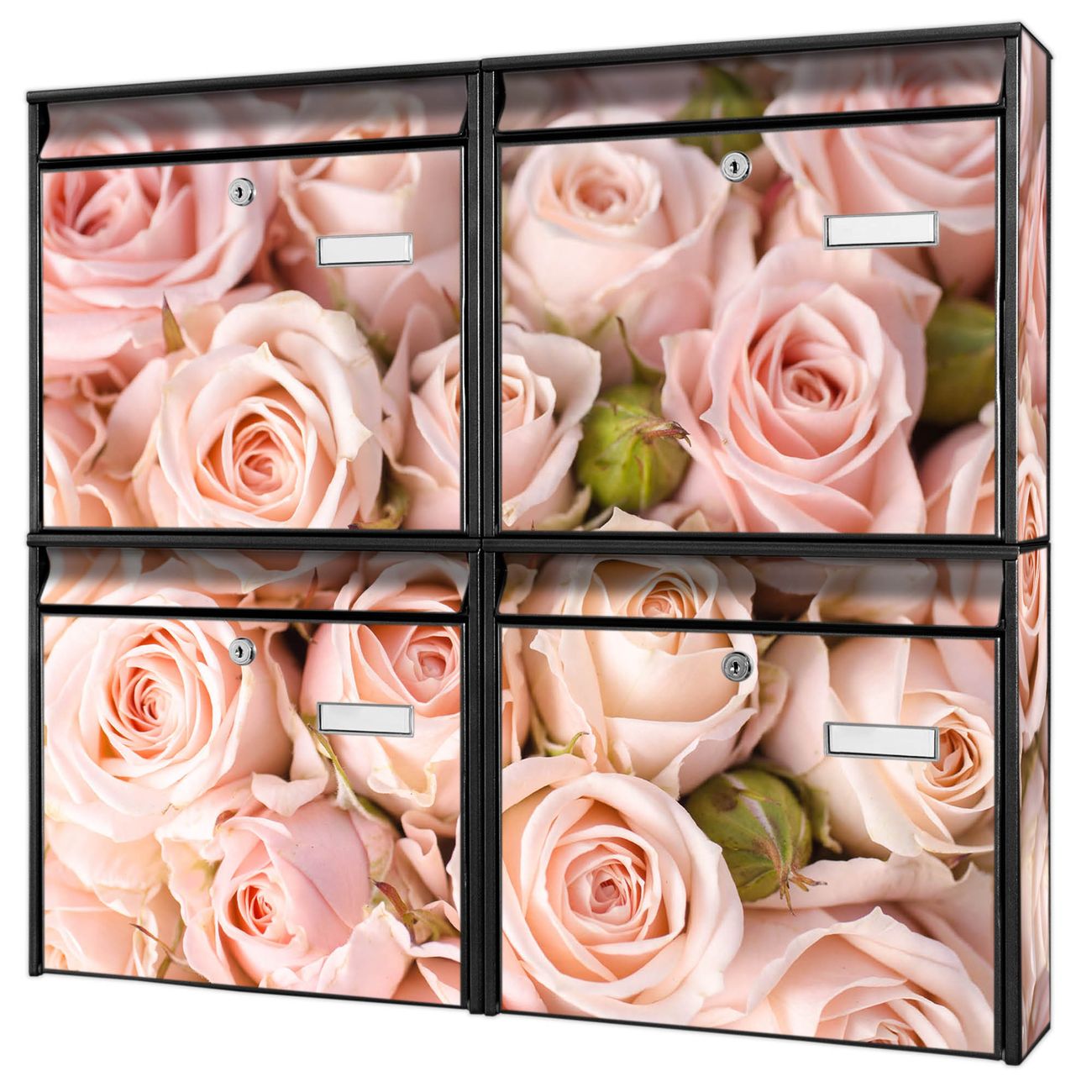 FUNKTION: Die Burg-Wächter Briefkastenanlage mit Motiv Rosenbouquet bietet Ihnen ausreichend Fassungsvermögen um auch A4 und C4 Sendungen zu empfangen. Das integrierte Namensschild lässt sich individuell beschriften. Wählen Sie aus den Grundfarben weiß, silber und schwarz. DESIGN: Die 4 Briefkästen haben ein ansprechendes und zeitloses Design, ohne dabei auf Funktionalität zu verzichten. Das Material ist sehr stabil, wetterfest und rostfrei. Durch das Motiv Rosenbouquet werden die Postkästen zu einem Blickfang. DETAILS: Die Postkästen bestehen aus verzinktem Stahl der zusätzlich mit Klarlack versiegelt wurde. Die Kästen sind gesamt 64,5cm hoch, 72,5cm breit und 10cm tief. Das Motiv besteht aus einer wetter- und UV-festen Folie, die Ihren Briefkasten zusätzlich vor Kratzern schützt. Die Postkästen werden mit Montagematerial, je einem Namensschild und je zwei Schlüsseln geliefert. NUTZEN: Das Briefkastenset eignet sich für die Wandmontage, die Größe bietet genügend Platz für Sendungen aller Art. Das zeitlose Design sowie die stabile Bauart bieten Ihnen einen treuen Begleiter für Ihre Post. BANJADO: