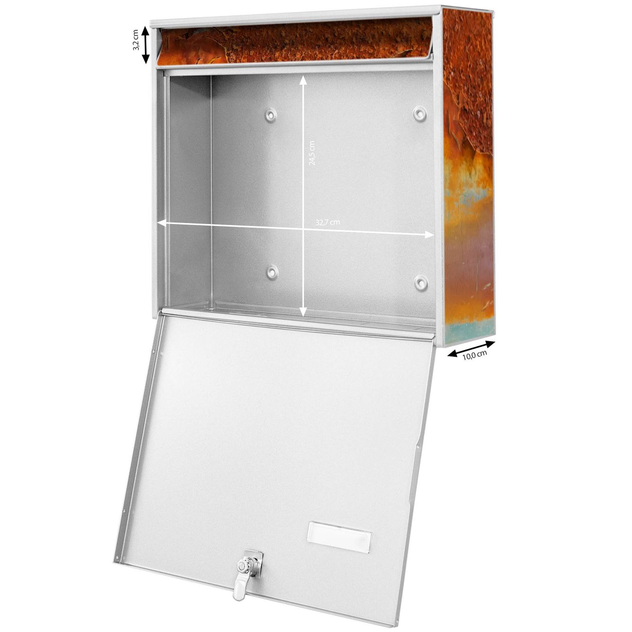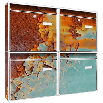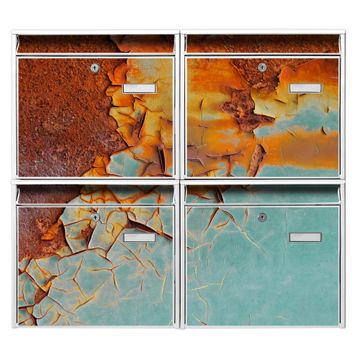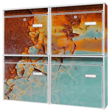 FUNKTION: Die Burg-Wächter Briefkastenanlage mit Motiv Rost und Blau bietet Ihnen ausreichend Fassungsvermögen um auch A4 und C4 Sendungen zu empfangen. Das integrierte Namensschild lässt sich individuell beschriften. Wählen Sie aus den Grundfarben weiß, silber und schwarz. DESIGN: Die 4 Briefkästen haben ein ansprechendes und zeitloses Design, ohne dabei auf Funktionalität zu verzichten. Das Material ist sehr stabil, wetterfest und rostfrei. Durch das Motiv Rost und Blau werden die Postkästen zu einem Blickfang. DETAILS: Die Postkästen bestehen aus verzinktem Stahl der zusätzlich mit Klarlack versiegelt wurde. Die Kästen sind gesamt 64,5cm hoch, 72,5cm breit und 10cm tief. Das Motiv besteht aus einer wetter- und UV-festen Folie, die Ihren Briefkasten zusätzlich vor Kratzern schützt. Die Postkästen werden mit Montagematerial, je einem Namensschild und je zwei Schlüsseln geliefert. NUTZEN: Das Briefkastenset eignet sich für die Wandmontage, die Größe bietet genügend Platz für Sendungen aller Art. Das zeitlose Design sowie die stabile Bauart bieten Ihnen einen treuen Begleiter für Ihre Post. BANJADO: