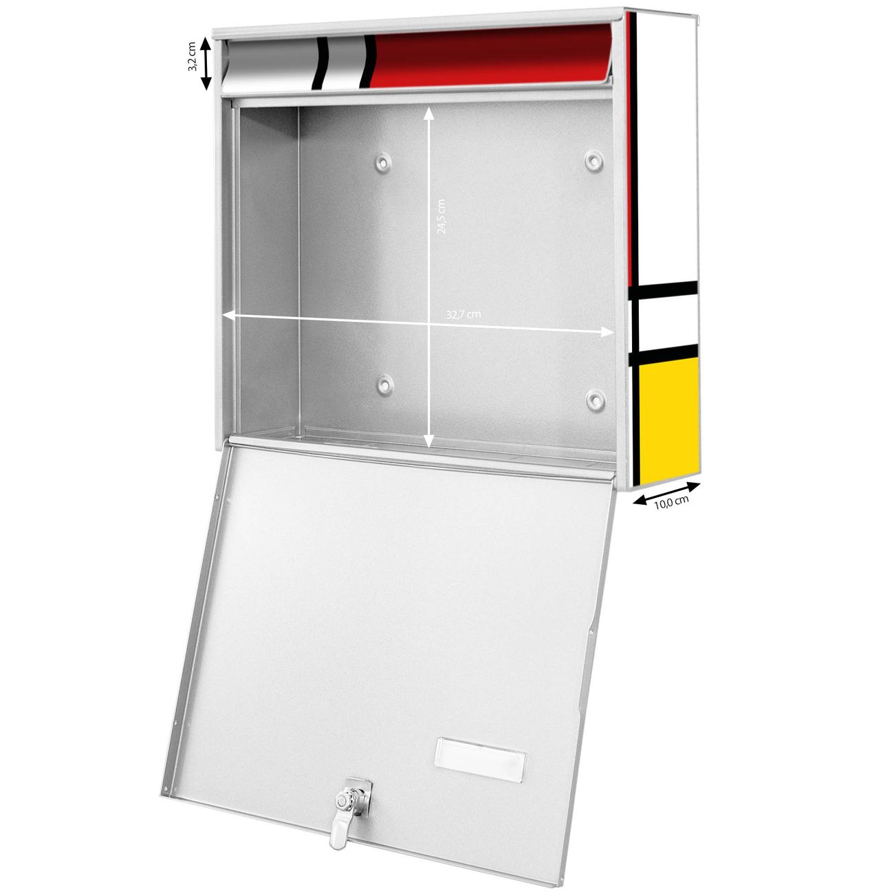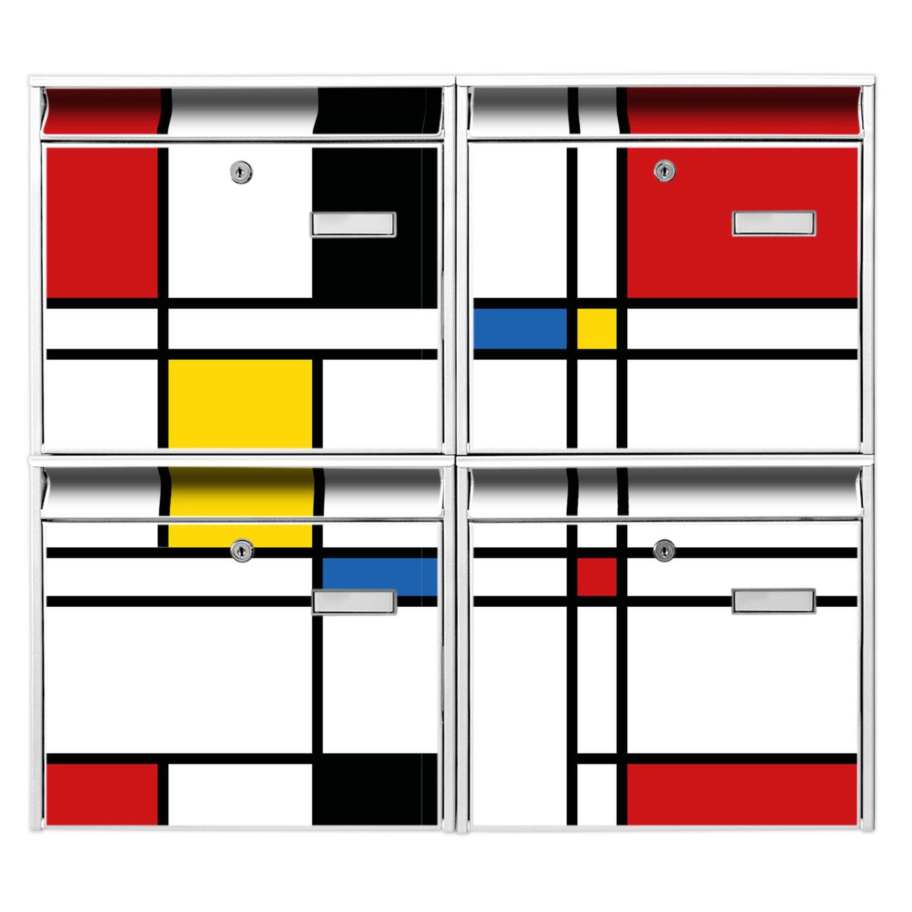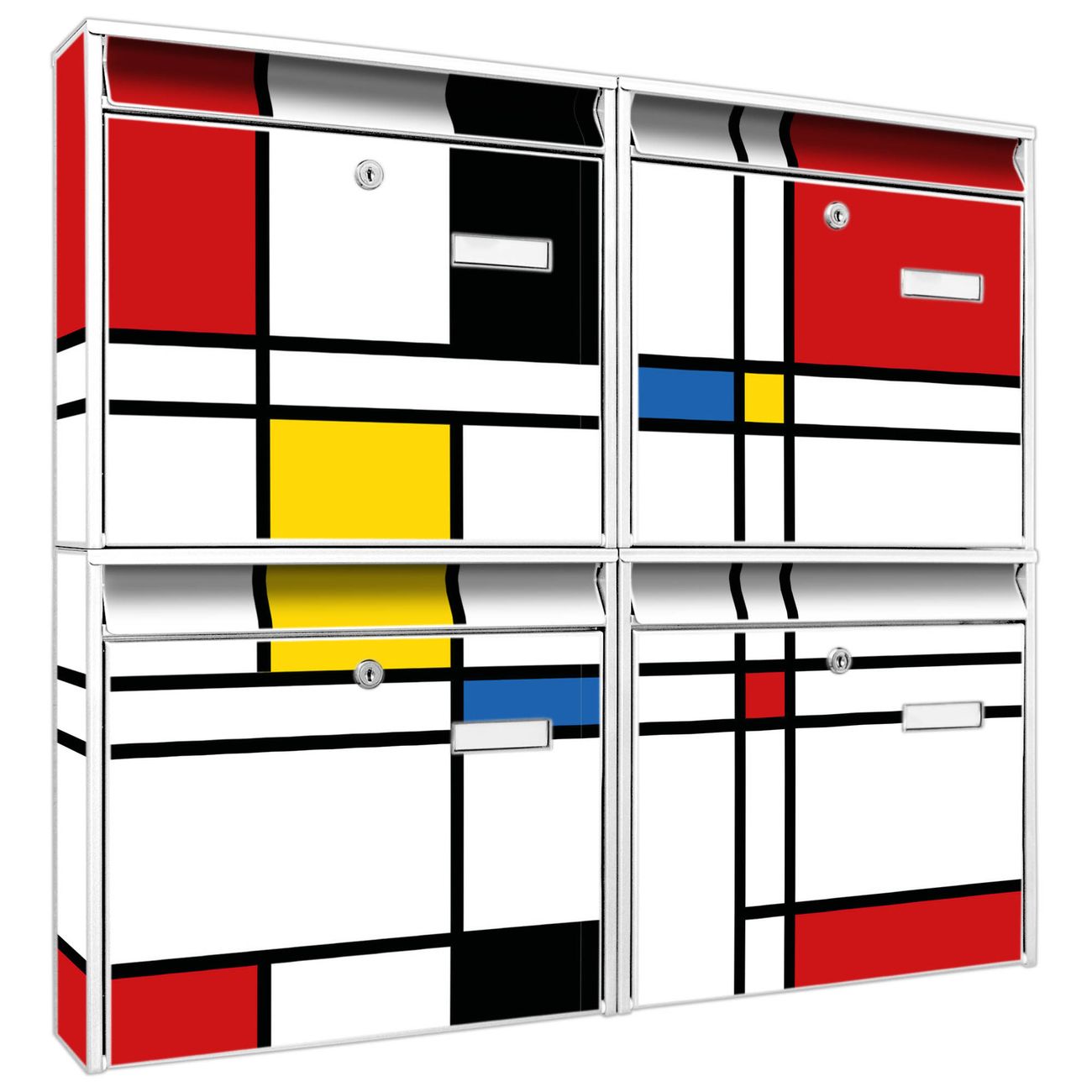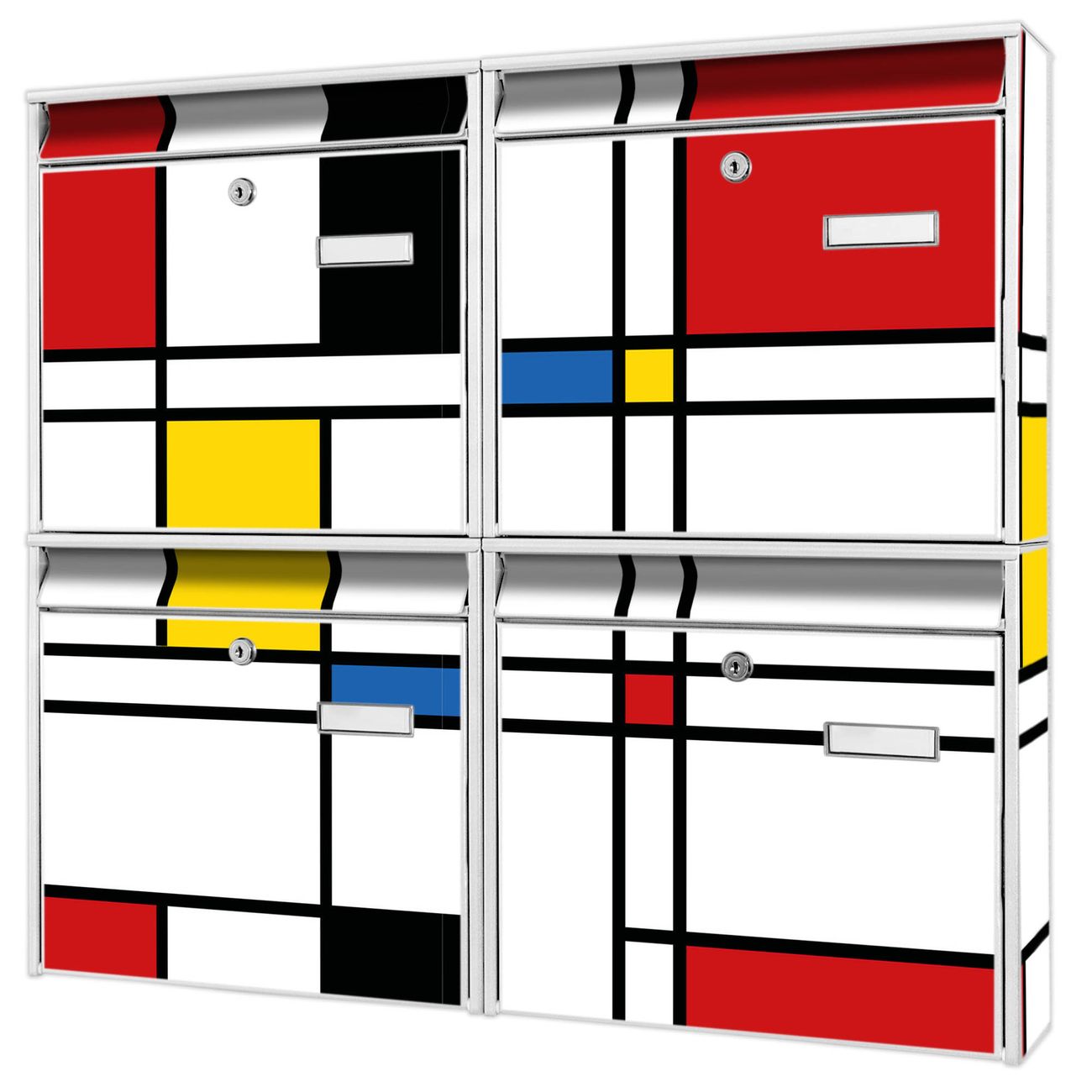 FUNKTION: Die Burg-Wächter Briefkastenanlage mit Motiv Rot Gelb Blau bietet Ihnen ausreichend Fassungsvermögen um auch A4 und C4 Sendungen zu empfangen. Das integrierte Namensschild lässt sich individuell beschriften. Wählen Sie aus den Grundfarben weiß, silber und schwarz. DESIGN: Die 4 Briefkästen haben ein ansprechendes und zeitloses Design, ohne dabei auf Funktionalität zu verzichten. Das Material ist sehr stabil, wetterfest und rostfrei. Durch das Motiv Rot Gelb Blau werden die Postkästen zu einem Blickfang. DETAILS: Die Postkästen bestehen aus verzinktem Stahl der zusätzlich mit Klarlack versiegelt wurde. Die Kästen sind gesamt 64,5cm hoch, 72,5cm breit und 10cm tief. Das Motiv besteht aus einer wetter- und UV-festen Folie, die Ihren Briefkasten zusätzlich vor Kratzern schützt. Die Postkästen werden mit Montagematerial, je einem Namensschild und je zwei Schlüsseln geliefert. NUTZEN: Das Briefkastenset eignet sich für die Wandmontage, die Größe bietet genügend Platz für Sendungen aller Art. Das zeitlose Design sowie die stabile Bauart bieten Ihnen einen treuen Begleiter für Ihre Post. BANJADO: