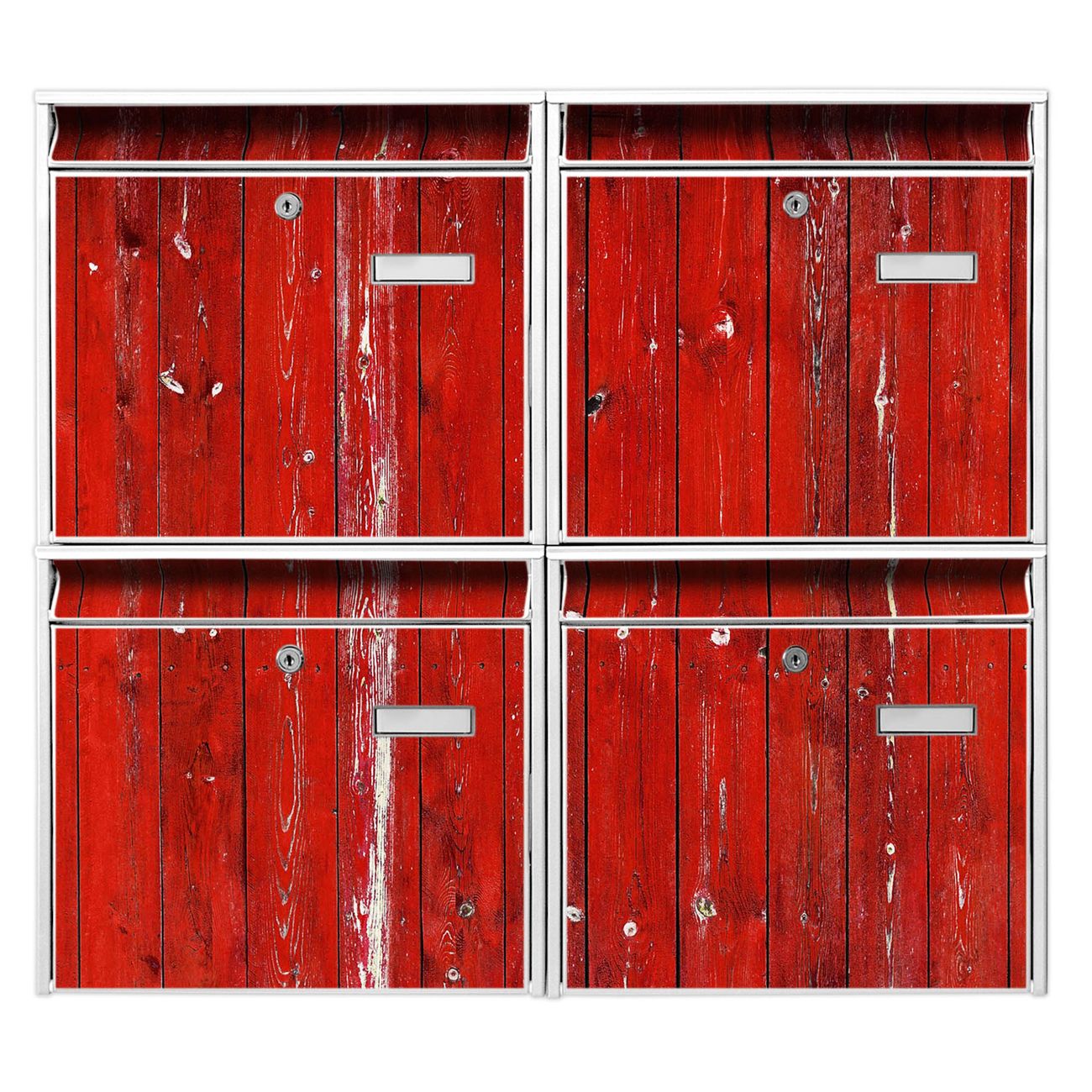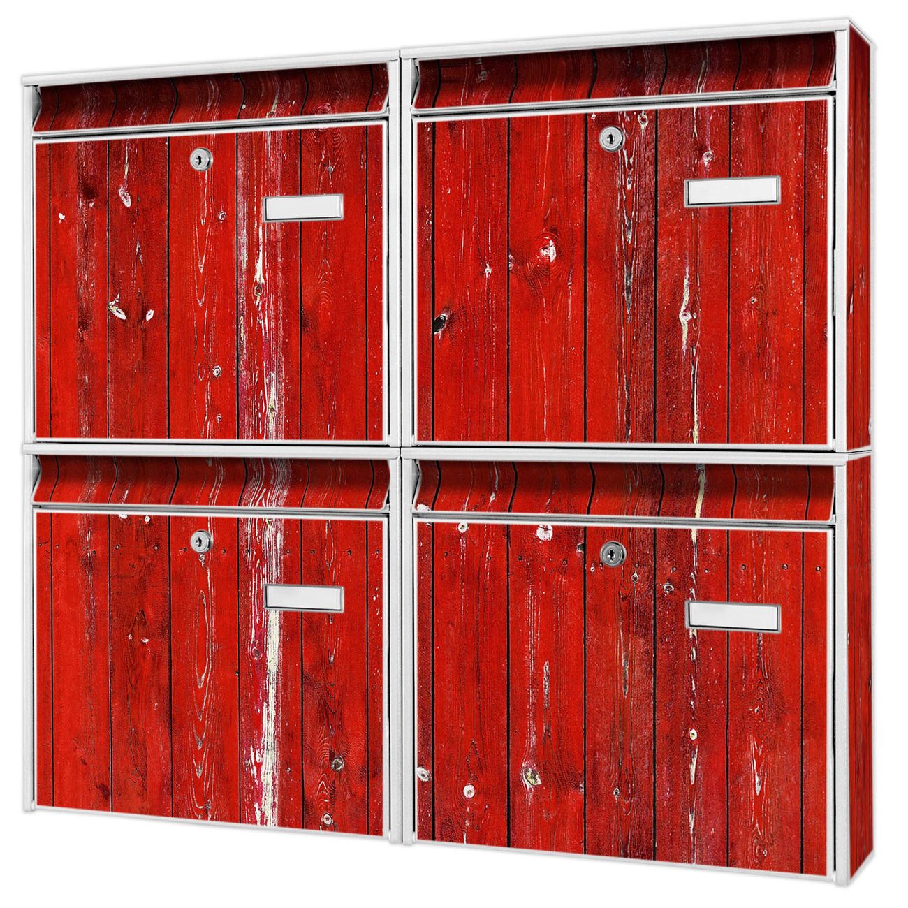 FUNKTION: Die Burg-Wächter Briefkastenanlage mit Motiv Rote Holzlatten bietet Ihnen ausreichend Fassungsvermögen um auch A4 und C4 Sendungen zu empfangen. Das integrierte Namensschild lässt sich individuell beschriften. Wählen Sie aus den Grundfarben weiß, silber und schwarz. DESIGN: Die 4 Briefkästen haben ein ansprechendes und zeitloses Design, ohne dabei auf Funktionalität zu verzichten. Das Material ist sehr stabil, wetterfest und rostfrei. Durch das Motiv Rote Holzlatten werden die Postkästen zu einem Blickfang. DETAILS: Die Postkästen bestehen aus verzinktem Stahl der zusätzlich mit Klarlack versiegelt wurde. Die Kästen sind gesamt 64,5cm hoch, 72,5cm breit und 10cm tief. Das Motiv besteht aus einer wetter- und UV-festen Folie, die Ihren Briefkasten zusätzlich vor Kratzern schützt. Die Postkästen werden mit Montagematerial, je einem Namensschild und je zwei Schlüsseln geliefert. NUTZEN: Das Briefkastenset eignet sich für die Wandmontage, die Größe bietet genügend Platz für Sendungen aller Art. Das zeitlose Design sowie die stabile Bauart bieten Ihnen einen treuen Begleiter für Ihre Post. BANJADO:
