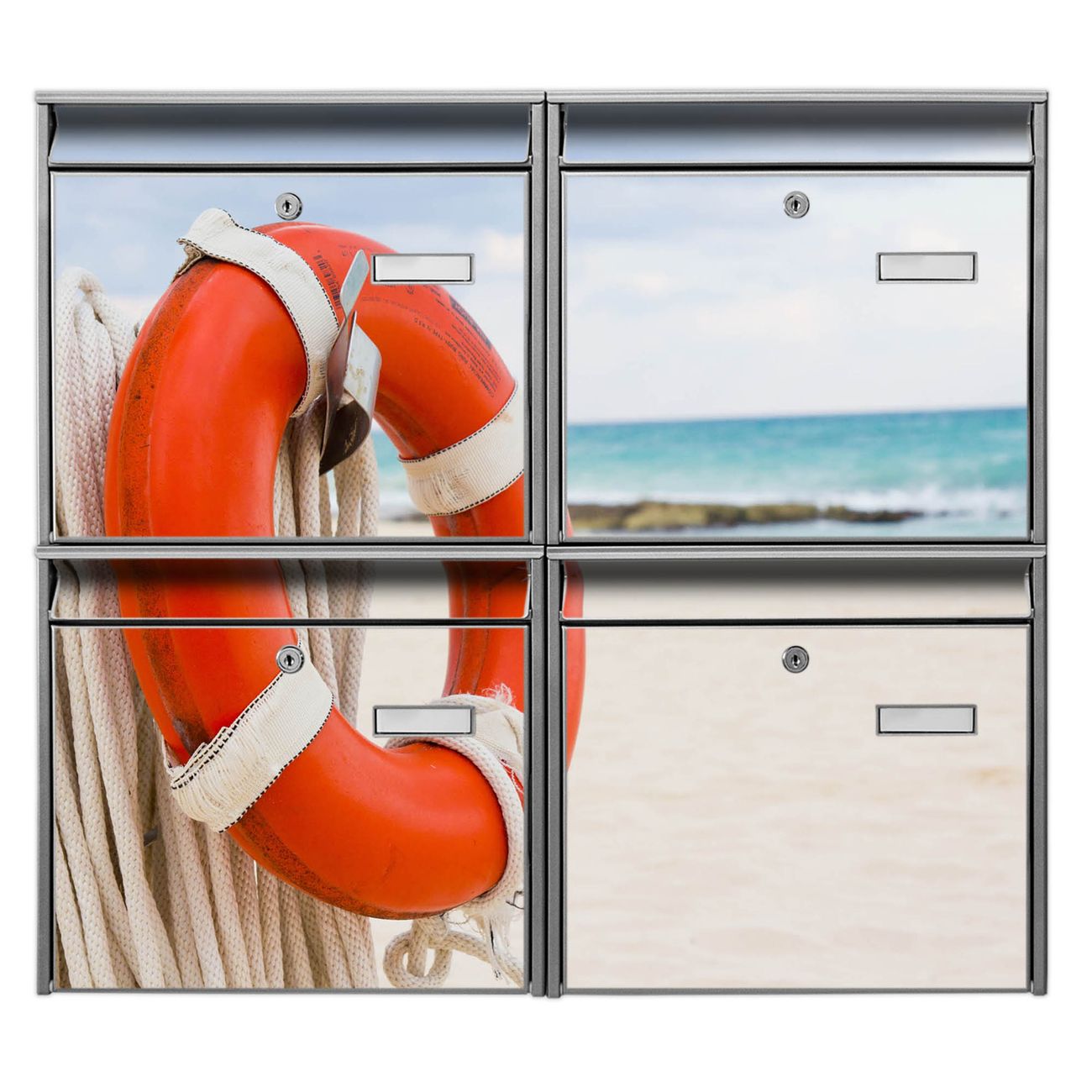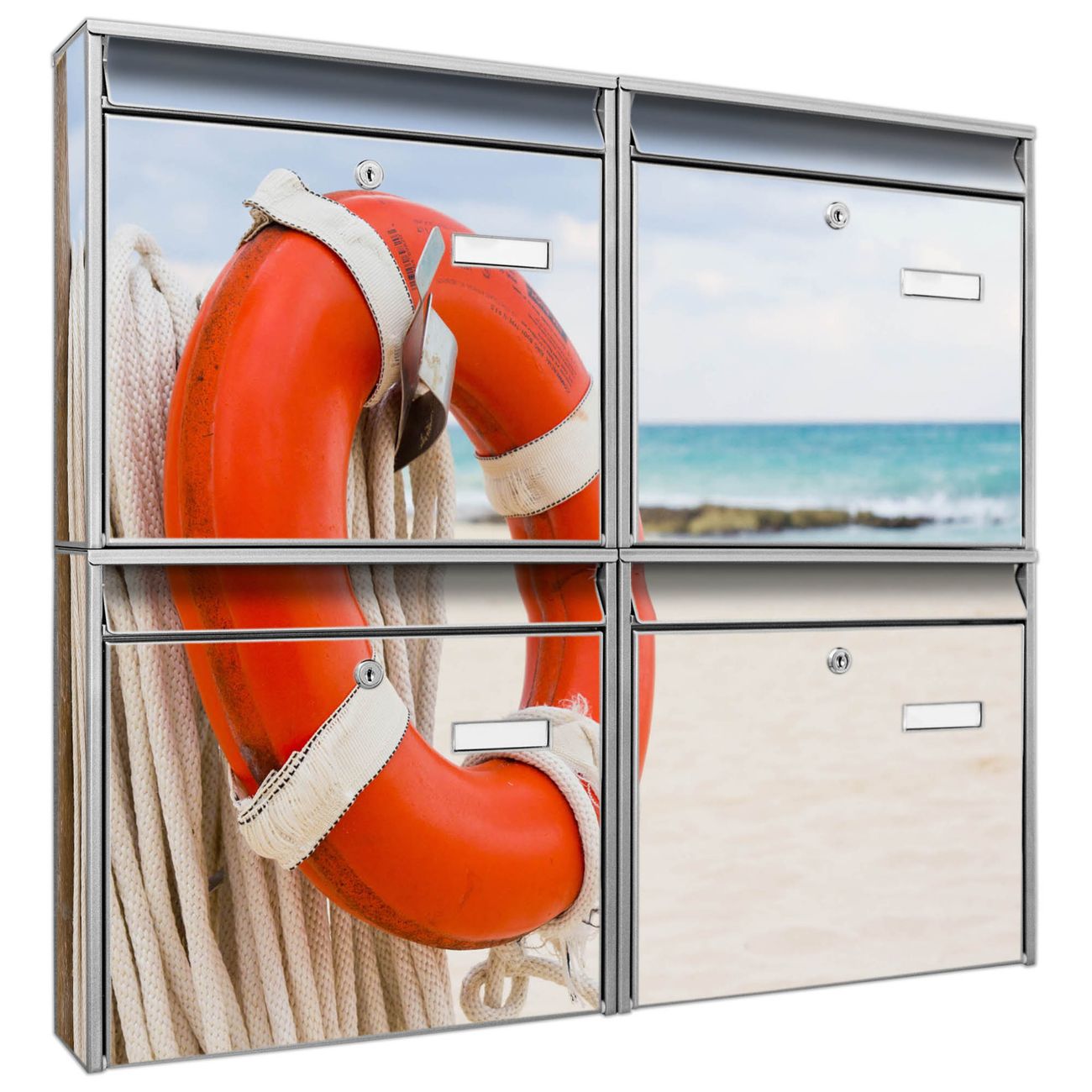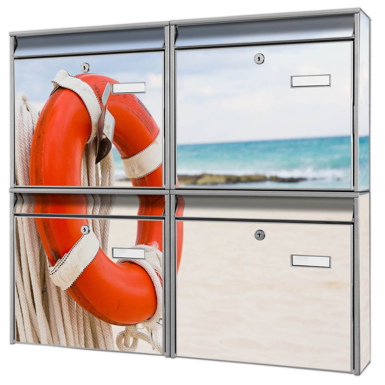 FUNKTION: Die Burg-Wächter Briefkastenanlage mit Motiv Roter Rettungsring bietet Ihnen ausreichend Fassungsvermögen um auch A4 und C4 Sendungen zu empfangen. Das integrierte Namensschild lässt sich individuell beschriften. Wählen Sie aus den Grundfarben weiß, silber und schwarz. DESIGN: Die 4 Briefkästen haben ein ansprechendes und zeitloses Design, ohne dabei auf Funktionalität zu verzichten. Das Material ist sehr stabil, wetterfest und rostfrei. Durch das Motiv Roter Rettungsring werden die Postkästen zu einem Blickfang. DETAILS: Die Postkästen bestehen aus verzinktem Stahl der zusätzlich mit Klarlack versiegelt wurde. Die Kästen sind gesamt 64,5cm hoch, 72,5cm breit und 10cm tief. Das Motiv besteht aus einer wetter- und UV-festen Folie, die Ihren Briefkasten zusätzlich vor Kratzern schützt. Die Postkästen werden mit Montagematerial, je einem Namensschild und je zwei Schlüsseln geliefert. NUTZEN: Das Briefkastenset eignet sich für die Wandmontage, die Größe bietet genügend Platz für Sendungen aller Art. Das zeitlose Design sowie die stabile Bauart bieten Ihnen einen treuen Begleiter für Ihre Post. BANJADO: