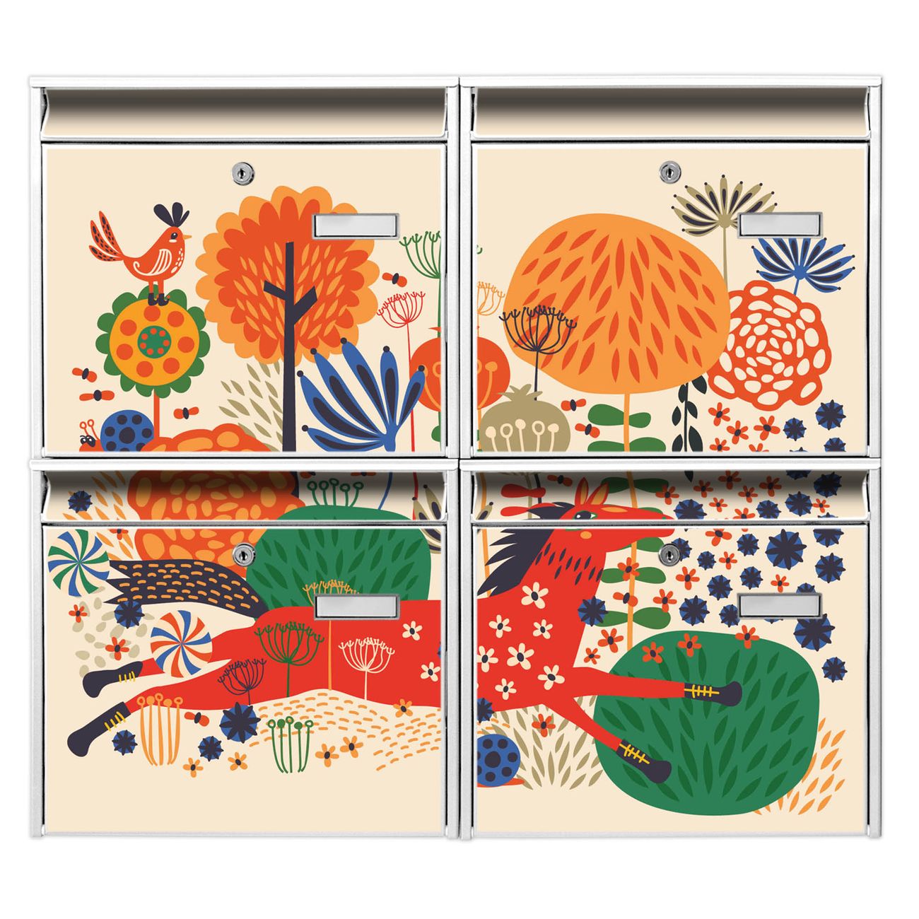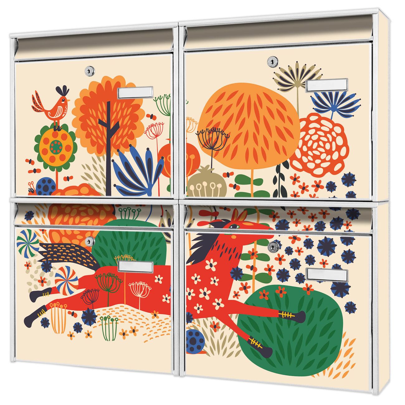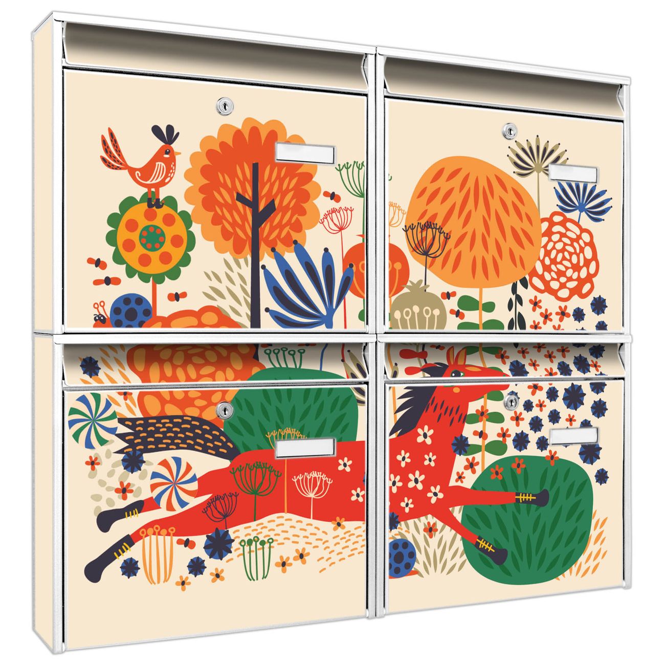 FUNKTION: Die Burg-Wächter Briefkastenanlage mit Motiv Rotes Pferd bietet Ihnen ausreichend Fassungsvermögen um auch A4 und C4 Sendungen zu empfangen. Das integrierte Namensschild lässt sich individuell beschriften. Wählen Sie aus den Grundfarben weiß, silber und schwarz. DESIGN: Die 4 Briefkästen haben ein ansprechendes und zeitloses Design, ohne dabei auf Funktionalität zu verzichten. Das Material ist sehr stabil, wetterfest und rostfrei. Durch das Motiv Rotes Pferd werden die Postkästen zu einem Blickfang. DETAILS: Die Postkästen bestehen aus verzinktem Stahl der zusätzlich mit Klarlack versiegelt wurde. Die Kästen sind gesamt 64,5cm hoch, 72,5cm breit und 10cm tief. Das Motiv besteht aus einer wetter- und UV-festen Folie, die Ihren Briefkasten zusätzlich vor Kratzern schützt. Die Postkästen werden mit Montagematerial, je einem Namensschild und je zwei Schlüsseln geliefert. NUTZEN: Das Briefkastenset eignet sich für die Wandmontage, die Größe bietet genügend Platz für Sendungen aller Art. Das zeitlose Design sowie die stabile Bauart bieten Ihnen einen treuen Begleiter für Ihre Post. BANJADO: