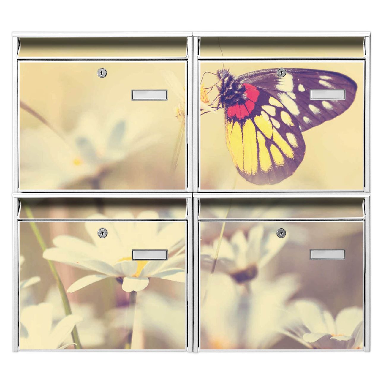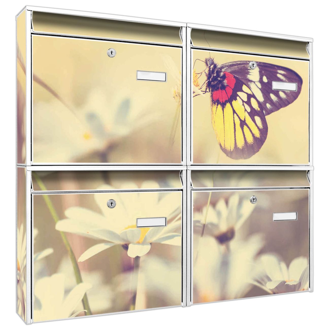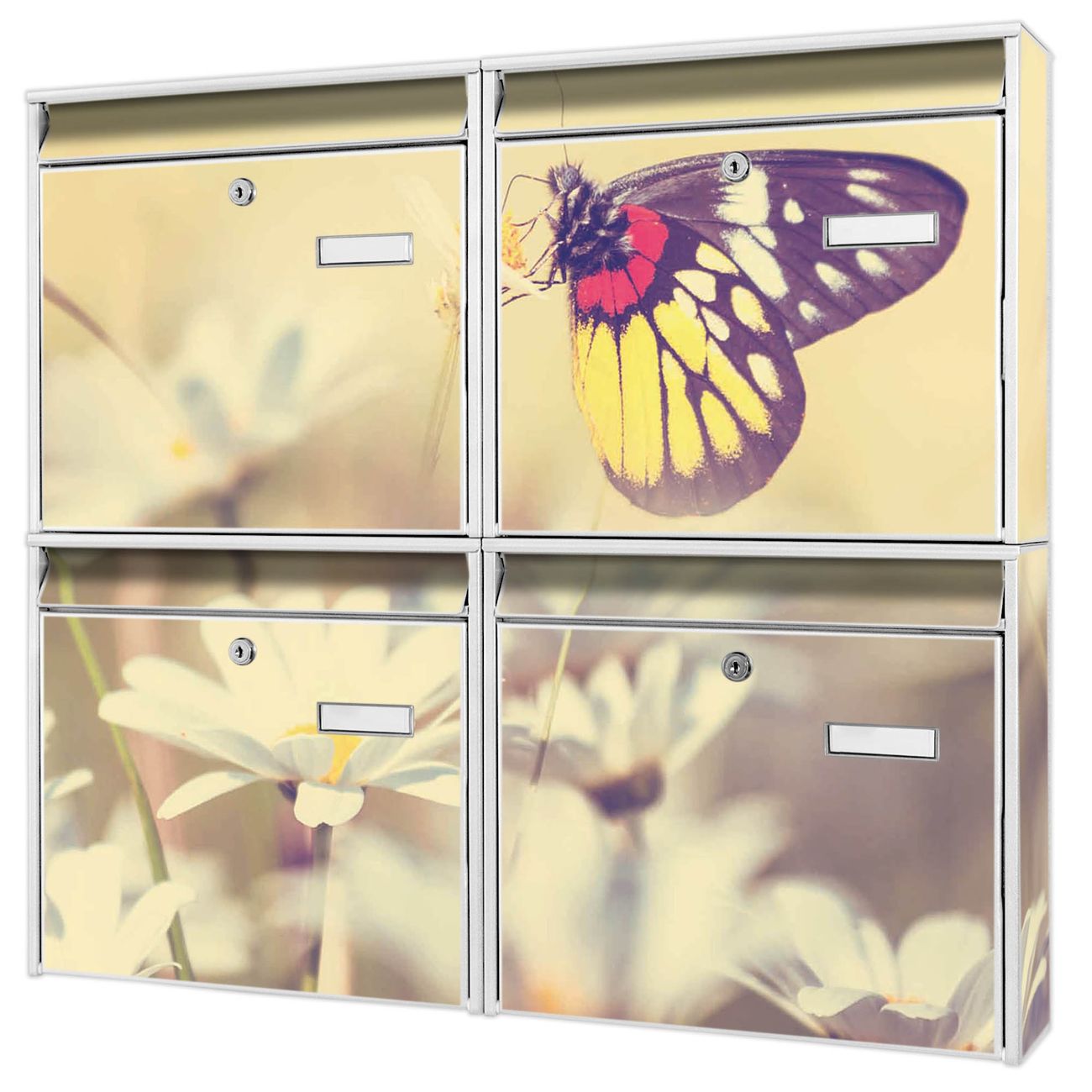 FUNKTION: Die Burg-Wächter Briefkastenanlage mit Motiv Rotgelber Falter bietet Ihnen ausreichend Fassungsvermögen um auch A4 und C4 Sendungen zu empfangen. Das integrierte Namensschild lässt sich individuell beschriften. Wählen Sie aus den Grundfarben weiß, silber und schwarz. DESIGN: Die 4 Briefkästen haben ein ansprechendes und zeitloses Design, ohne dabei auf Funktionalität zu verzichten. Das Material ist sehr stabil, wetterfest und rostfrei. Durch das Motiv Rotgelber Falter werden die Postkästen zu einem Blickfang. DETAILS: Die Postkästen bestehen aus verzinktem Stahl der zusätzlich mit Klarlack versiegelt wurde. Die Kästen sind gesamt 64,5cm hoch, 72,5cm breit und 10cm tief. Das Motiv besteht aus einer wetter- und UV-festen Folie, die Ihren Briefkasten zusätzlich vor Kratzern schützt. Die Postkästen werden mit Montagematerial, je einem Namensschild und je zwei Schlüsseln geliefert. NUTZEN: Das Briefkastenset eignet sich für die Wandmontage, die Größe bietet genügend Platz für Sendungen aller Art. Das zeitlose Design sowie die stabile Bauart bieten Ihnen einen treuen Begleiter für Ihre Post. BANJADO: