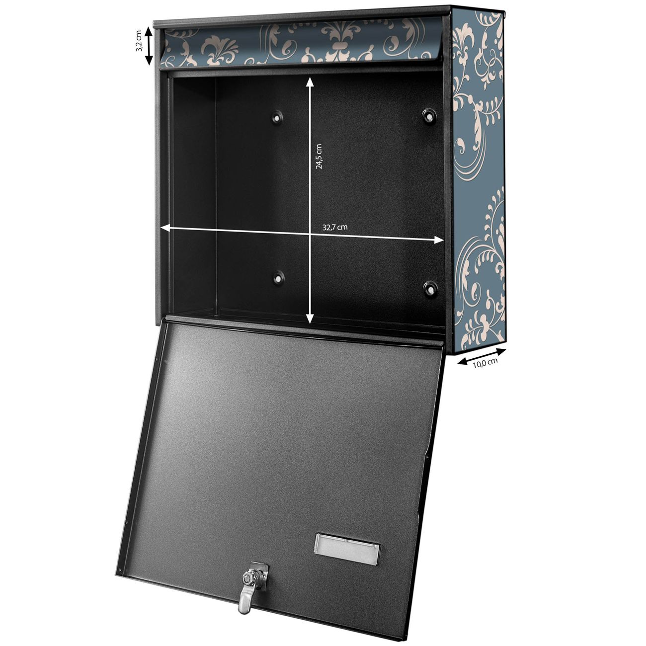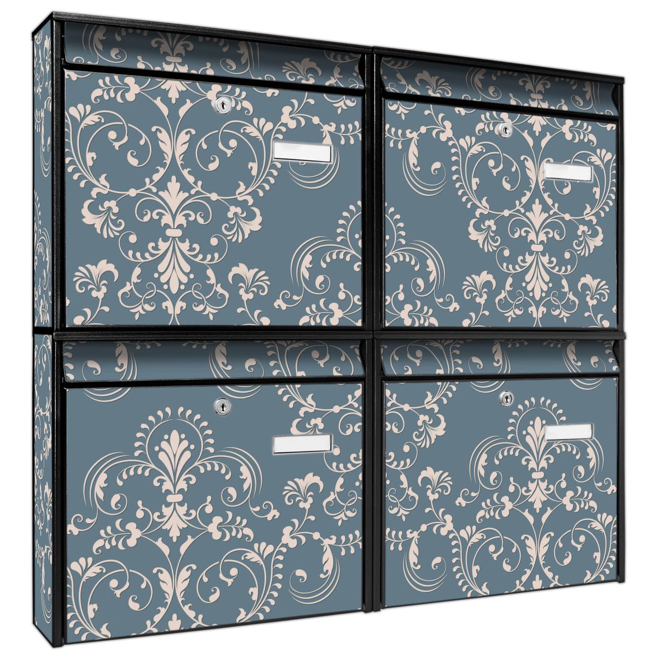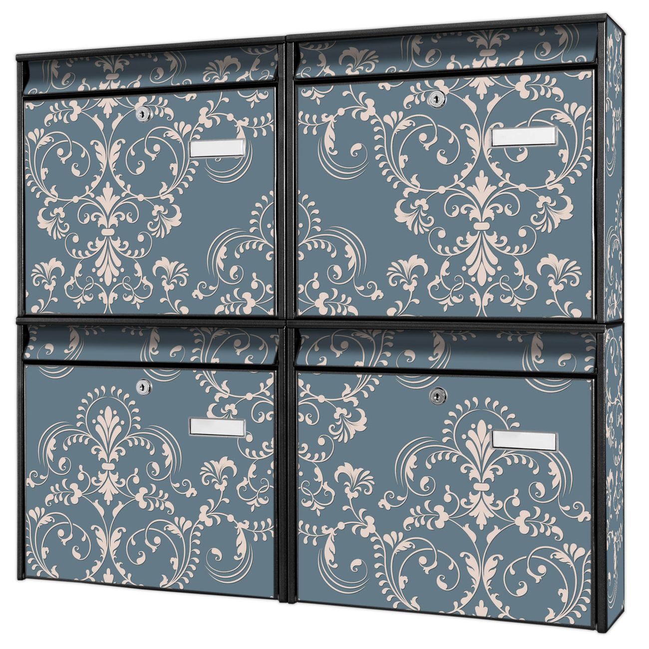FUNKTION: Die Burg-Wächter Briefkastenanlage mit Motiv Royal Creme Blau bietet Ihnen ausreichend Fassungsvermögen um auch A4 und C4 Sendungen zu empfangen. Das integrierte Namensschild lässt sich individuell beschriften. Wählen Sie aus den Grundfarben weiß, silber und schwarz. DESIGN: Die 4 Briefkästen haben ein ansprechendes und zeitloses Design, ohne dabei auf Funktionalität zu verzichten. Das Material ist sehr stabil, wetterfest und rostfrei. Durch das Motiv Royal Creme Blau werden die Postkästen zu einem Blickfang. DETAILS: Die Postkästen bestehen aus verzinktem Stahl der zusätzlich mit Klarlack versiegelt wurde. Die Kästen sind gesamt 64,5cm hoch, 72,5cm breit und 10cm tief. Das Motiv besteht aus einer wetter- und UV-festen Folie, die Ihren Briefkasten zusätzlich vor Kratzern schützt. Die Postkästen werden mit Montagematerial, je einem Namensschild und je zwei Schlüsseln geliefert. NUTZEN: Das Briefkastenset eignet sich für die Wandmontage, die Größe bietet genügend Platz für Sendungen aller Art. Das zeitlose Design sowie die stabile Bauart bieten Ihnen einen treuen Begleiter für Ihre Post. BANJADO: