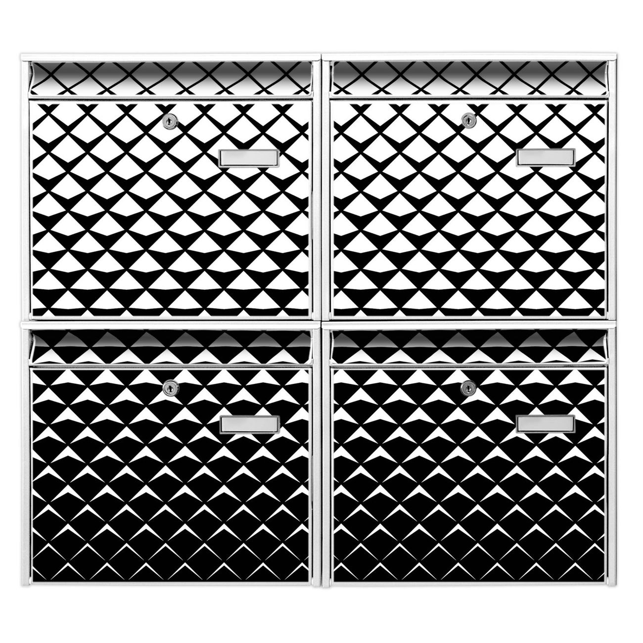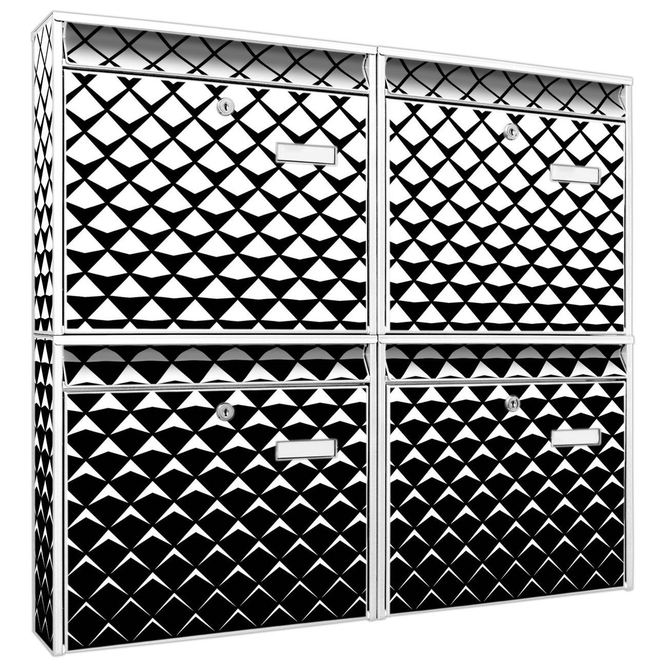 FUNKTION: Die Burg-Wächter Briefkastenanlage mit Motiv Schattierung bietet Ihnen ausreichend Fassungsvermögen um auch A4 und C4 Sendungen zu empfangen. Das integrierte Namensschild lässt sich individuell beschriften. Wählen Sie aus den Grundfarben weiß, silber und schwarz. DESIGN: Die 4 Briefkästen haben ein ansprechendes und zeitloses Design, ohne dabei auf Funktionalität zu verzichten. Das Material ist sehr stabil, wetterfest und rostfrei. Durch das Motiv Schattierung werden die Postkästen zu einem Blickfang. DETAILS: Die Postkästen bestehen aus verzinktem Stahl der zusätzlich mit Klarlack versiegelt wurde. Die Kästen sind gesamt 64,5cm hoch, 72,5cm breit und 10cm tief. Das Motiv besteht aus einer wetter- und UV-festen Folie, die Ihren Briefkasten zusätzlich vor Kratzern schützt. Die Postkästen werden mit Montagematerial, je einem Namensschild und je zwei Schlüsseln geliefert. NUTZEN: Das Briefkastenset eignet sich für die Wandmontage, die Größe bietet genügend Platz für Sendungen aller Art. Das zeitlose Design sowie die stabile Bauart bieten Ihnen einen treuen Begleiter für Ihre Post. BANJADO: