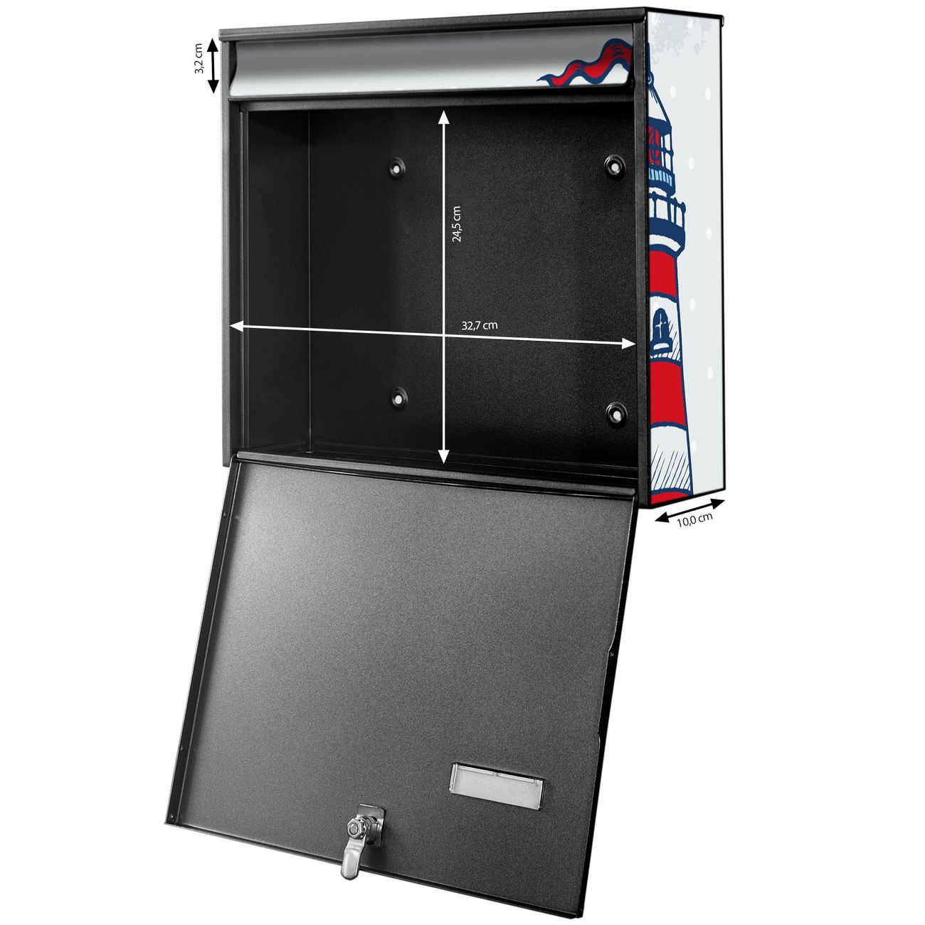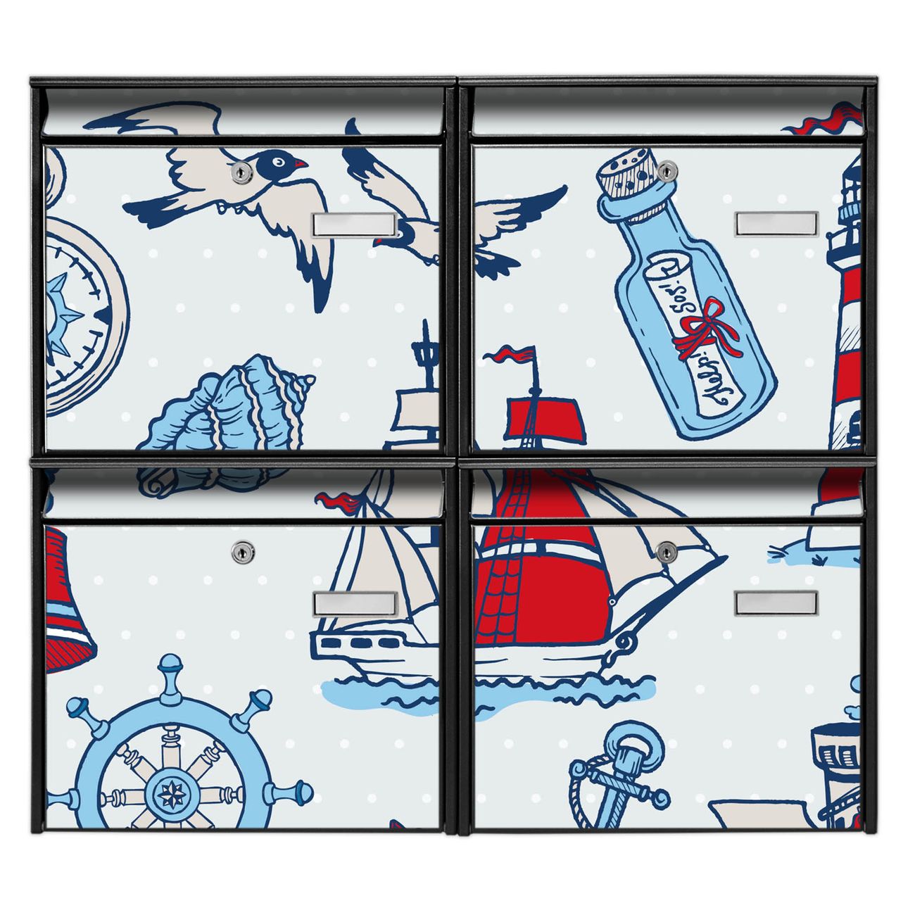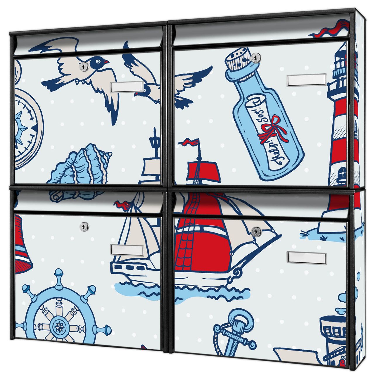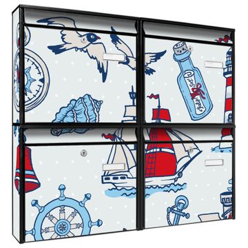 FUNKTION: Die Burg-Wächter Briefkastenanlage mit Motiv Schiff Ahoj bietet Ihnen ausreichend Fassungsvermögen um auch A4 und C4 Sendungen zu empfangen. Das integrierte Namensschild lässt sich individuell beschriften. Wählen Sie aus den Grundfarben weiß, silber und schwarz. DESIGN: Die 4 Briefkästen haben ein ansprechendes und zeitloses Design, ohne dabei auf Funktionalität zu verzichten. Das Material ist sehr stabil, wetterfest und rostfrei. Durch das Motiv Schiff Ahoj werden die Postkästen zu einem Blickfang. DETAILS: Die Postkästen bestehen aus verzinktem Stahl der zusätzlich mit Klarlack versiegelt wurde. Die Kästen sind gesamt 64,5cm hoch, 72,5cm breit und 10cm tief. Das Motiv besteht aus einer wetter- und UV-festen Folie, die Ihren Briefkasten zusätzlich vor Kratzern schützt. Die Postkästen werden mit Montagematerial, je einem Namensschild und je zwei Schlüsseln geliefert. NUTZEN: Das Briefkastenset eignet sich für die Wandmontage, die Größe bietet genügend Platz für Sendungen aller Art. Das zeitlose Design sowie die stabile Bauart bieten Ihnen einen treuen Begleiter für Ihre Post. BANJADO: