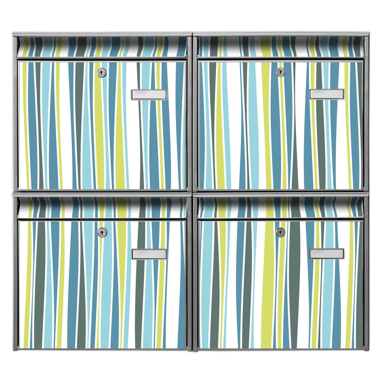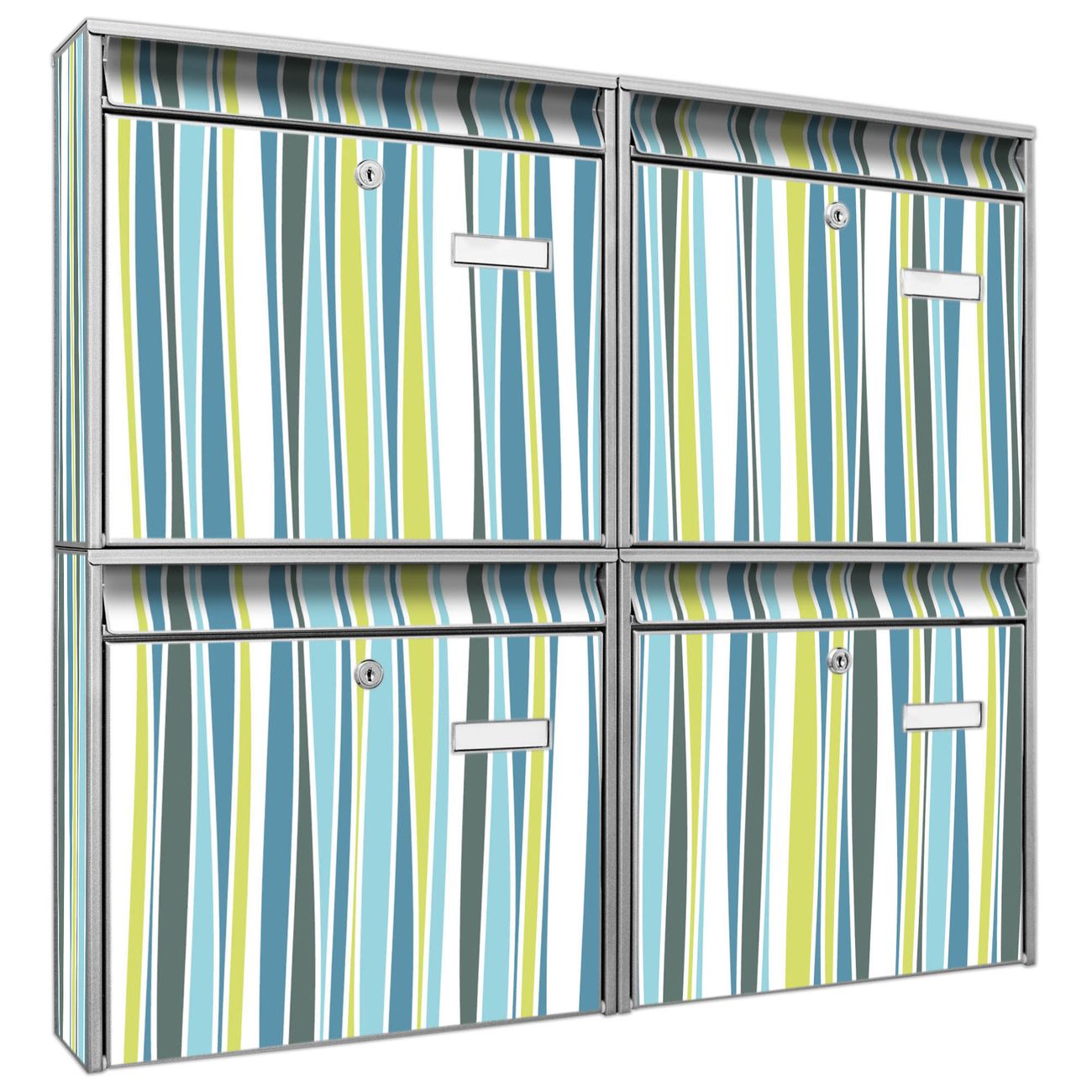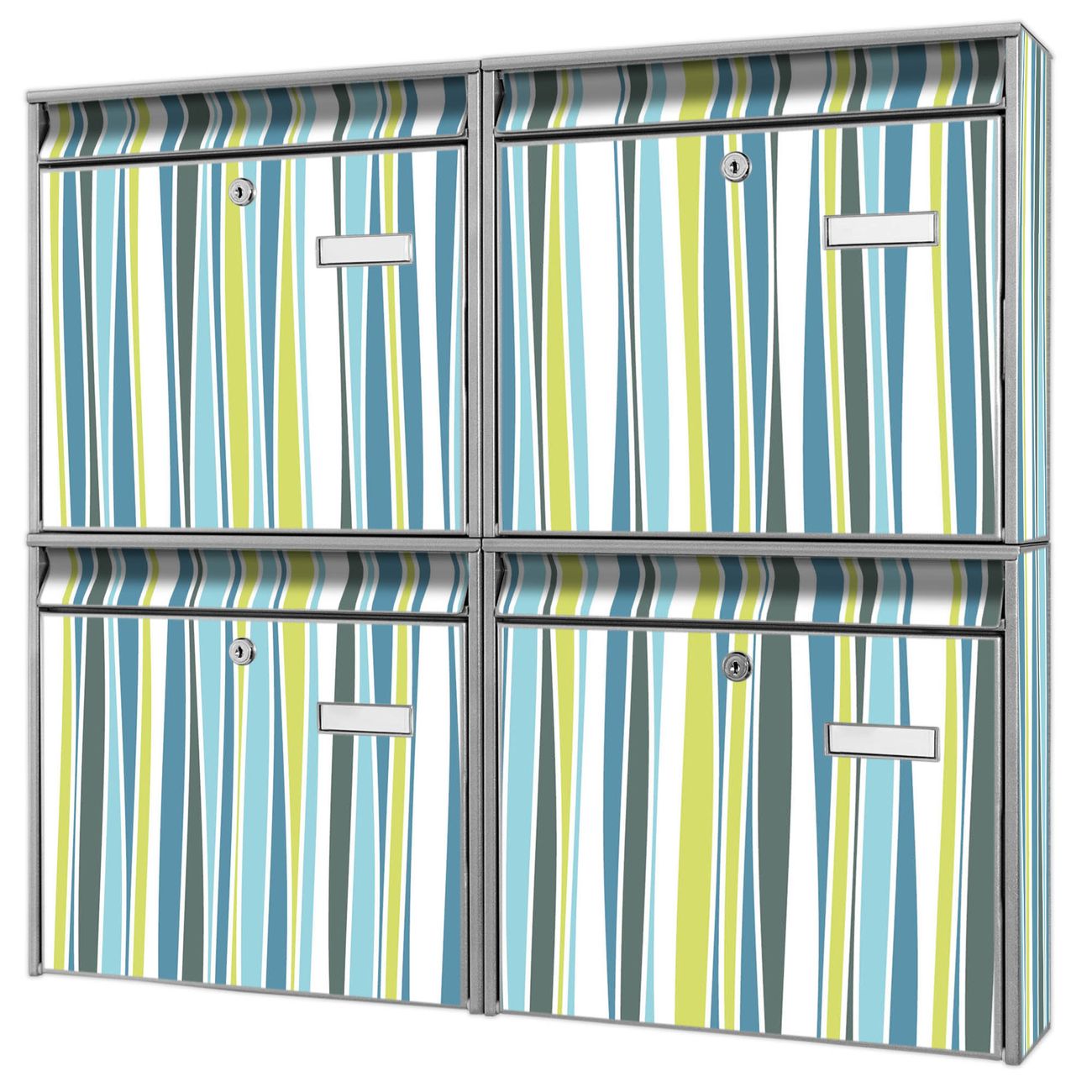 FUNKTION: Die Burg-Wächter Briefkastenanlage mit Motiv Schilf Abstrakt bietet Ihnen ausreichend Fassungsvermögen um auch A4 und C4 Sendungen zu empfangen. Das integrierte Namensschild lässt sich individuell beschriften. Wählen Sie aus den Grundfarben weiß, silber und schwarz. DESIGN: Die 4 Briefkästen haben ein ansprechendes und zeitloses Design, ohne dabei auf Funktionalität zu verzichten. Das Material ist sehr stabil, wetterfest und rostfrei. Durch das Motiv Schilf Abstrakt werden die Postkästen zu einem Blickfang. DETAILS: Die Postkästen bestehen aus verzinktem Stahl der zusätzlich mit Klarlack versiegelt wurde. Die Kästen sind gesamt 64,5cm hoch, 72,5cm breit und 10cm tief. Das Motiv besteht aus einer wetter- und UV-festen Folie, die Ihren Briefkasten zusätzlich vor Kratzern schützt. Die Postkästen werden mit Montagematerial, je einem Namensschild und je zwei Schlüsseln geliefert. NUTZEN: Das Briefkastenset eignet sich für die Wandmontage, die Größe bietet genügend Platz für Sendungen aller Art. Das zeitlose Design sowie die stabile Bauart bieten Ihnen einen treuen Begleiter für Ihre Post. BANJADO: